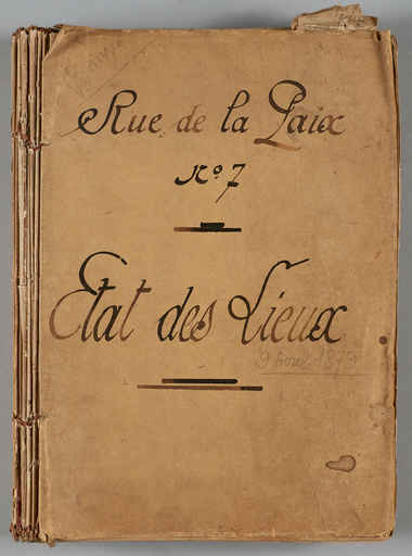 Ce manuscrit appartenait à l’architecte Max Alers (1906-2001), dont les notes au crayon laissent supposer qu’il fut un temps chargé de l’entretien du bâtiment, mais rien n’est attesté et ses descendants font l’hypothèse d’une trouvaille en brocante ou d’un ami lui-même architecte qui lui aurait donné ce document. Informées du projet de l’exposition Worth, Inventer la haute couture au Petit Palais, Isabelle Bouju, fille de Max Alers et sa petite-fille Marie-Cécile Bouju, ont souhaité donner au Palais Galliera, musée de la mode de Paris, le précieux manuscrit entré dans les collections le 19 janvier 2024. L’archive, datée entre 1859 et 1879, décrit l’installation progressive dans l’Hôtel particulier de ces éminents locataires. Ce manuscrit inédit témoigne de l’ascension fulgurante de la maison de couture fondée en 1858 par l’anglais Charles Frédérick Worth (1825-1895) et son associé suédois Otto Gustav Bobergh. Au terme de leur collaboration en 1870, seule la signature de Worth figure sur les fascicules successifs de l’état des lieux. La maison de couture, dont la vitrine se déployait au rez-de-chaussée, les salons au premier étage et les nombreux ateliers dans les niveaux supérieurs, occupera l’immeuble jusqu’en 1935. La description des éléments architecturaux, élévations, matériaux de construction, escaliers, cours, détails de chacune des pièces, laissent à l’imagination du lecteur le soin de reconstituer l’immensité du lieu, le décorum et l’organisation fonctionnelle de cet immeuble construit en 1851. L’archive atteste d’un patrimoine bâti représentatif de l’architecture du milieu du 19ème siècle dans ce quartier de la capitale où s’installeront les plus prestigieuses enseignes. L’implantation de la maison Worth au 7, rue de la Paix, ouvre la voie au développement d’une artère parisienne luxueuse où s’établiront les maisons Boué Sœurs, Cartier, Paquin, Doucet et Chéruit parmi les plus illustres.
