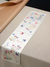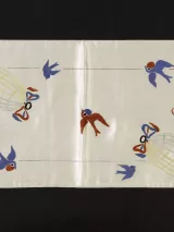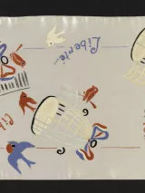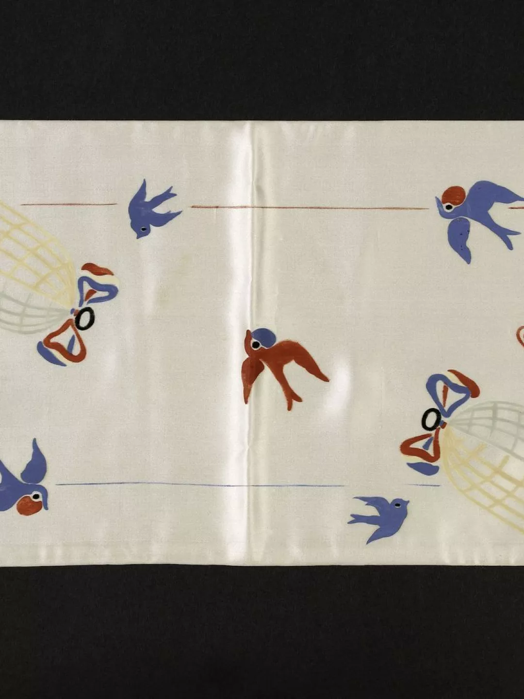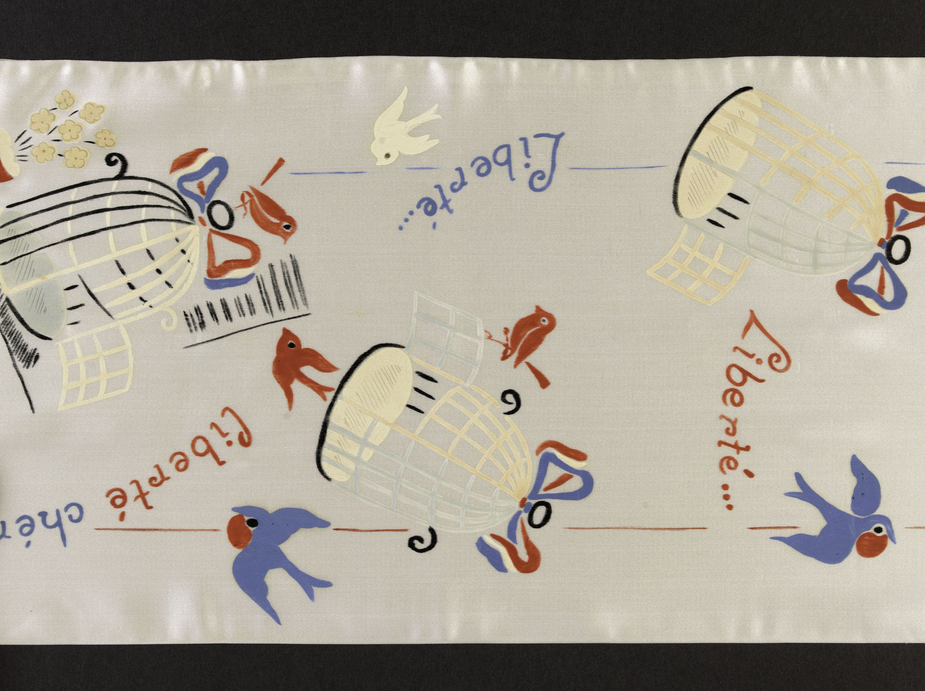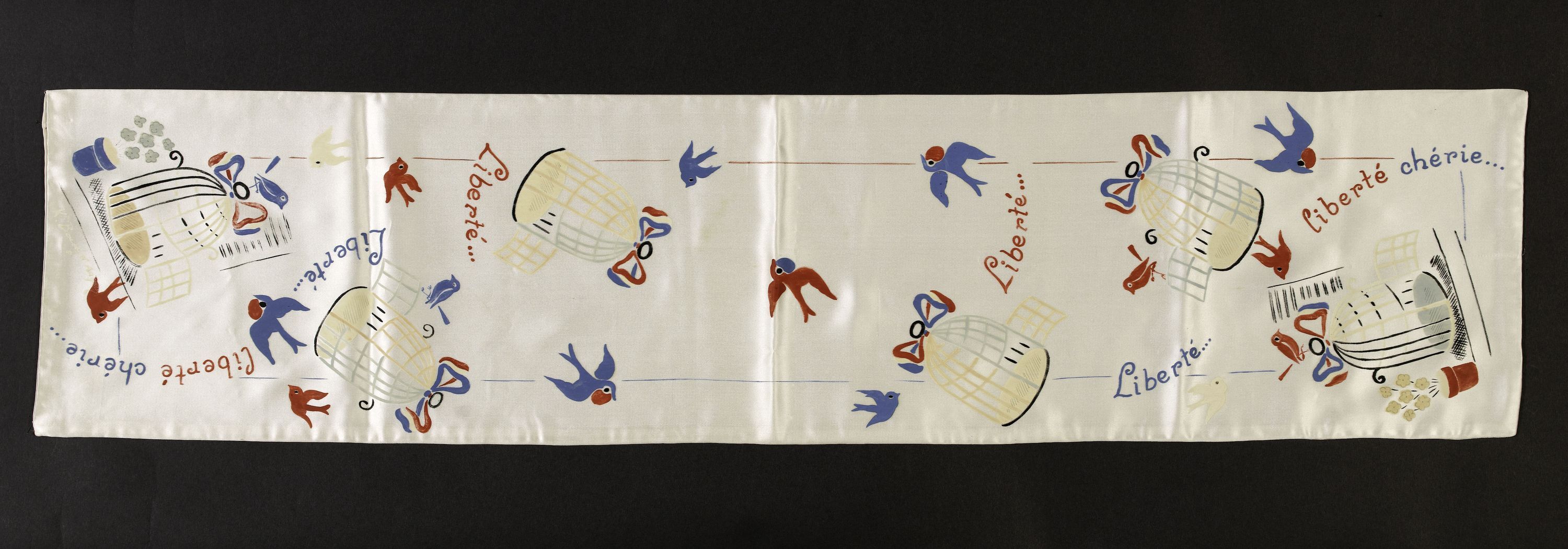 L’accessoire se fait parfois symbole et porte en lui une part d’histoire. Cette écharpe de Jeanne Lanvin apparaît ainsi comme un emblème de la libération de Paris. Les archives du musée Carnavalet, dont est issue une partie des collections du Palais Galliera, ont permis d’identifier la provenance de l’objet. Dans un courrier daté du 21 février 1945, François Boucher, conservateur du musée de l’Histoire de Paris, remercie la maison Lanvin d’avoir offert une écharpe « Liberté chérie » et un clip en perles tricolores, qui avaient été prêtés lors de l’exposition « Libération de Paris », du 11 novembre au 31 décembre 1944. Ces pièces illustraient la partie « mode et décoration », témoins, au côté des insignes, mouchoirs, articles de parure et bibelots divers, d’une production massive d’objets aux couleurs françaises et alliées, souvent réalisés en cachette en prévision de la libération de la capitale. La maison Lanvin avait également prêté, à cette occasion, un mannequin criblé de balles à travers la vitrine de la boutique, le 25 août 1944, en témoignage de la violence des combats. L’écharpe de Lanvin célèbre la liberté retrouvée, tant par ses couleurs patriotiques que par son iconographie prégnante. Pendant l’Occupation, la thématique de l’oiseau en cage, symbole de l’oppression, apparaît dans les créations emblématiques du joaillier Cartier, qui décline une série de broches. À la Libération, la cage s’ouvre et l’oiseau s’échappe, chez Cartier, mais aussi chez Van Cleef & Arpels ou Line Vautrin. Du bijou, le sujet gagne d’autres accessoires, comme l’écharpe imaginée par Jeanne Lanvin.