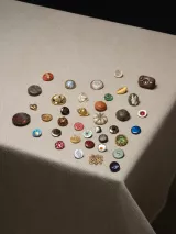 François Hugo est avant tout connu comme l’orfèvre de prestigieux artistes du XXe siècle : Jean Cocteau, Max Ernst, Jean Arp ou André Derain. Dès 1953, il entame une intense collaboration avec Pablo Picasso, pour lequel il produit nombre de plats et de compotiers. Toutefois, Hugo est également un artiste remarquable pour ses bijoux – créés en particulier, dès la fin des années 1920, pour Gabrielle Chanel – et pour ses boutons destinés à la haute couture. Cette dernière activité débute en 1940 lorsque, suite à sa démobilisation, Hugo s’installe à Cannes où la plupart des maisons de couture possèdent une succursale. Il poursuit sa production à son retour à Paris, en 1942, et propose quatre collections par an aux plus grands : Balmain, Bruyère, Dior, Fath, Lanvin, Lelong, Paquin, Piguet, Rochas ou Worth. François Hugo entretient une relation privilégiée avec Elsa Schiaparelli, comme en témoigne sa femme Monique lors d’une interview rapportée par Loïc Allio dans son ouvrage Boutons : « C’était une fidèle amie, la fantaisie même, une femme tout à fait charmante. Pour Dior, c’était du classique, alors que pour Schiap, c’était plus extravagant. » Entre 1940 et 1952, il imagine mille six cent quatre-vingt-onze modèles de boutons, admirables par la variété des matériaux (céramique, cuir, bois, pierre dure, émail, argent, miroir, nacre, Plexiglas, papier…) comme par l’audace des motifs, à l’image d’un exemplaire marqué d’une empreinte digitale noire sur un fond blanc. Grâce à la remarquable donation faite par Pierre Hugo, fils de François, en 2021, le Palais Galliera compte désormais un exceptionnel ensemble de neuf cent vingt-cinq boutons de l’artiste étroitement lié à l’univers de la mode.