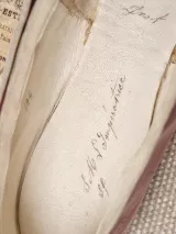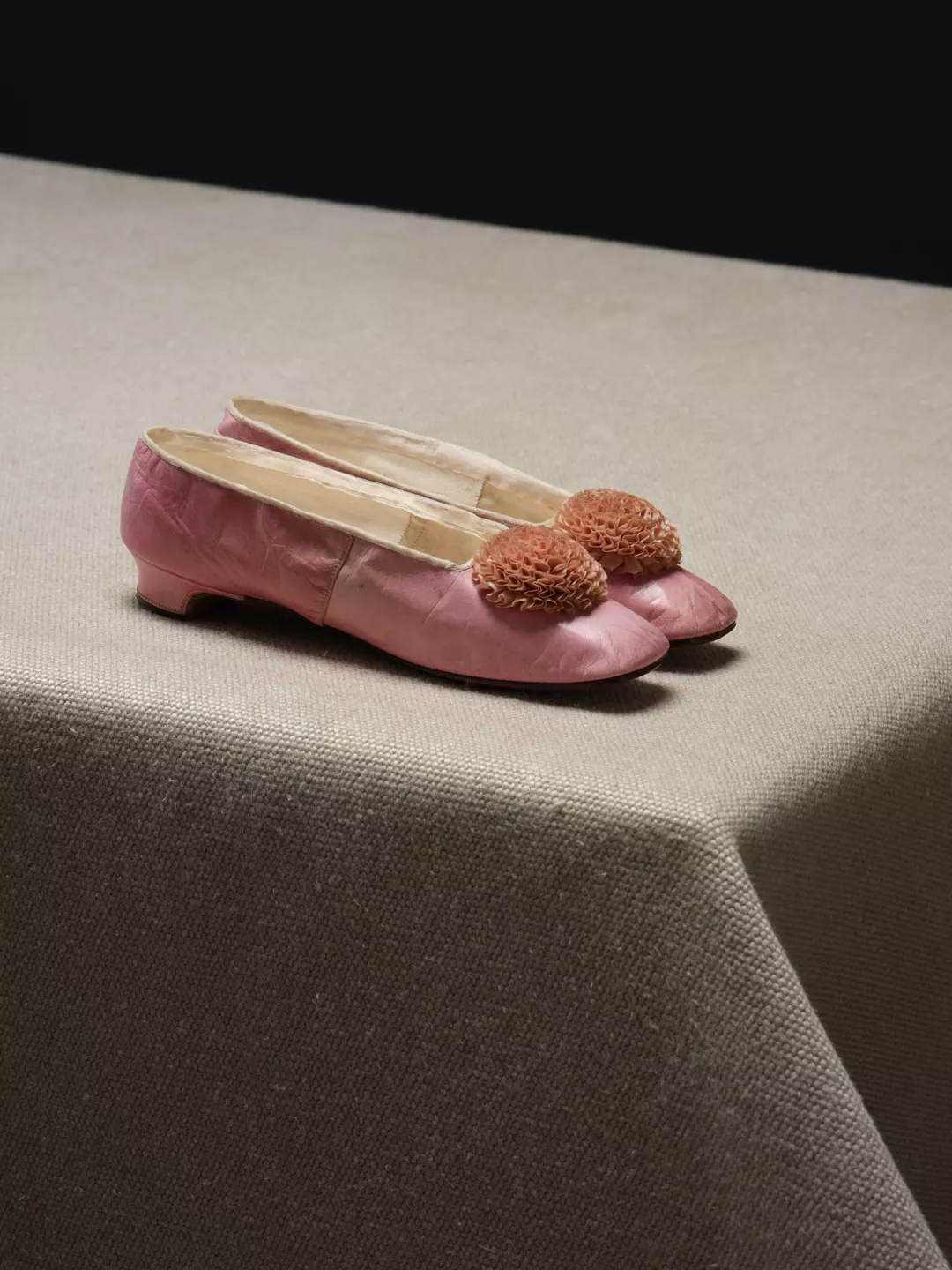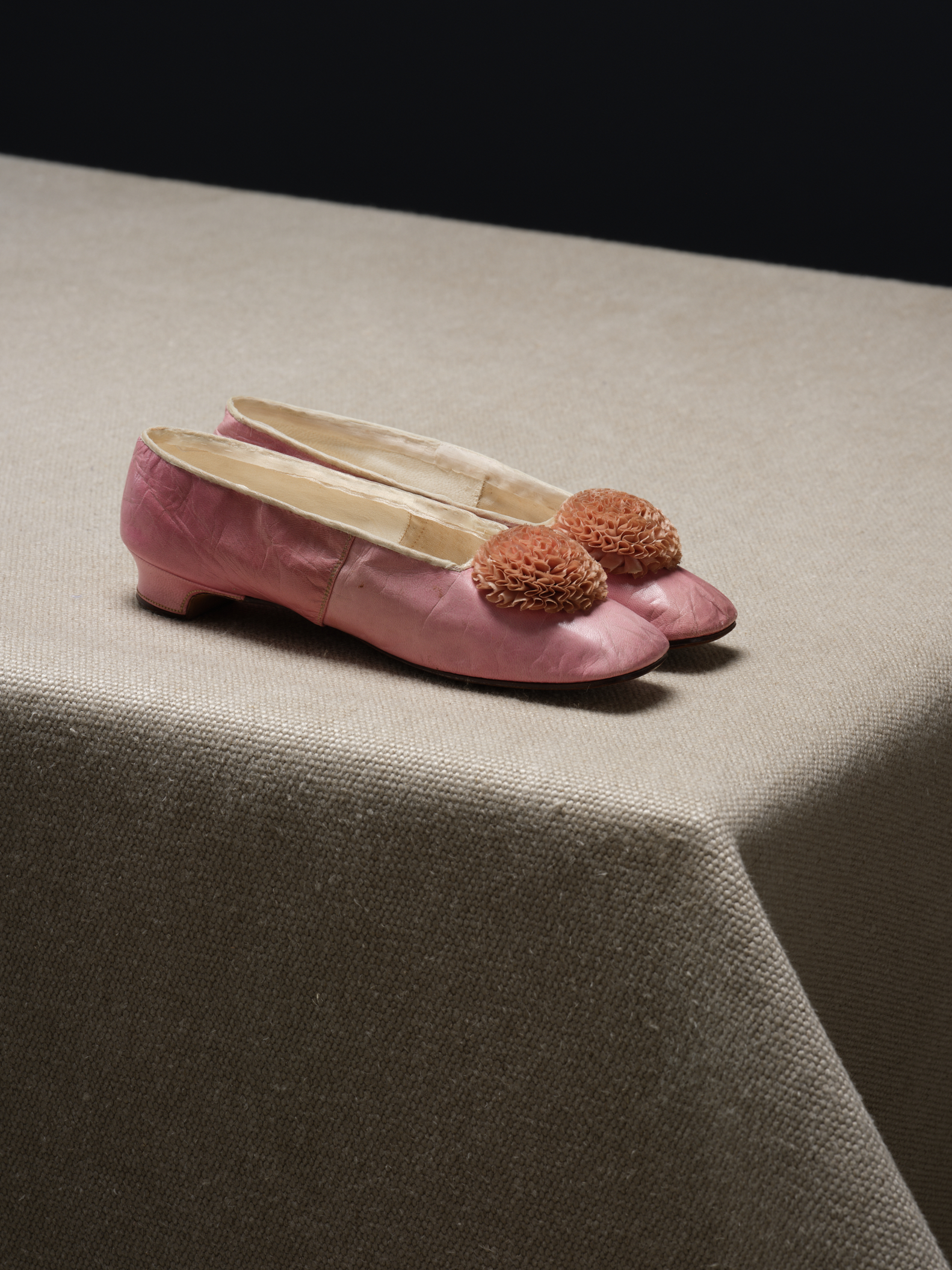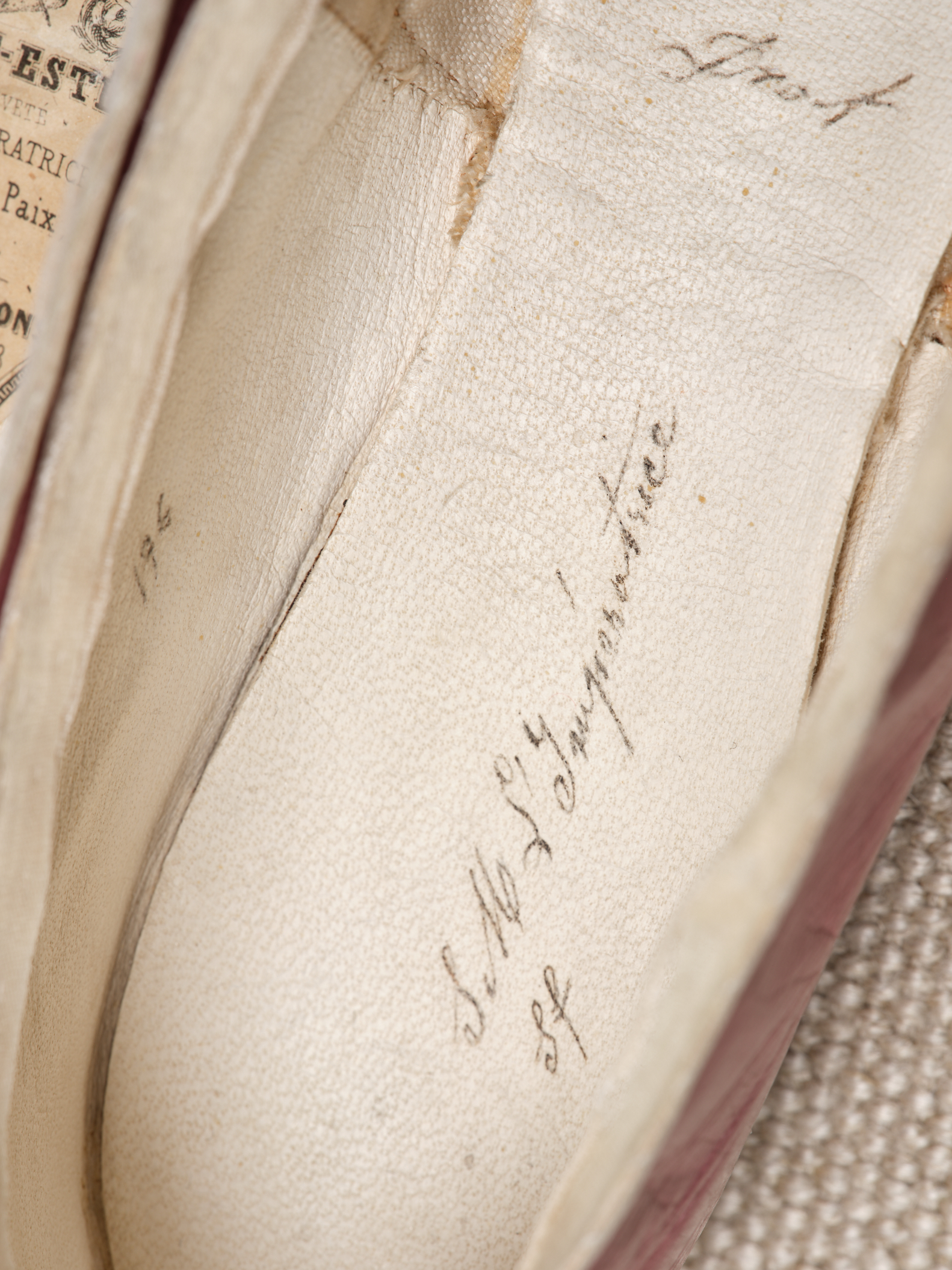 D’un rose délicat, ces escarpins à petits talons, garnis d’un pompon en satin de soie de même ton, sont caractéristiques du début des années 1860. La non-différenciation de la forme des pieds, encore effective à cette époque, impose au bottier d’indiquer la mention « droit » sur la semelle correspondante. L’inscription m nuscrite « S.M. l’Impératrice », sur la semelle de propreté du soulier droit, atteste leur appartenance à l’impératrice Eugénie. La même mention se retrouve sur quatre autres paires conservées au Bowes Museum (Barnard Castle, Angleterre), provenant de la donation Edelton. Robert Holmes Edelton, amateur de souvenirs du second Empire, aurait acquis la plupart des pièces de sa collection de costumes et d’accessoires lors de la vente organisée par Christie, Manson & Woods le 24 juillet 1923 à Londres, trois ans après le décès de l’impératrice. À l’instar de la paire d’escarpins conservée au Palais Galliera, l’ensemble de ces souliers portent la griffe « Viault Esté », bottier parisien renommé, installé au 17, rue de la Paix, « Four[isseu]r breveté de S.M. l’Impératrice », comme le précise l’étiquette systématiquement collée sur la semelle gauche. Ce brevet, accordé aux maisons les plus luxueuses par la cour impériale, était l’assurance d’une publicité en France et en Europe. Madeleine de Galéa, grande collectionneuse de poupées et de costumes historiques – dont le petit-fils, Christian, a transmis au musée quatre cent neuf costumes et accessoires, en 1962, après le décès de sa grandmère – a probablement acquis cette paire de souliers lors de la même vente que Robert Holmes Edelton.