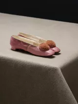 - Matériaux et techniques : Chevreau rose, cuir blanc, satin de soie rose, toile de coton blanche