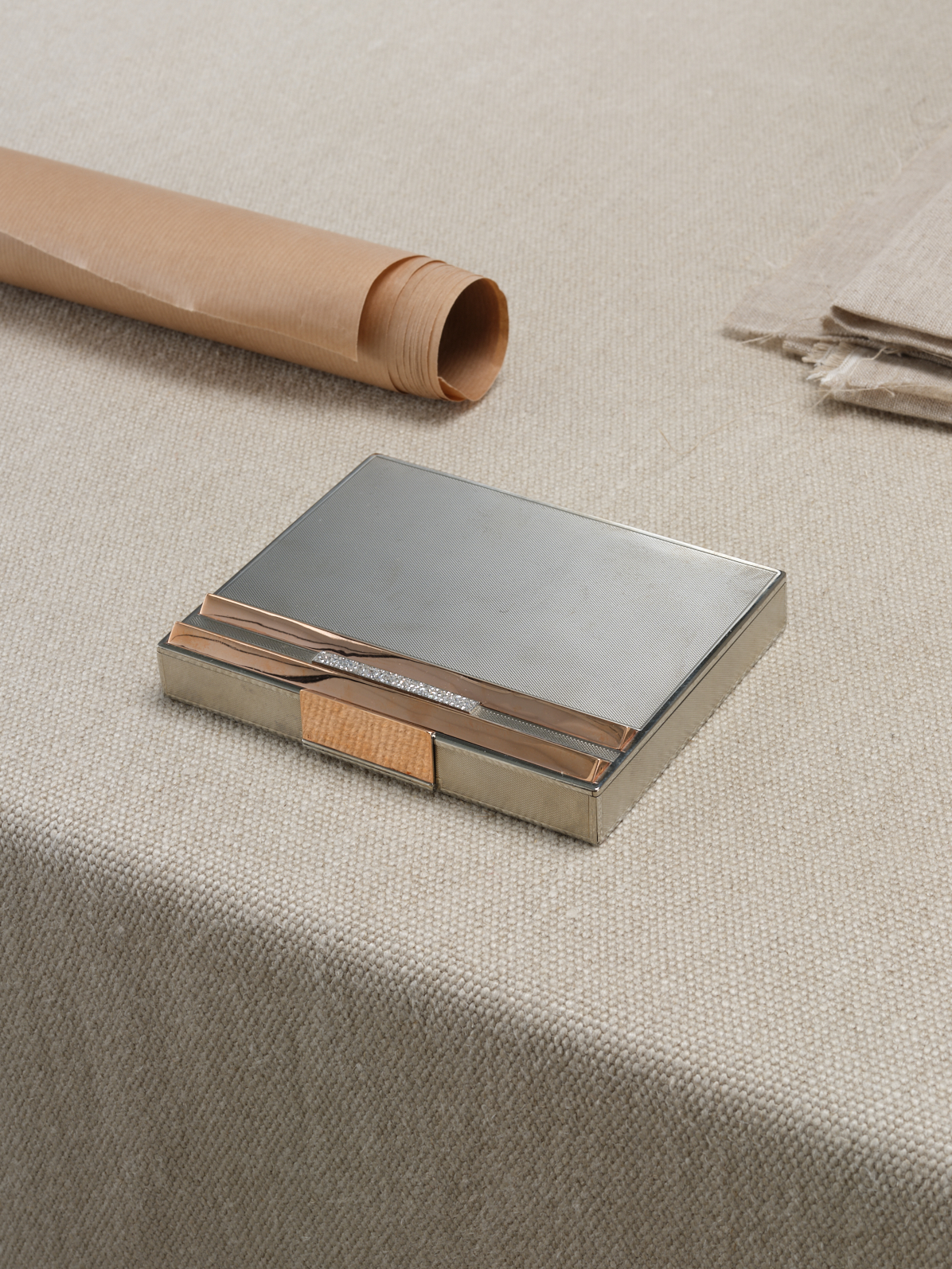 Si certaines minaudières sont réalisées en laque ou en or, celle conservée au Palais Galliera, à motif de grain d’orge, est fabriquée en Styptor, un « alliage de métaux communs » (or, argent, cuivre, nickel, palladium et zinc) déposé par Van Cleef & Arpels au greffe du tribunal de commerce de la Seine en 1932, sous le numéro 281292, « pour la fabrication d’objets de bijouterie et d’orfèvrerie ». Afin de répondre aux besoins des femmes, l’objet se compose de divers compartiments et accessoires : boîte à fard, nécessaire, briquet, vide-poche, peigne, miroir et étui à cigarettes. Conservées dans les archives de la maison joaillière, la facture et les pancartes de la minaudière (numéro 41324) et du briquet (numéro 41325) donnent une date précise de création : le 27 juillet 1934. Le mystère reste toutefois entier quant à l’identité de l’élégante qui arbora cet accessoire emblématique des années 1930.