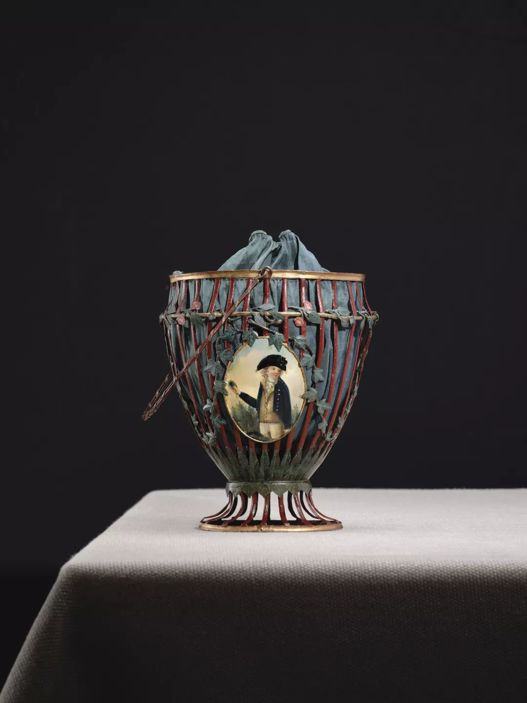 L’emploi du sac est étroitement lié à l’ampleur du costume ; plus celui-ci est volumineux plus il permet de dissimuler des poches contenant divers objets, rendant inutile le sac. De ce fait, ce dernier est presque totalement absent au XVIIIe siècle, jusqu’au changement radical de la silhouette de 1795. Les rares exemples qui apparaissent sont le plus souvent de petits paniers à ouvrage. D’autre part, ce sac est sans doute un accessoire de corbeille de mariée, car les deux médaillons sont ornés du portrait d’un jeune homme et d’une jeune fille. Cette dernière ouvre la cage d’un oiseau, évoquant ainsi le thème de la cage ouverte et de l’oiseau envolé, symbole de la virginité perdue, au XVIIIe siècle.