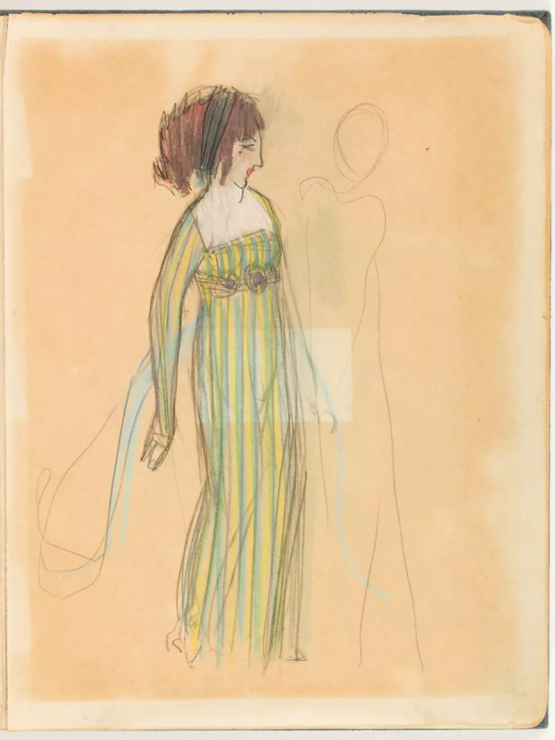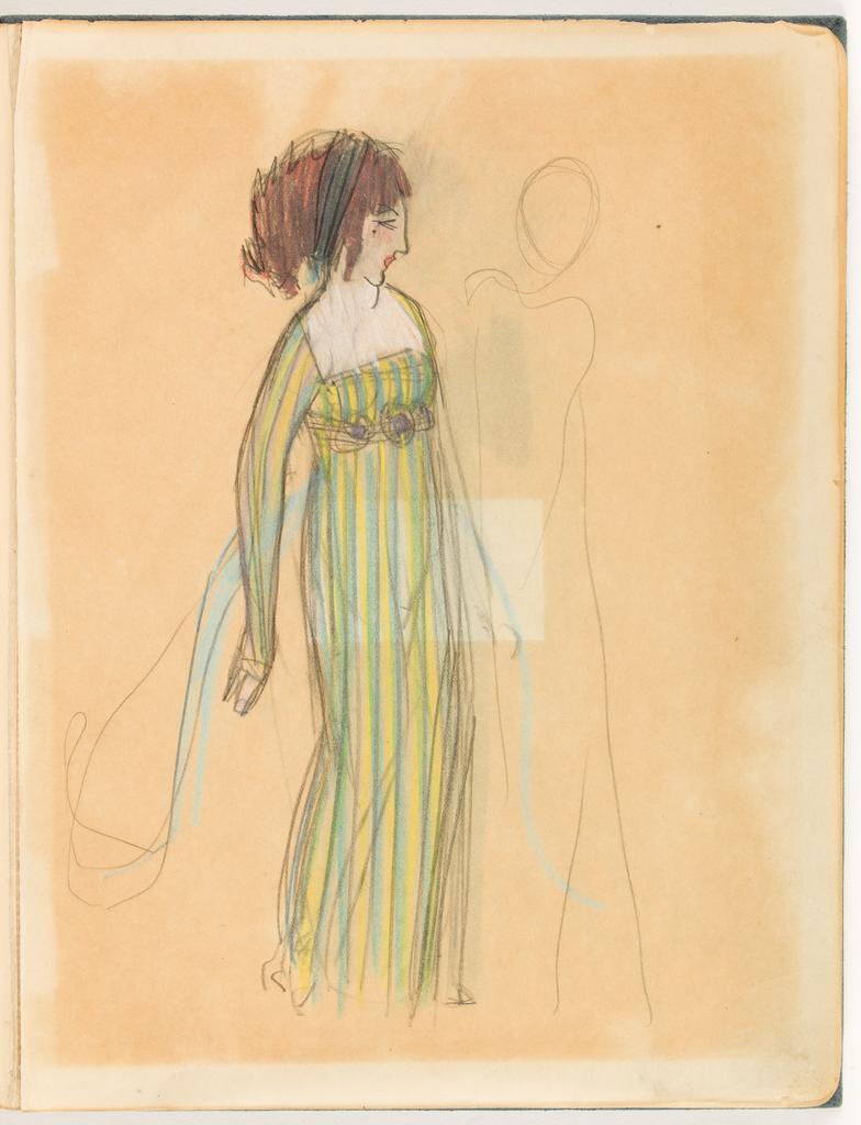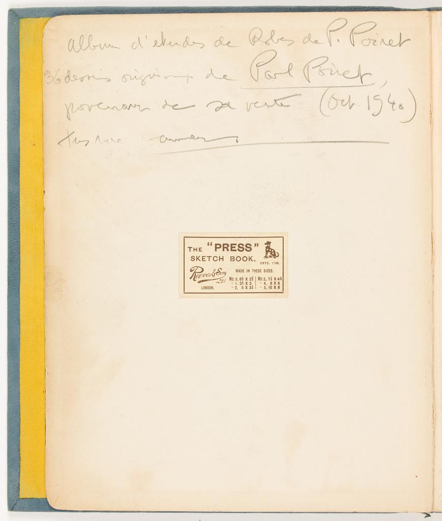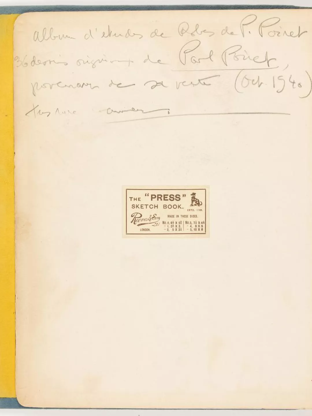 - Matériaux et techniques : Carnet préparatoire à l’exécution des «Robes de Paul Poiret racontées par Paul Iribe». Album de 34 dessins originaux à la mine de plomb, quelques-uns relevés aux crayons de couleur sur papier.