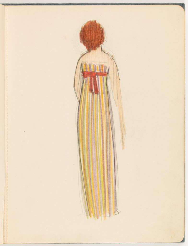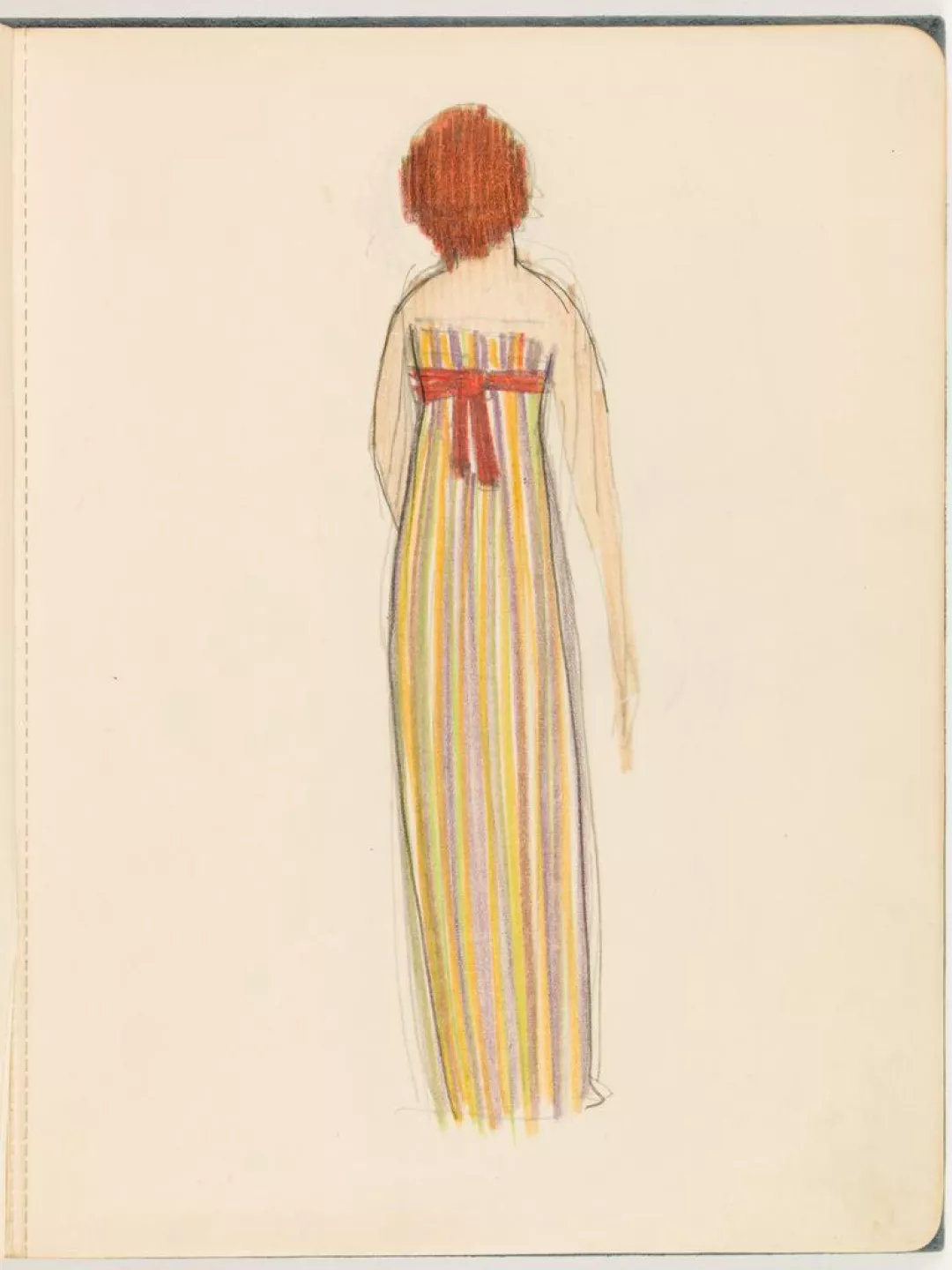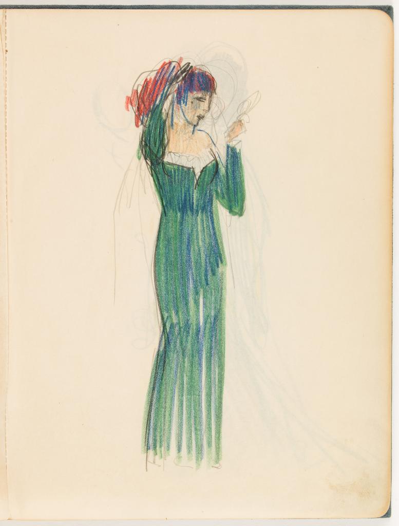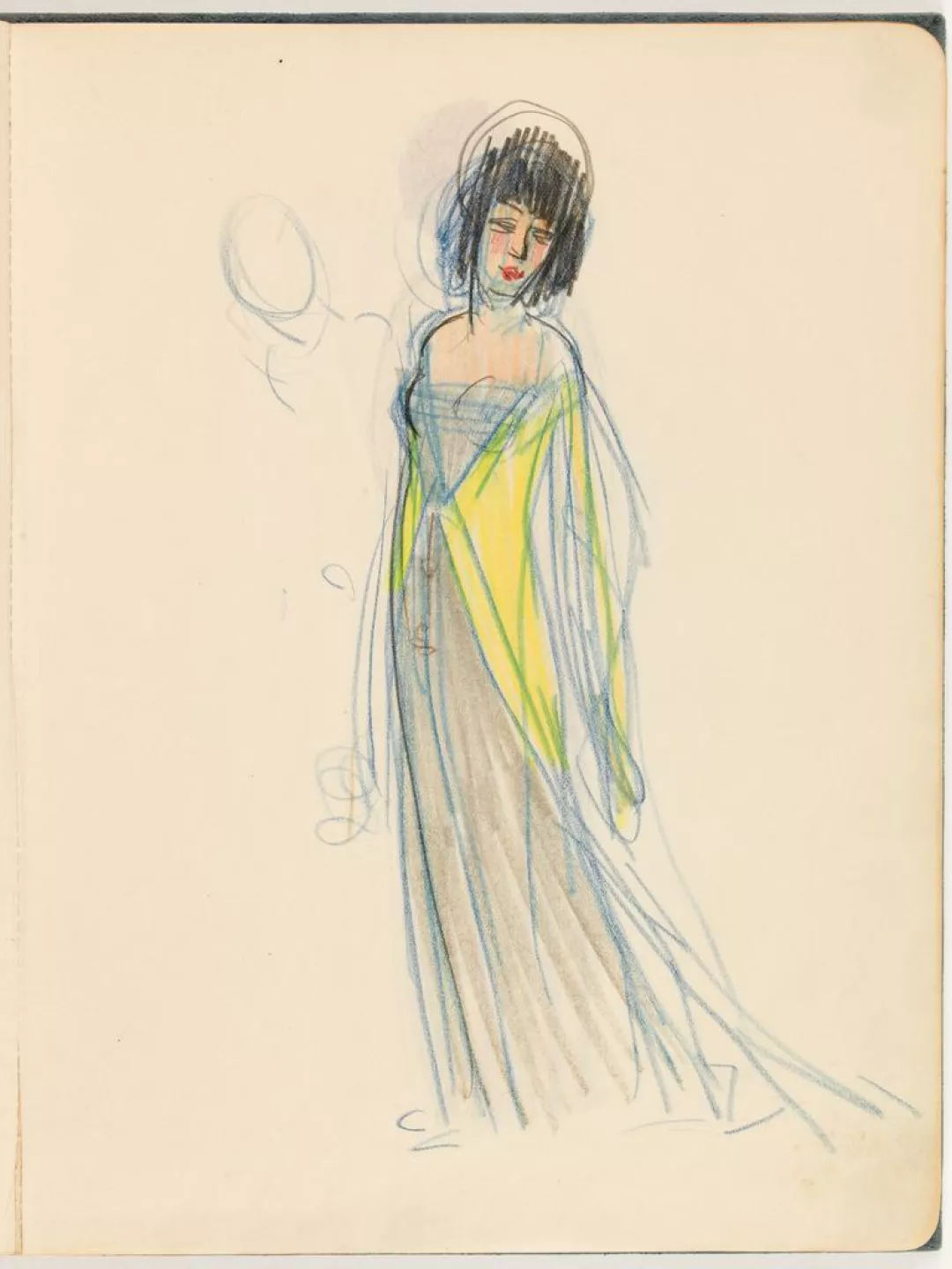 - Matériaux et techniques : Carnet préparatoire à l’exécution des «Robes de Paul Poiret racontées par Paul Iribe». Album de 34 dessins originaux à la mine de plomb, quelques-uns relevés aux crayons de couleur sur papier.