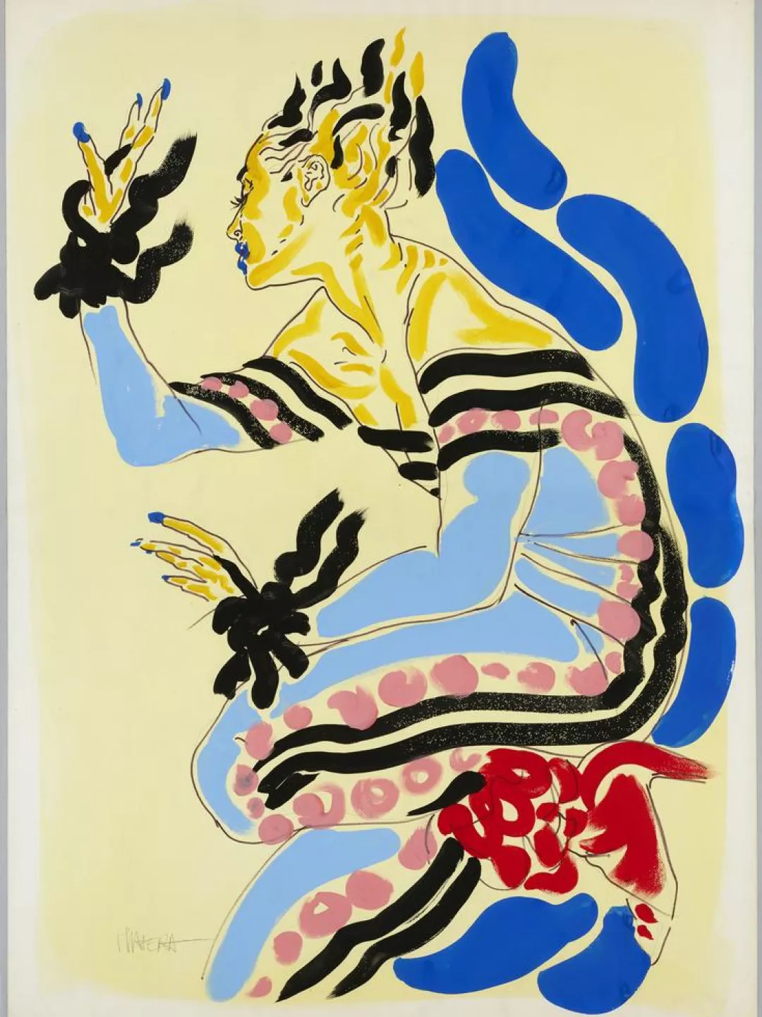 Cette œuvre est représentative de son travail d’affichiste et de l’indépendance esthétique dont elle toujours fait preuve dans sa carrière. Réalisée en 1983 pour New Melsa, la composition se détache de la simple illustration de produits commercialisés par l’enseigne pour proposer une image de marque née de l’univers créatif de l’artiste. Les campagnes d’affichage du magasin étaient renouvelées quatre fois par ans au rythme des saisons. A chaque nouvelle commande, l’illustratrice se livrait à un nouvel exercice de style.