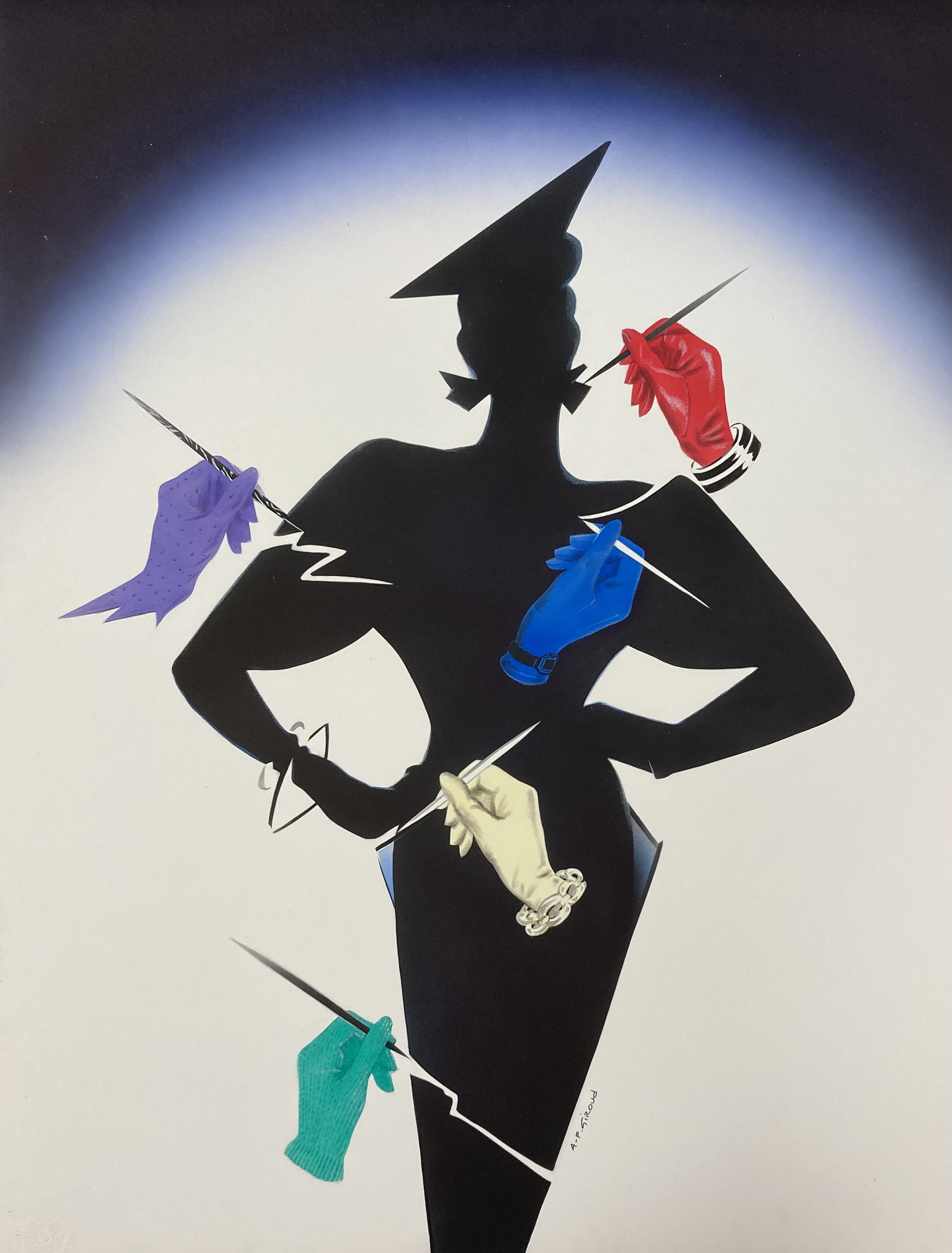 Elle peut se lire comme une métaphore de l’illustration de mode avec ces mains gantées de différentes couleurs virevoltant autour s’une silhouette à contre-jour qu’elle dessinent. Les détails et les couleurs sont réservés aux gants, la silhouette noire évoquant le glamour des films hollywoodiens des années 1940 concentre essentiellement l’attitude et la structure épaulée à la taille étranglée représentatives du « Drama Power » de l’époque dont Thierry Mugler et Claude Montana étaient alors les chefs de file.