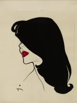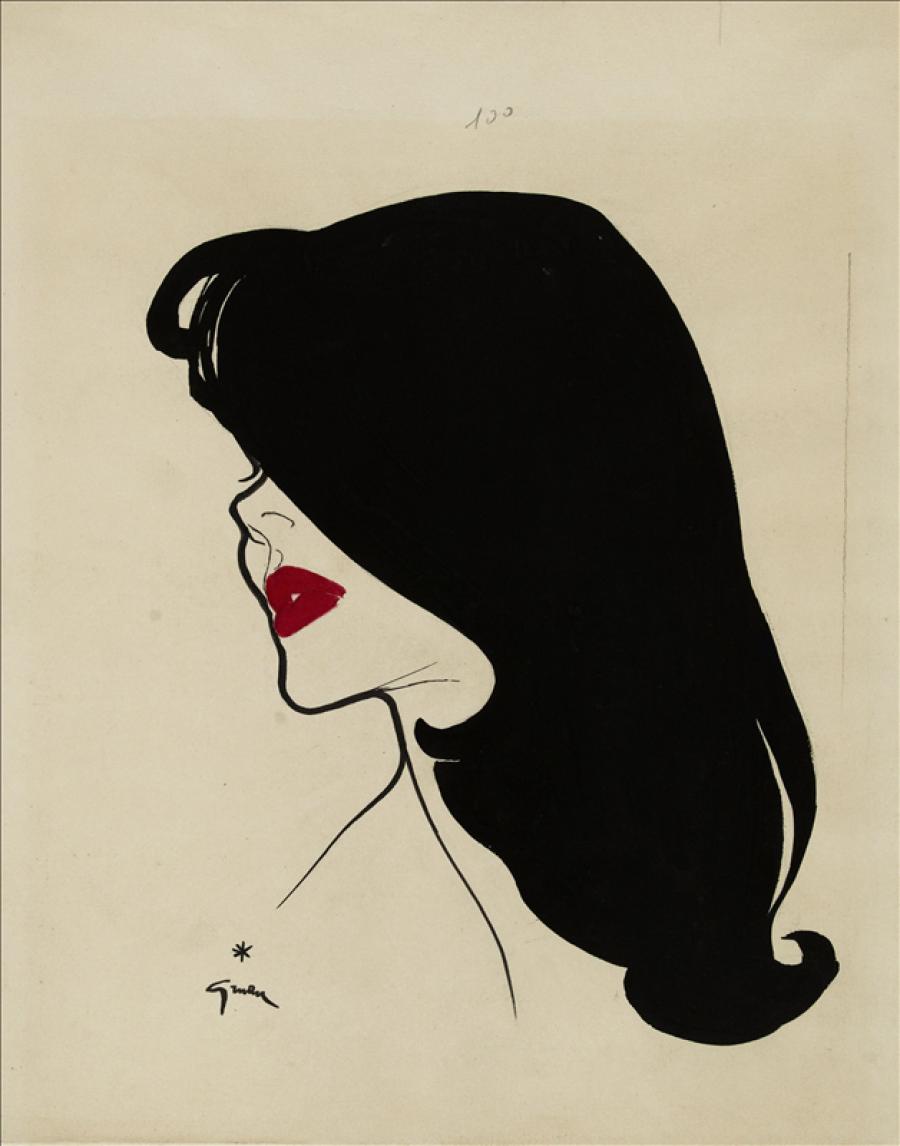En 1949, René Gruau crée une première affiche pour le Rouge Baiser, le rouge à lèvres mis au point par Paul Baudecroux en 1927 et réputé être d’une très longue tenue, résistant même aux baisers ! Dans cette première version l’illustrateur représente une femme blonde, aux lèvres soulignées de rouge, les yeux bandés. Par la suite il décline le thème et réalise plusieurs publicités, dont le Palais Galliera possède un dessin original. Il évoque une femme raffinée, élégante et sensuelle, sujet privilégié de Gruau. On y retrouve le style de l’illustrateur : le contraste du papier blanc, de l’encre noire et de la touche de couleur vive, l’aplat des couleurs repris ici par la chevelure noire, un graphisme net, une impression de mouvement.