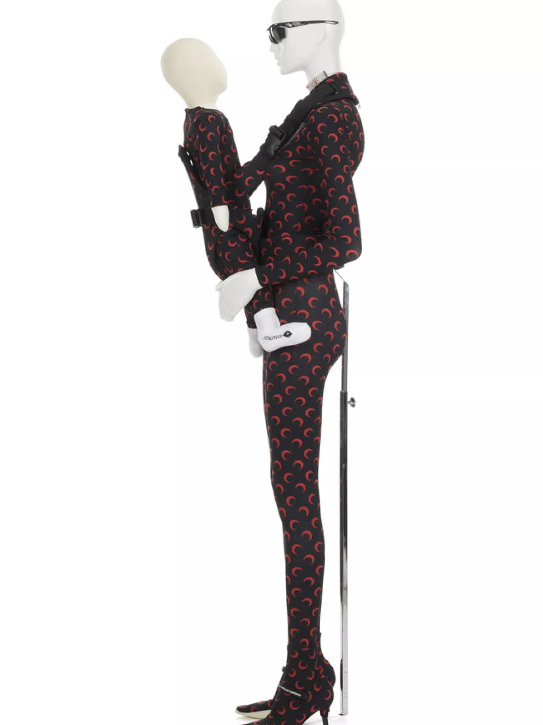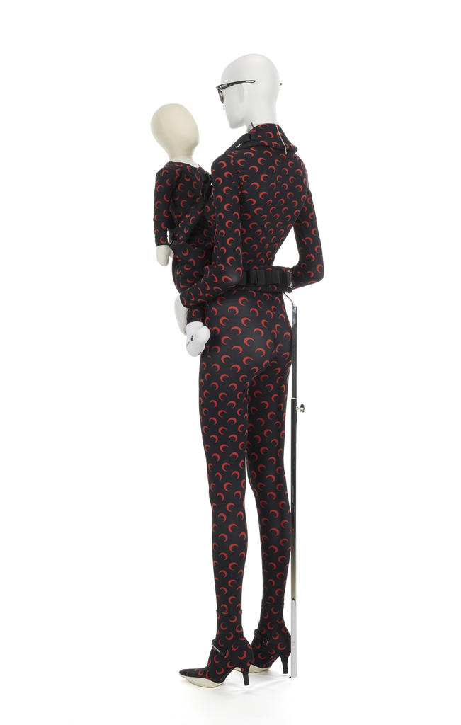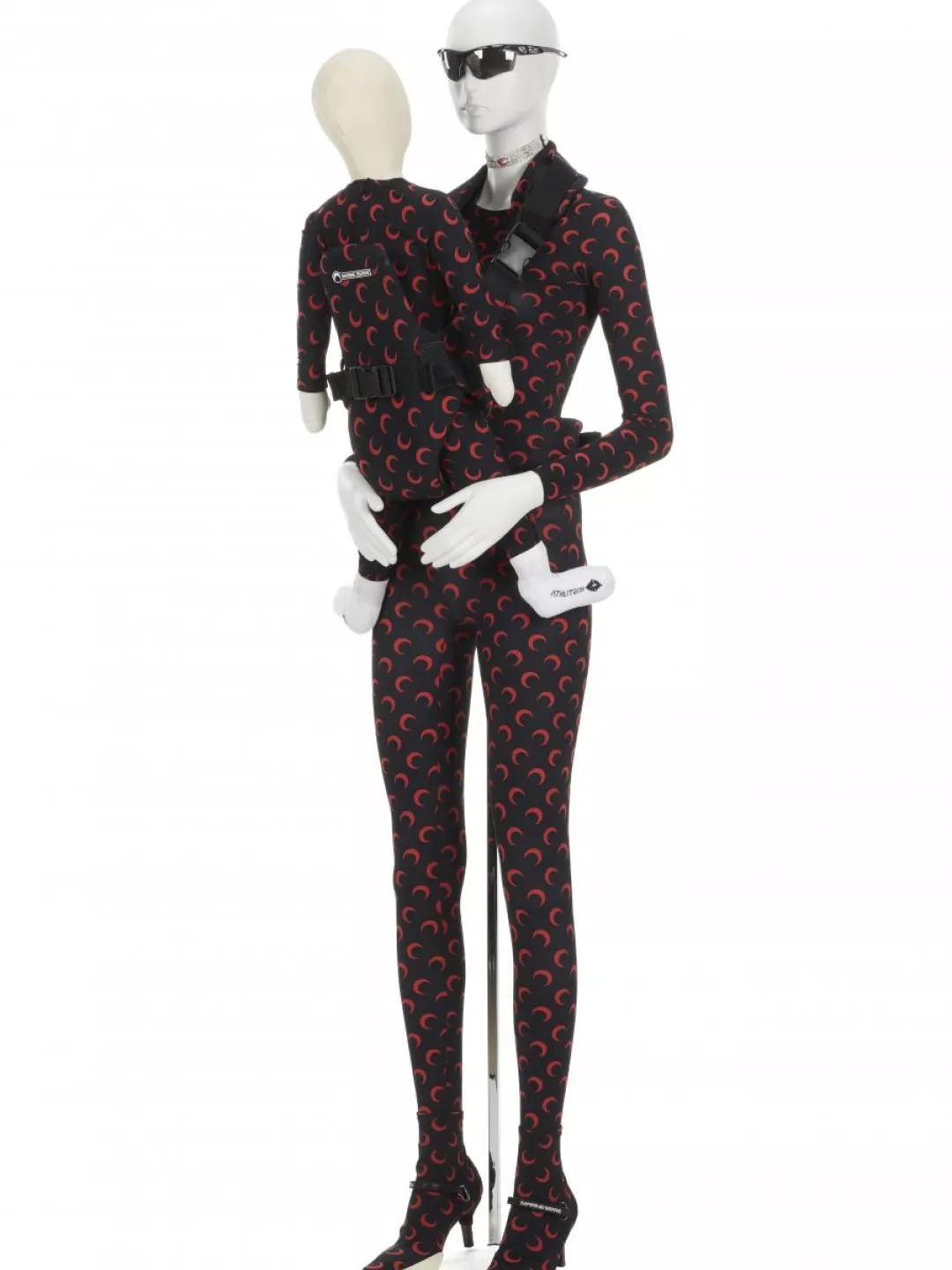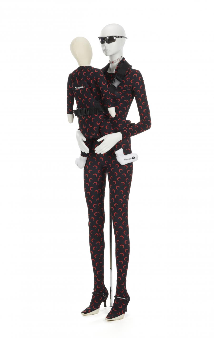 Une mère (Inès Abdallah) portait son fils (Naël, 3 ans) dans un porte-bébé frontal, les deux corps gainés dans un jersey imprimé de croissants de lune rouge sur fond noir. Les lunettes de soleil- techniques reprises de celles des coureurs cyclistes contrastent avec ses escarpins à talons gainés d’une chaussette couverte des mêmes croissants et dont la semelle épaisse rappelle celles des sneakers. Même le porte bébé est gainé du jersey au logo de la créatrice.