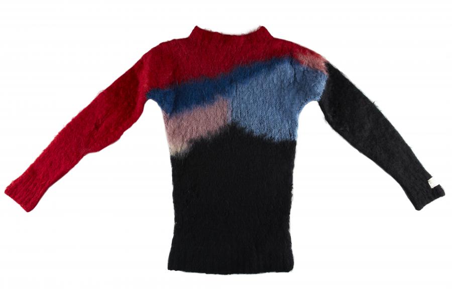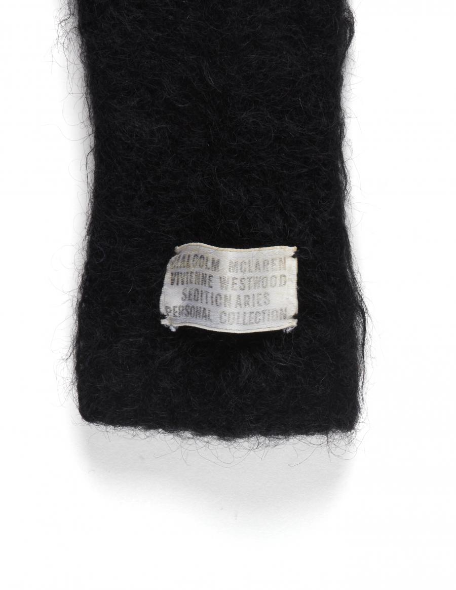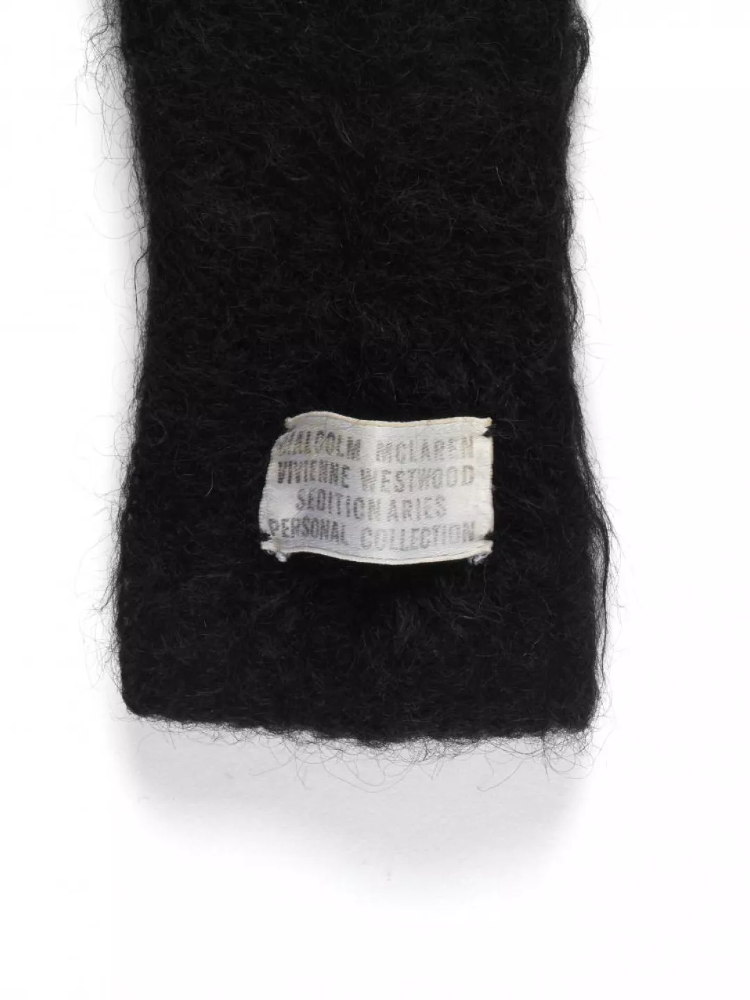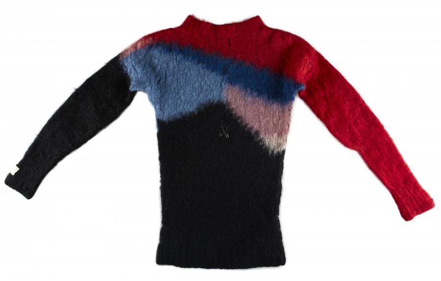 L’esthétique lacérée, trouée et entravée inspirée de la pratique sadomasochiste se retrouve dans ce pull-over ayant appartenu à John Joseph Lydon, dit Johnny Rotten, leader des Sex Pistols. Autre emblème punk, deux épingles à nourrice en acier, d’ordinaire utilisées pour rafistoler un vêtement usé, barrent la poitrine du rocker. En tricot de mohair lâche à aplats de couleur volontairement dissonants, ce modèle de pull est devenu un symbole du mouvement punk, au point d’être repris par Martin Margiela en 1990, Raf Simons en 1998 ou encore Rodarte en 2008.