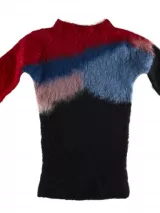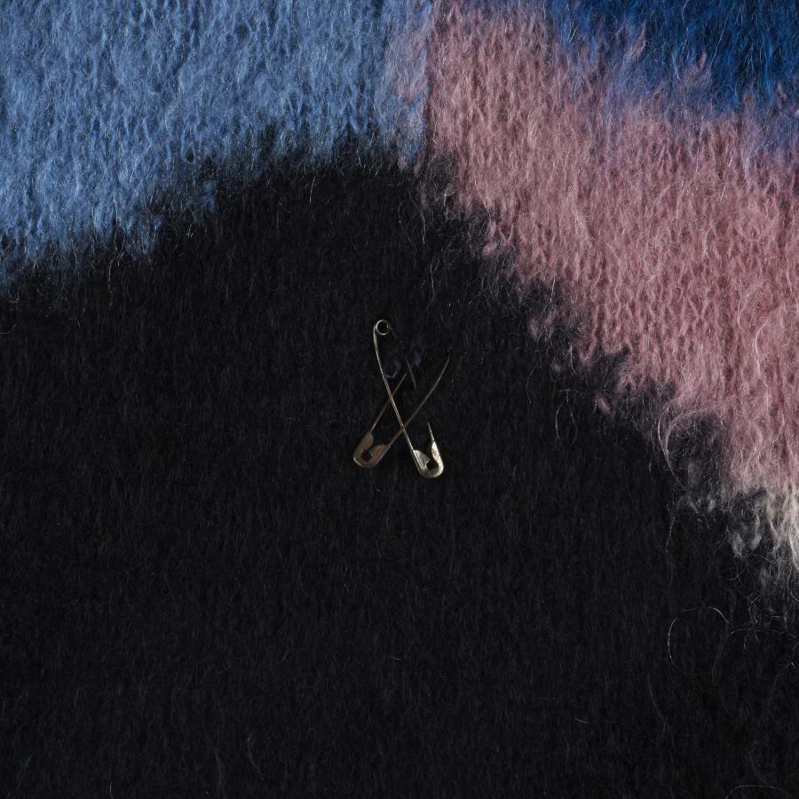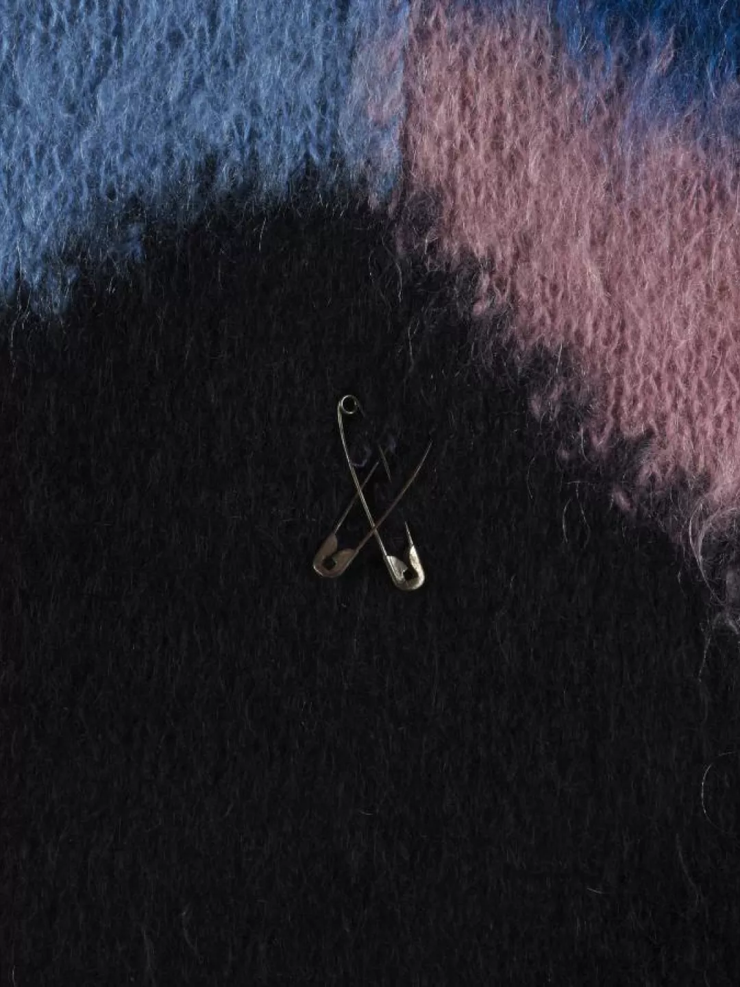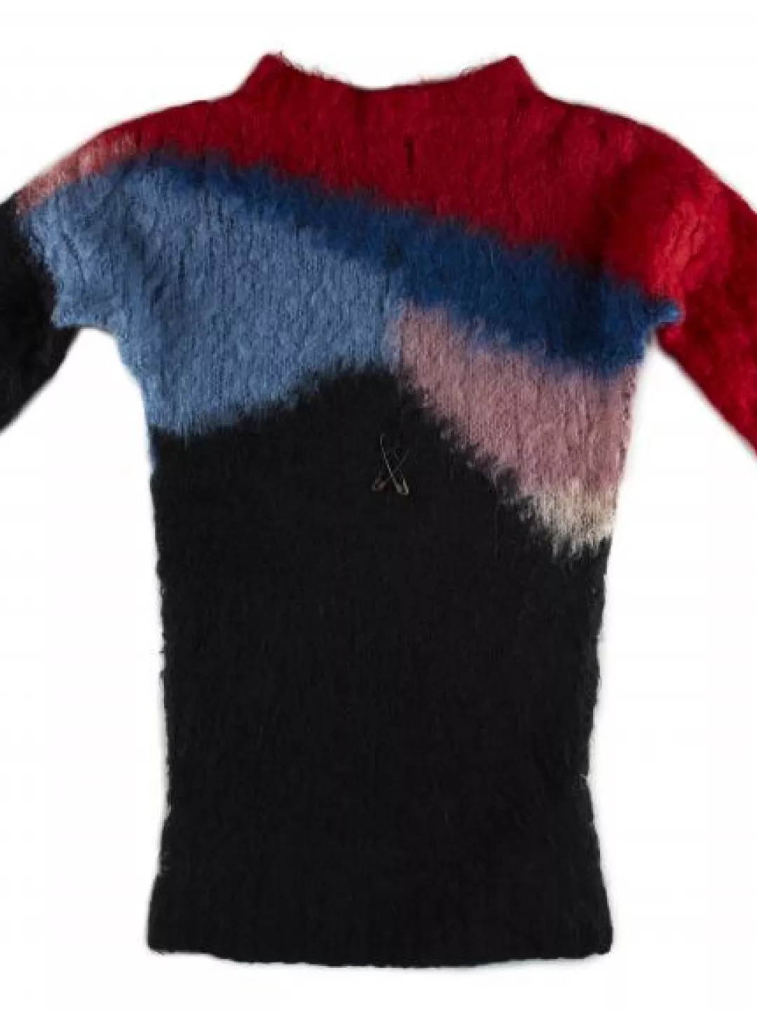 L’esthétique lacérée, trouée et entravée inspirée de la pratique sadomasochiste se retrouve dans ce pull-over ayant appartenu à John Joseph Lydon, dit Johnny Rotten, leader des Sex Pistols. Autre emblème punk, deux épingles à nourrice en acier, d’ordinaire utilisées pour rafistoler un vêtement usé, barrent la poitrine du rocker. En tricot de mohair lâche à aplats de couleur volontairement dissonants, ce modèle de pull est devenu un symbole du mouvement punk, au point d’être repris par Martin Margiela en 1990, Raf Simons en 1998 ou encore Rodarte en 2008.
