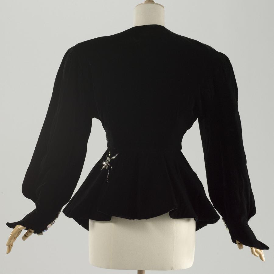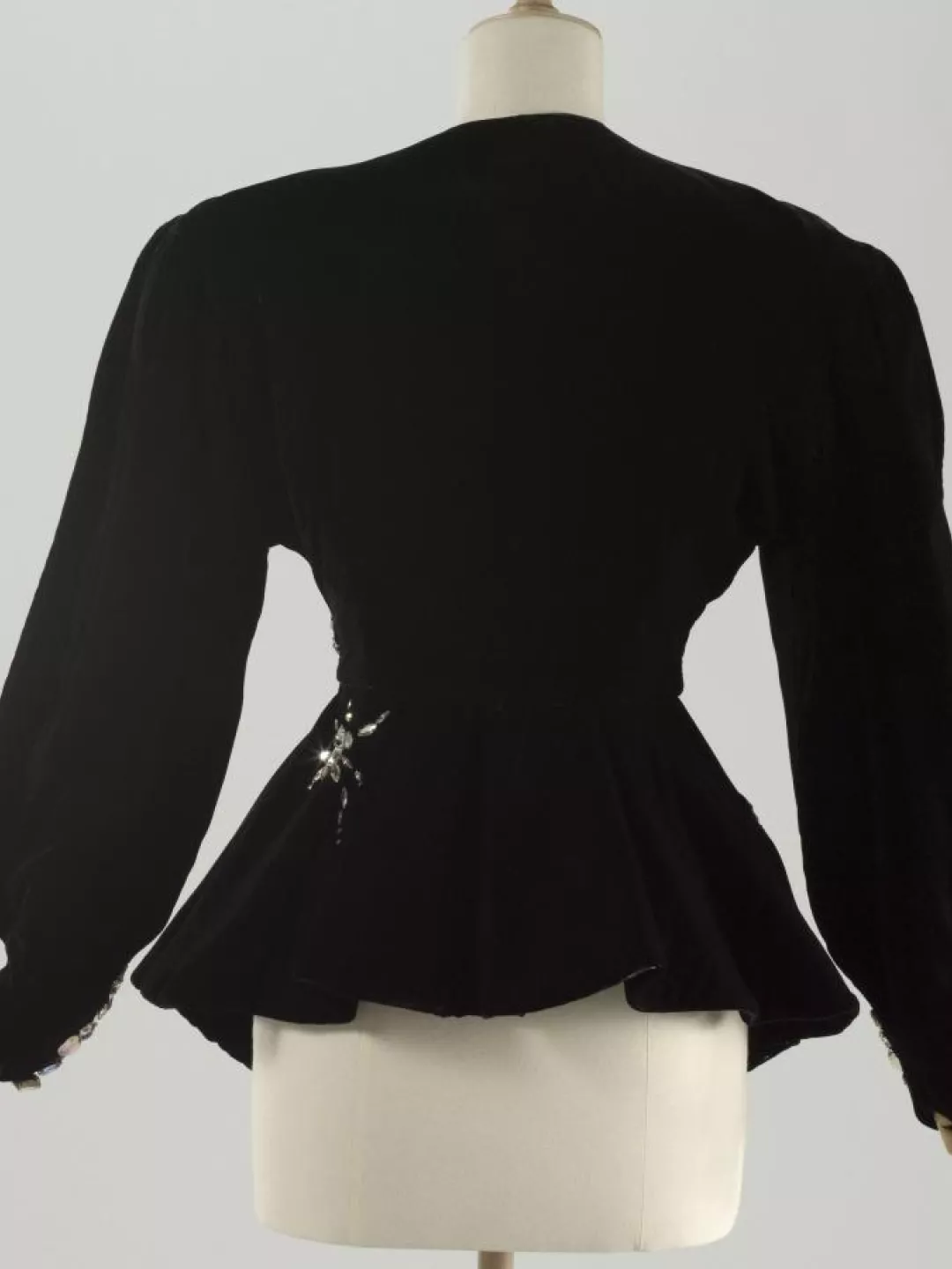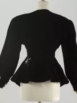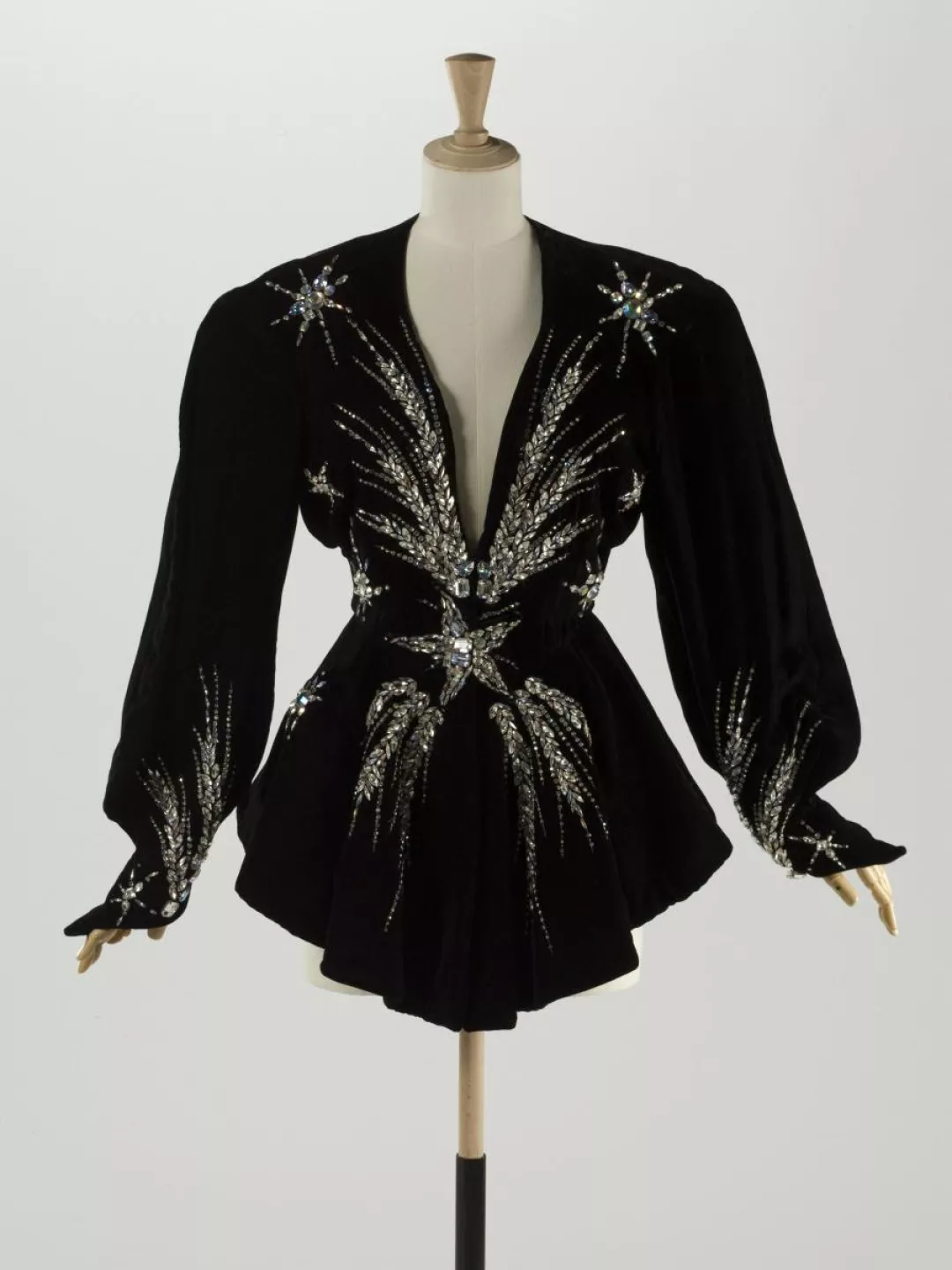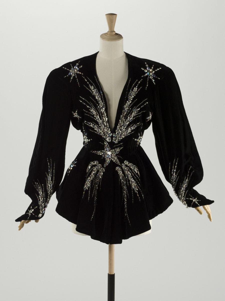 Aux côtés d’Azzedine Alaïa et de Claude Montana, Thierry Mugler est l’un des principaux acteurs de la mode des années 1980 et de la consécration du prêt-à-porter. Sa vision théâtralisée du vêtement se retrouve dans des défilés spectaculaires où les femmes, comme autant d’héroïnes, défilent dans des cadres de plus en plus scénarisés, à l’instar nde celui de mars 1984 qui réunit près de six mille personnes au Zénith de Paris. Thierry Mugler choisit pour emblème l’étoile tatouée sur le poignet de sa muse, Dauphine de Jerphanion. Cette robe-manteau en velours noir est ainsi brodée de constellations associées à des gerbes de blé, symbole de prospérité.