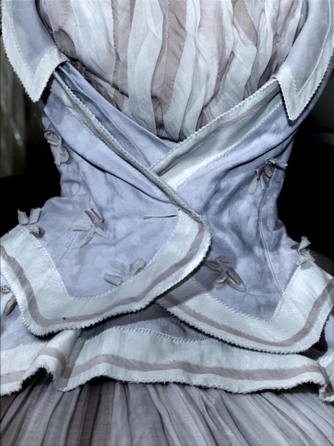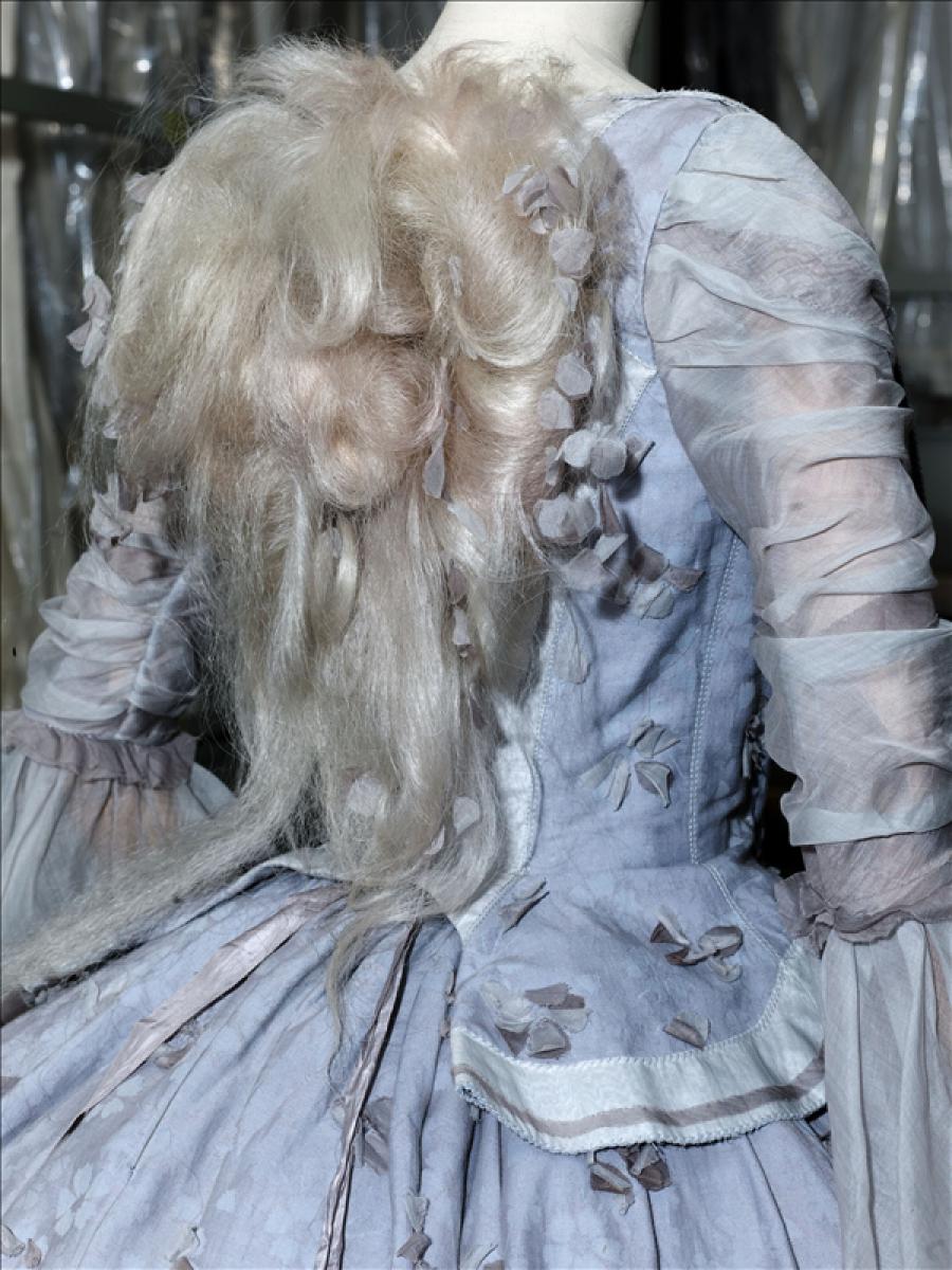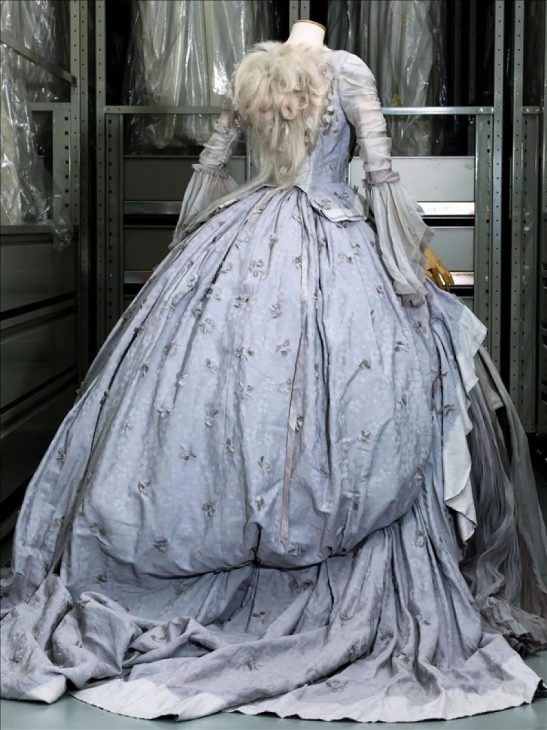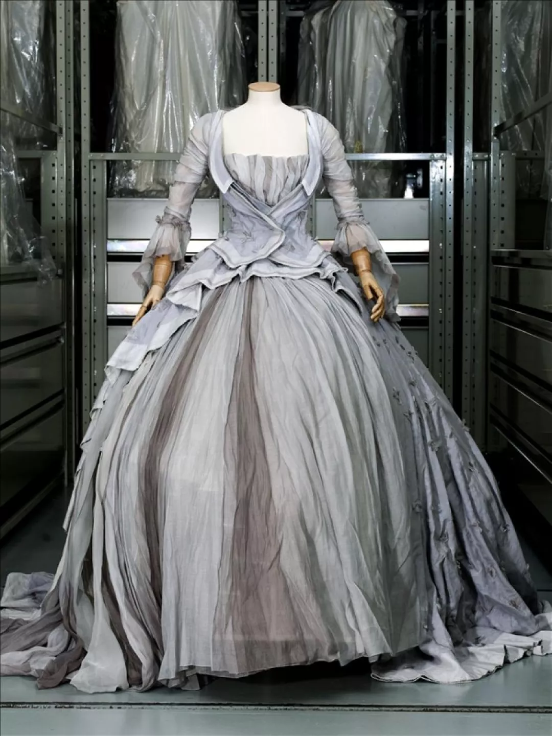Marie-Antoinette, sorti en 2006. Il ne s’agit pas d’un costume créé pour le film mais de l’évocation du personnage de Marie-Antoinette par Olivier Theyskens. La robe est à la fois spectaculaire et fantomatique. La gamme de gris clairs évoque, de manière poétique, les mousselines blanches, chères à la souveraine, empoussiérées par le temps. Theyskens fait revivre la fin de l’ancien régime et le personnage rêvé de Marie-Antoinette sans avoir recours à une reconstitution historique servile. Ainsi, la robe repose-t-elle sur la structure d’une impressionnante crinoline qui ne sera utilisée que sous le Second Empire mais l’évocation est plus forte qu’une simple reconstitution. Cette robe est un mélange de robe de cour, de robe à l’anglaise avec des détails à la polonaise, réalisée dans un coton qui est celui des robes chemises que portait la reine dans son hameau de Trianon. Les faux cheveux cousus à l’arrière du buste rappellent la fin tragique de la souveraine. Olivier Theyskens crée une robe hommage pour un fantôme. En une silhouette il évoque plusieurs moments de la vie de la souveraine.