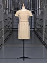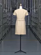 Cet ensemble, porté par l’actrice, notamment le 20 juin 1966 à l’hippodrome de Longchamp, se compose d’un robe en sergé de laine dont le haut est en crêpe de Chine et d’une veste courte, fermée dans le dos par quatre boutons. Givenchy correspond donc à l’air du temps en créant cet ensemble court, aux genoux, aux manches courtes et aux épaules carrées dont la précision de coupe évoque sa complicité avec son maître et ami, Cristóbal Balenciaga.
