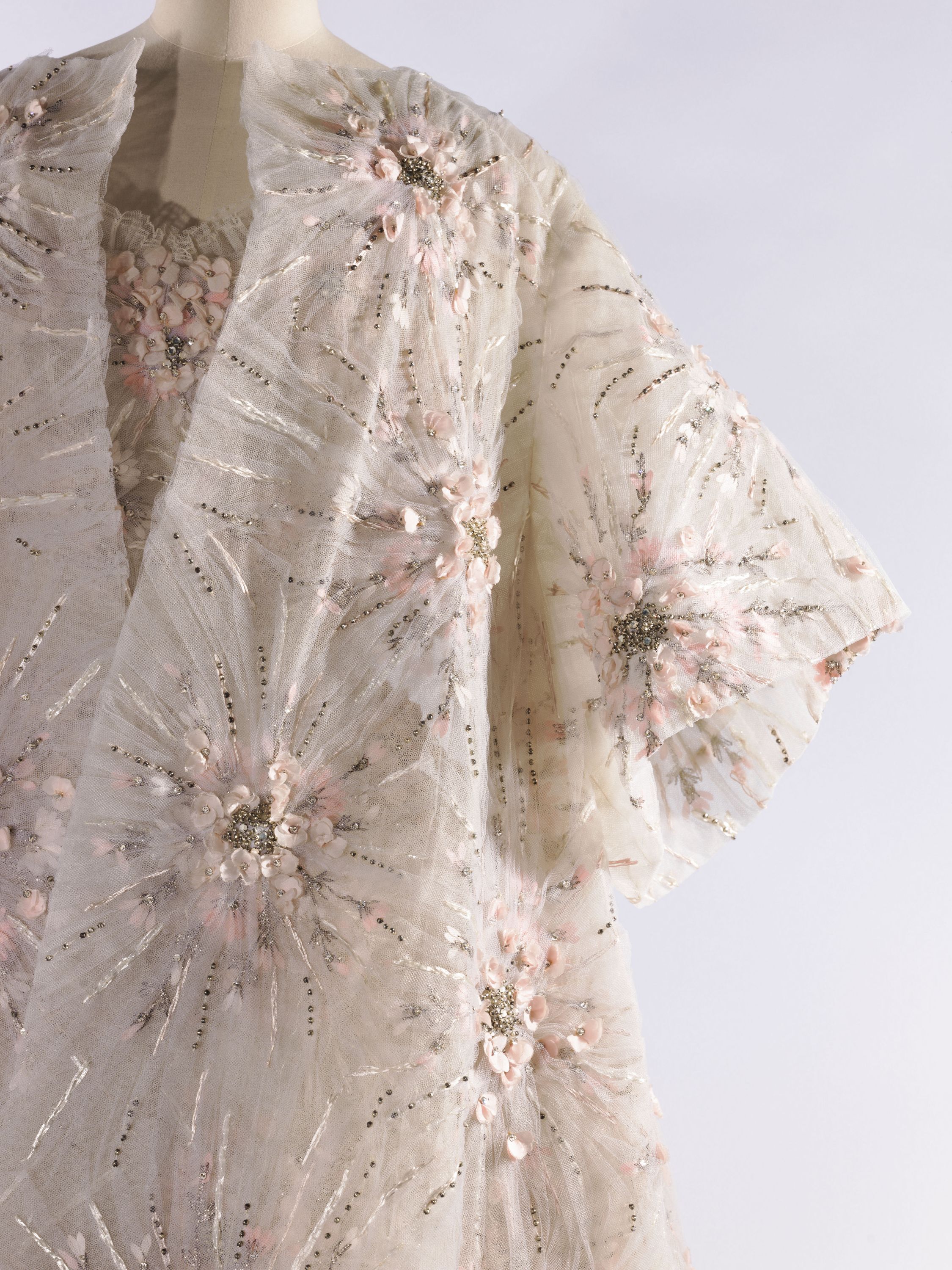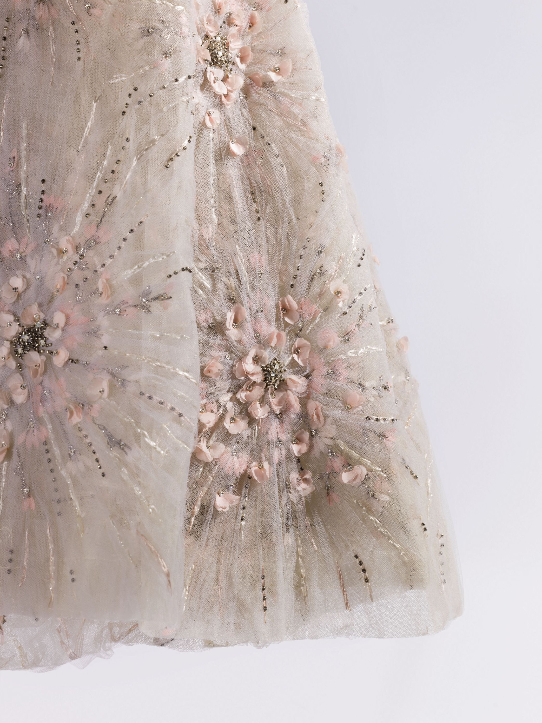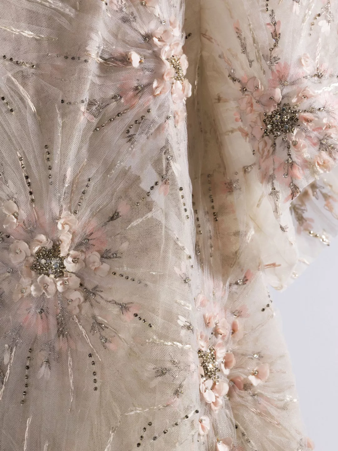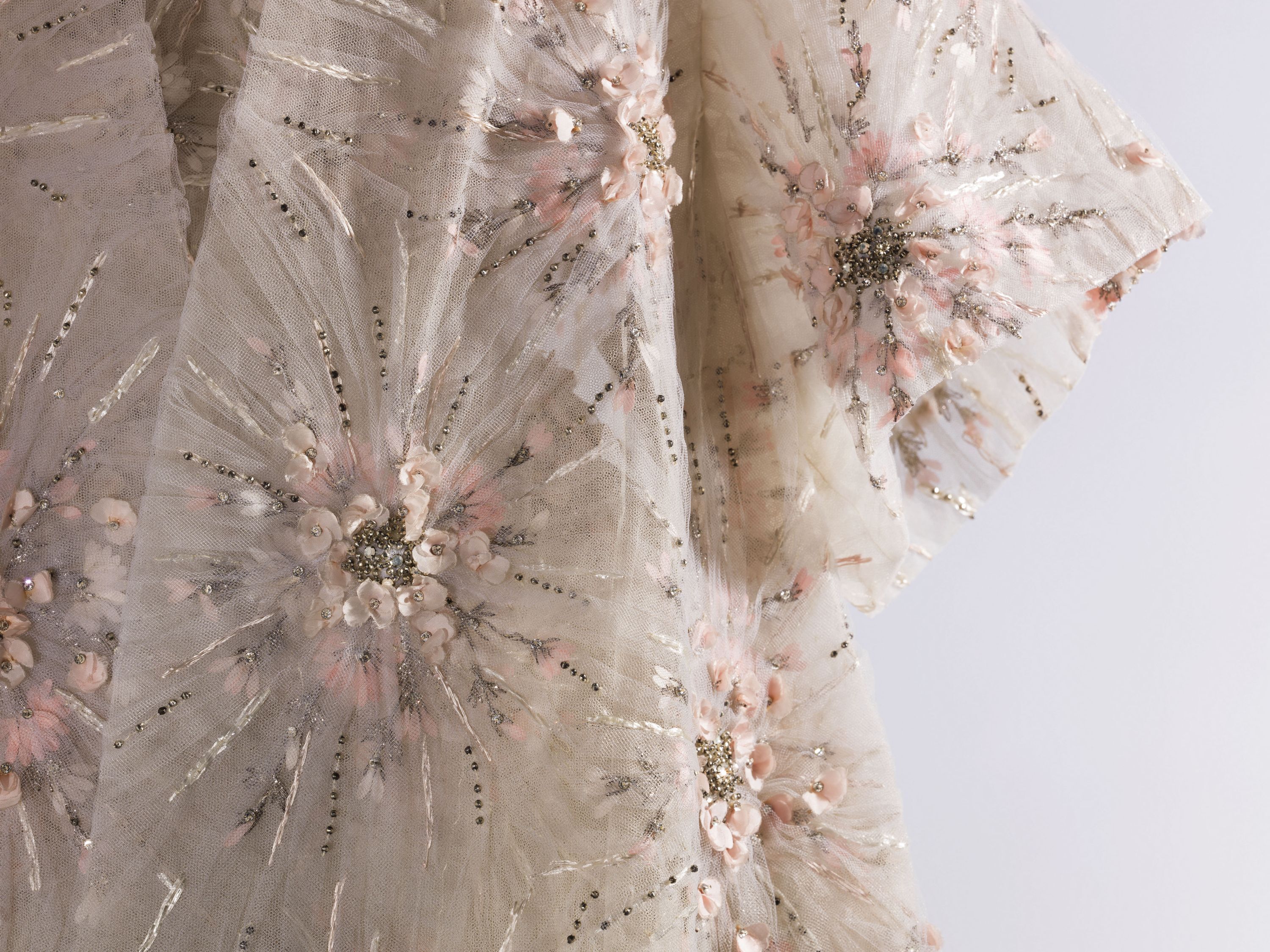 - Matériaux et techniques : Fibre artificielle cellulosique, Tulle, Broderie (technique), Soie et Strass.