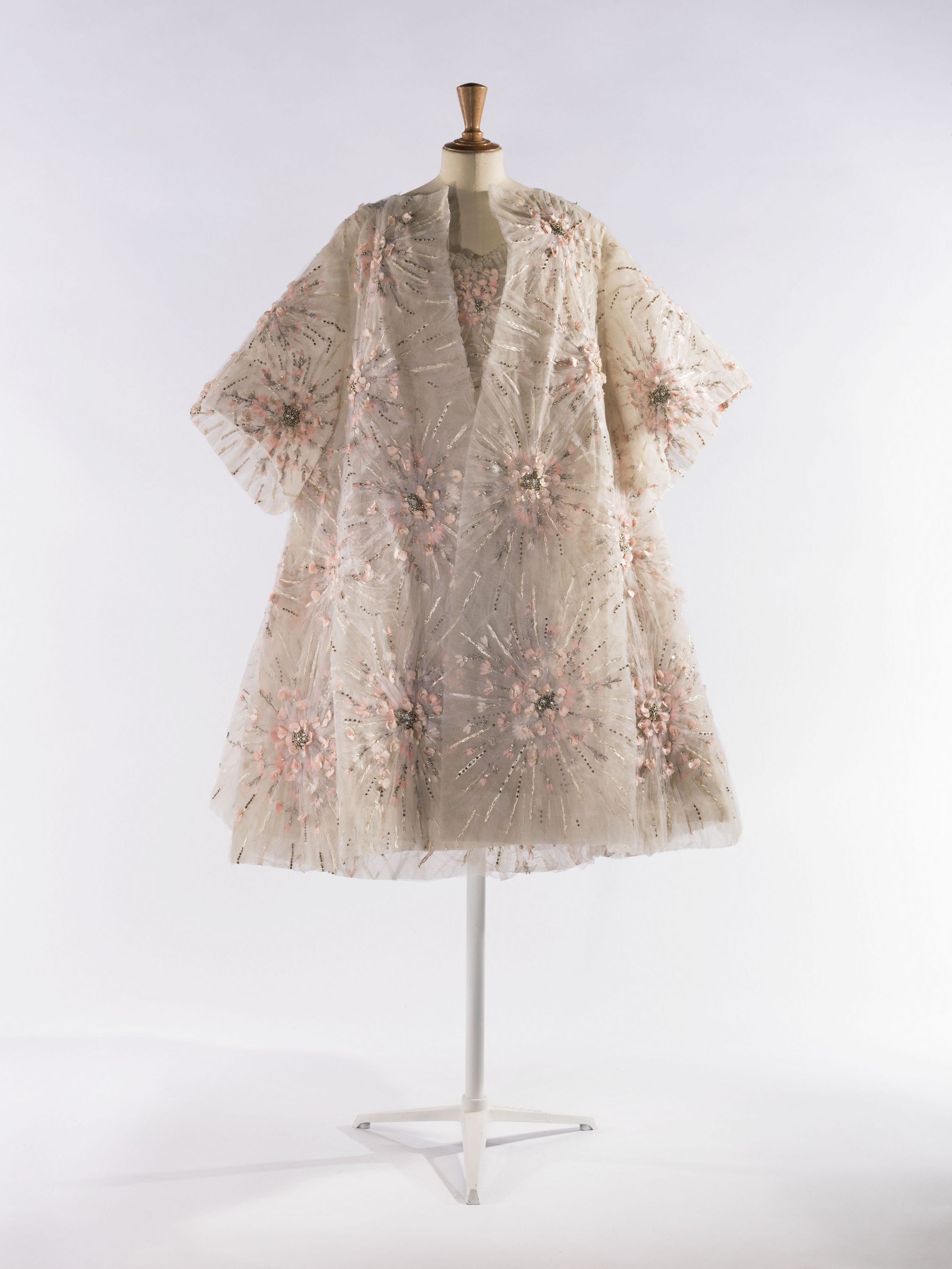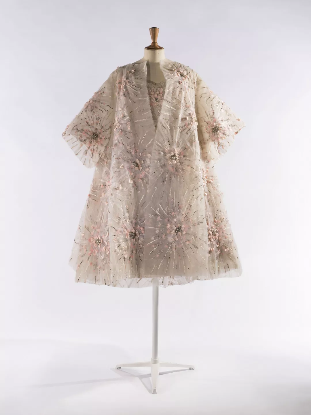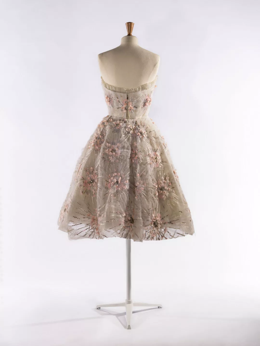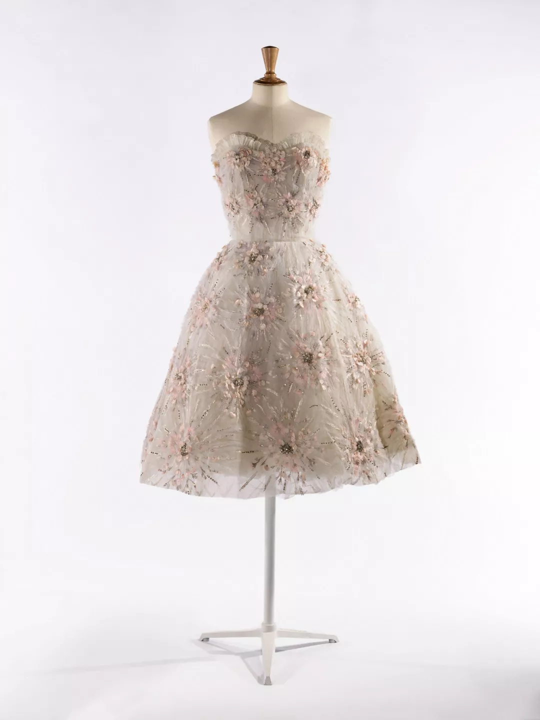 - Matériaux et techniques : Fibre artificielle cellulosique, Tulle, Broderie (technique), Soie et Strass.