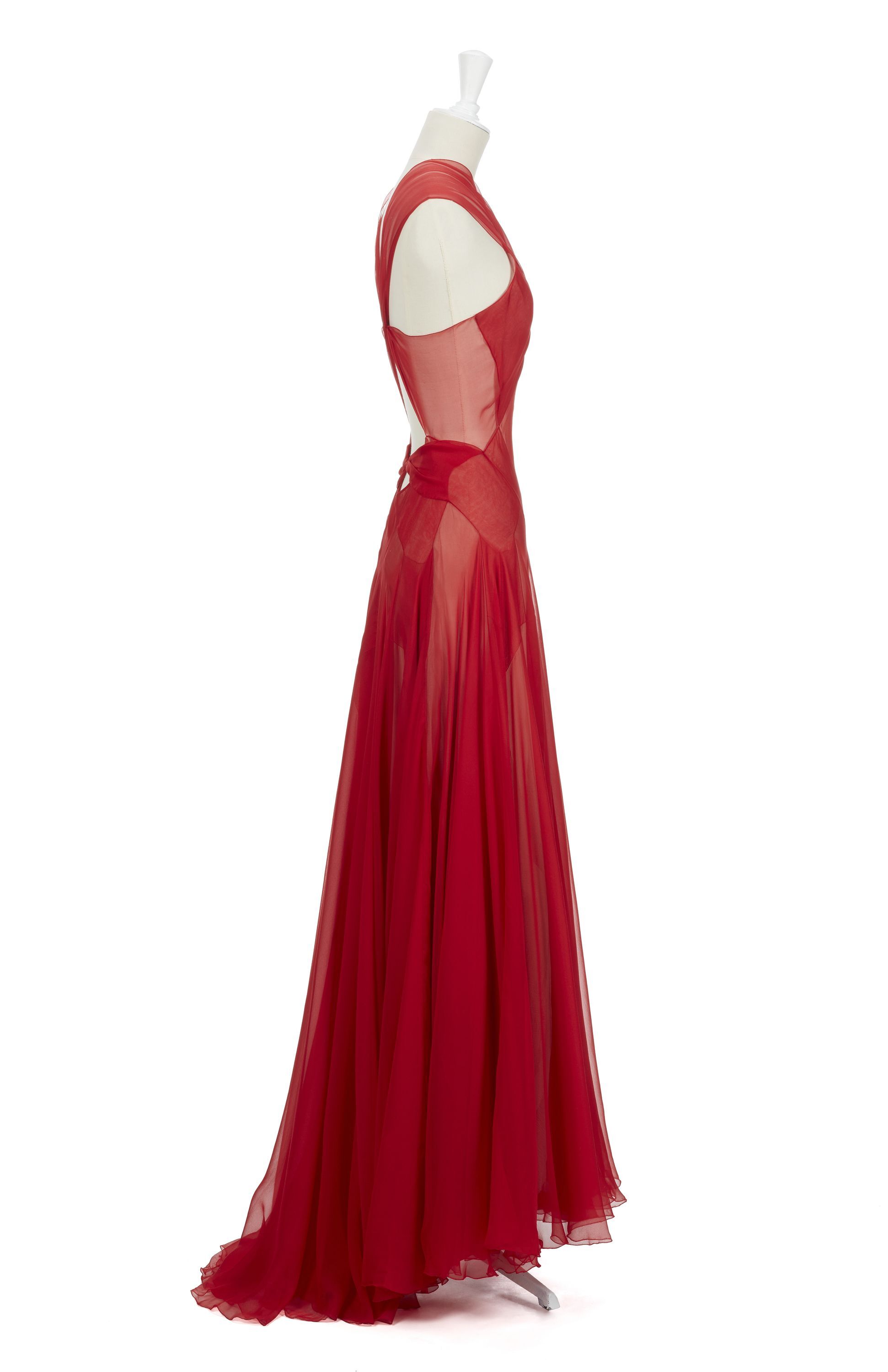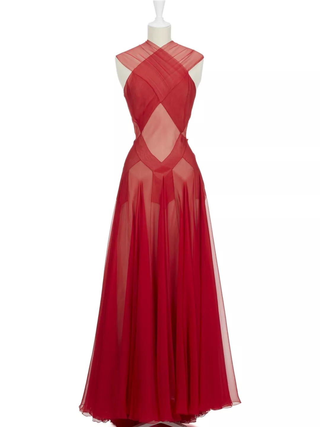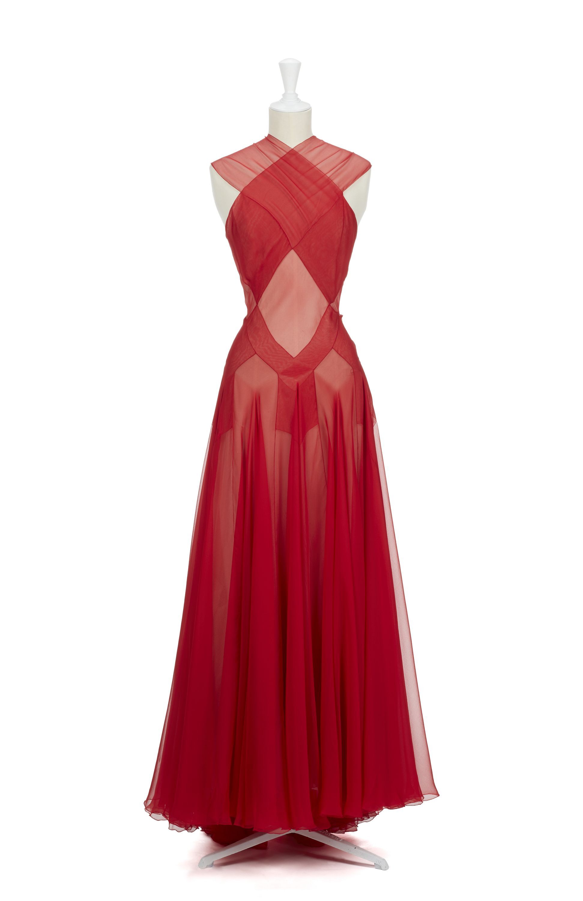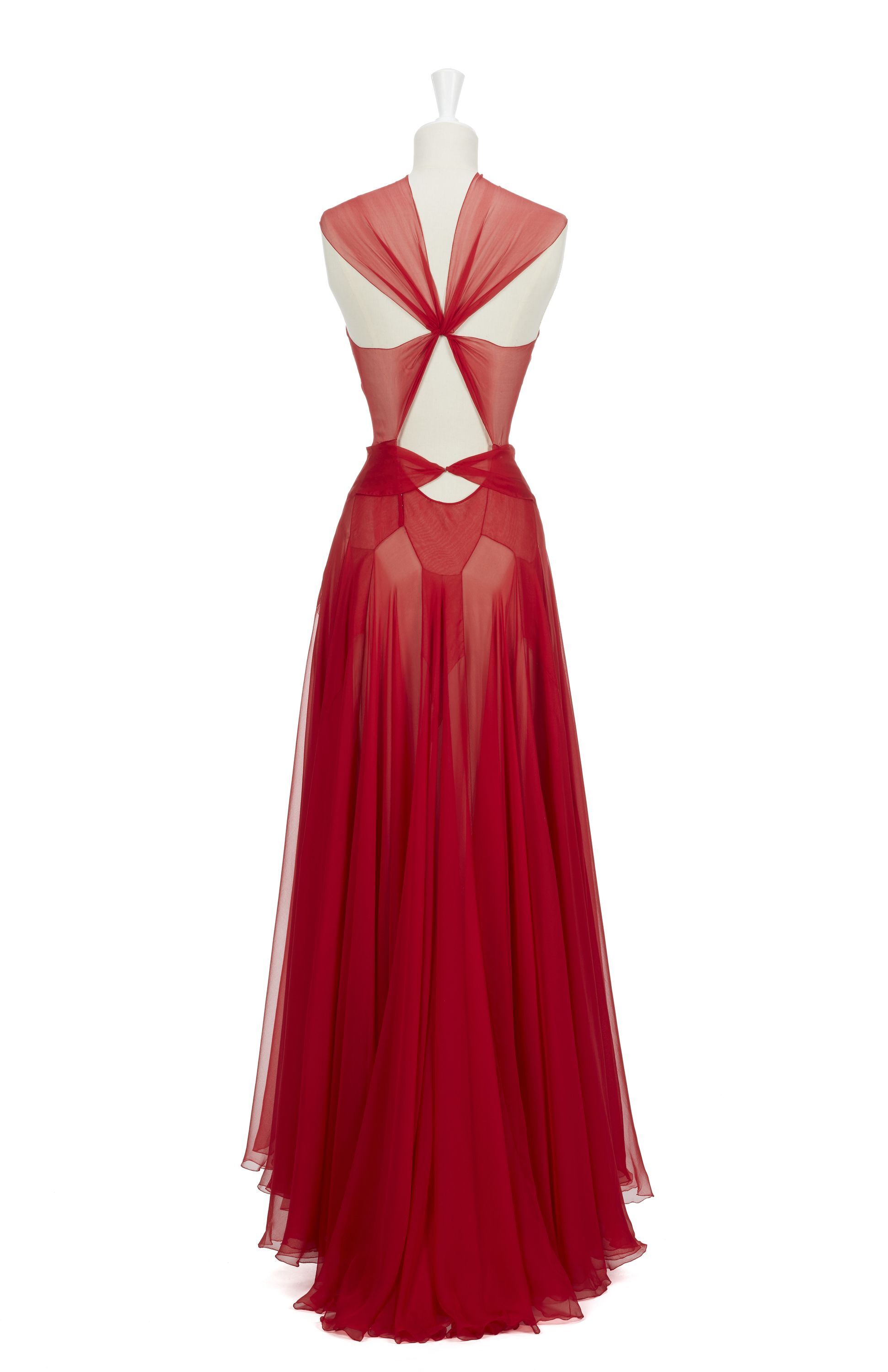 Azzedine Alaïa a toujours admiré l’œuvre de Madeleine Vionnet. La couleur rouge, la coupe en biais en mousseline de soie, les découpes en pointes, la nudité feinte et le dos nu au décolleté savant formé par des twists (tissu torsadé) sont autant d’hommages du créateur à la couturière.