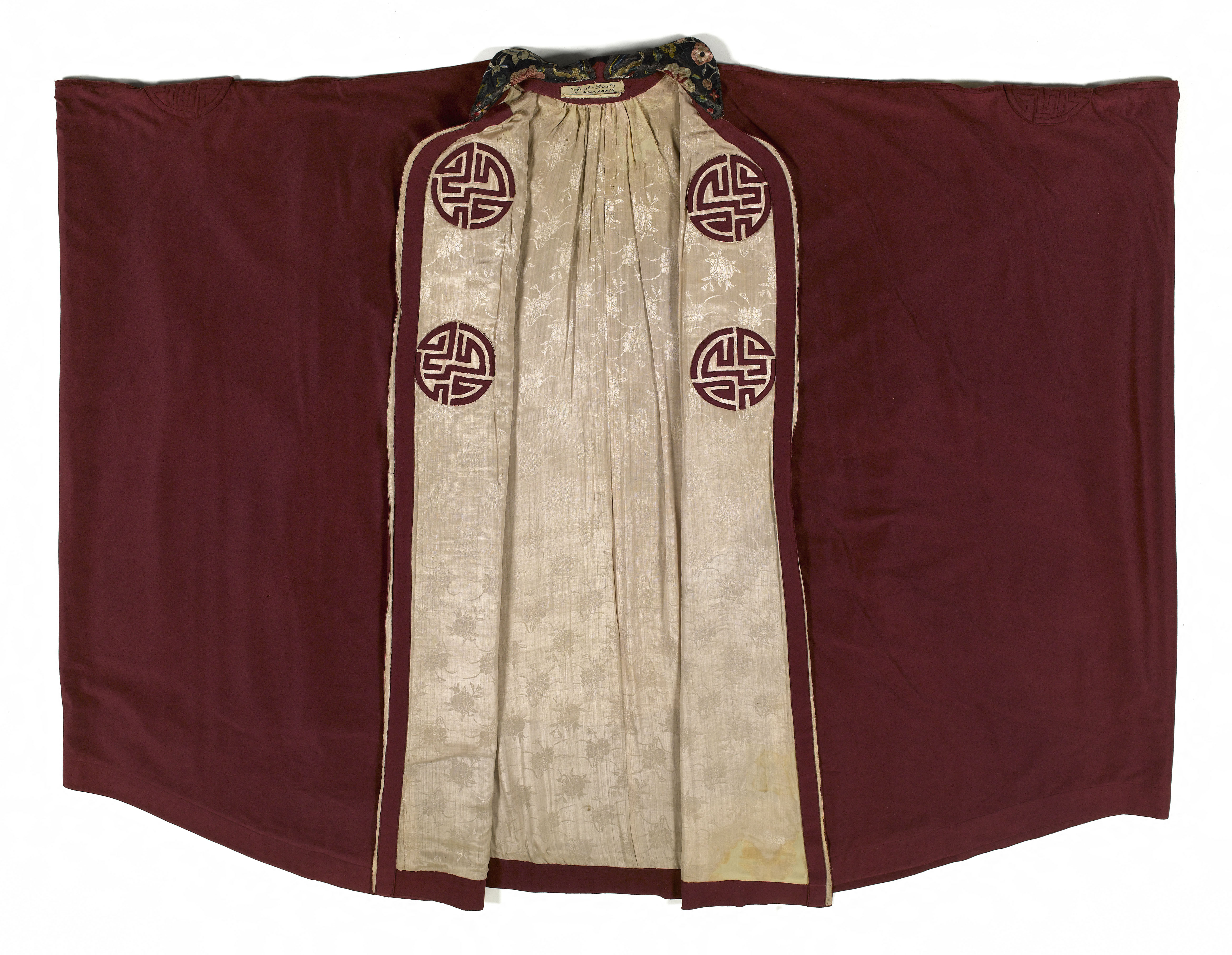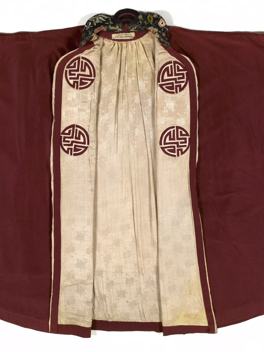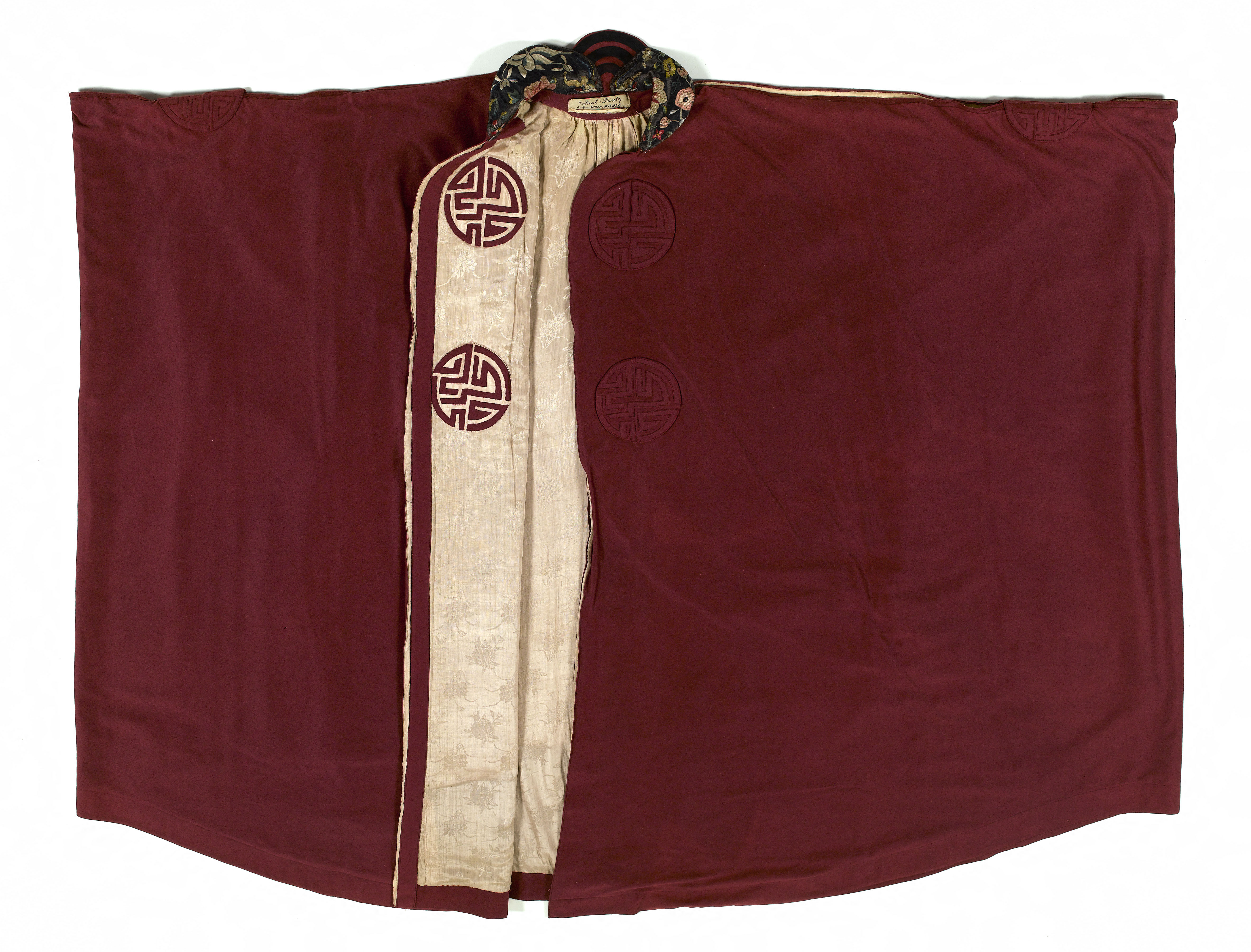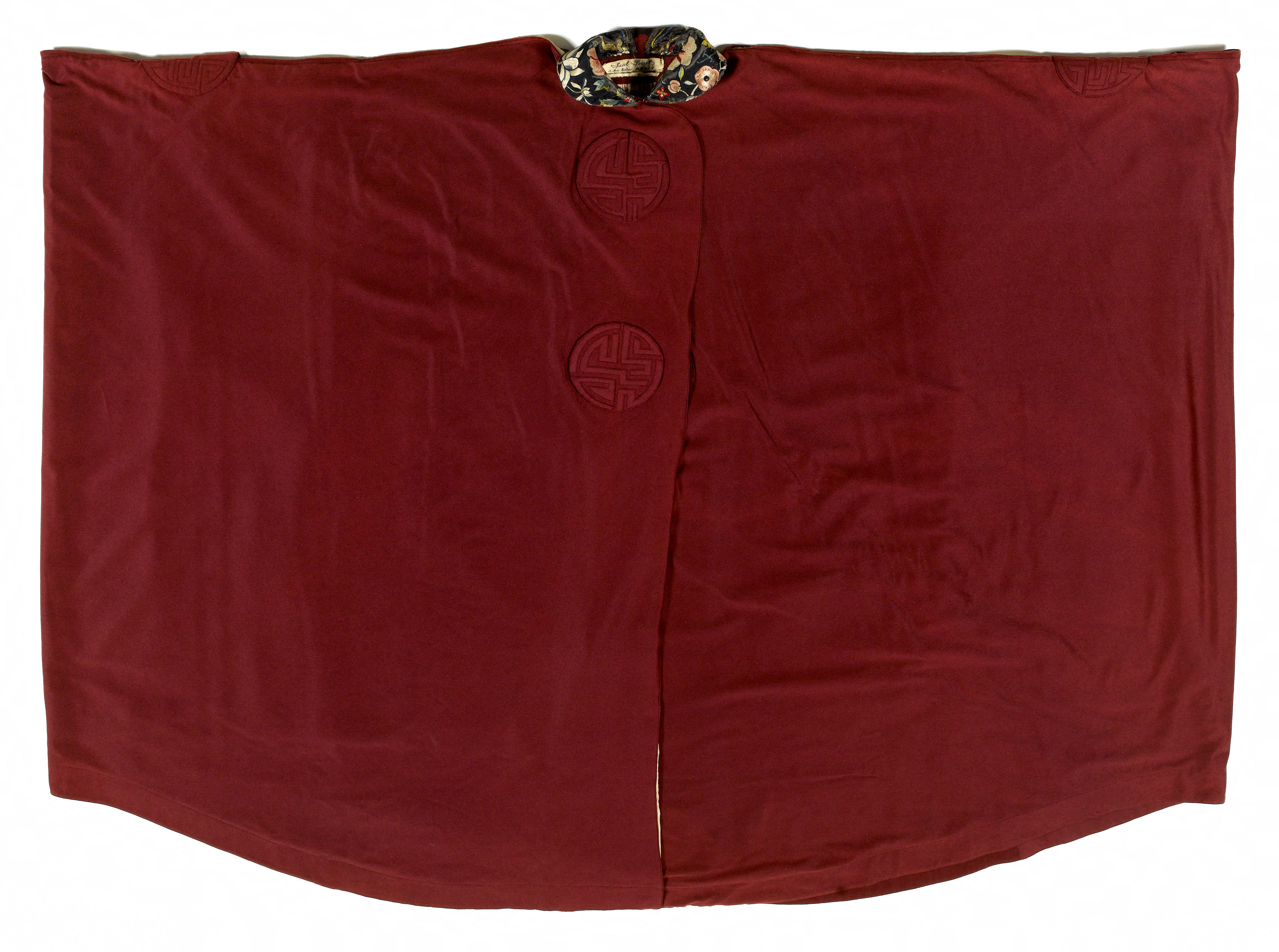 - Matériaux et techniques : Drap bordeaux, soie noire à broderies de fleurs en fils de soie multicolores d’origine chinoise. Doublure en façonné de soie ivoire ; applications de médaillons chinois en drap bordeaux.