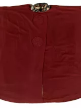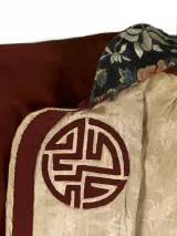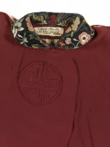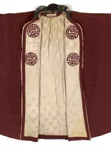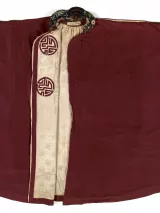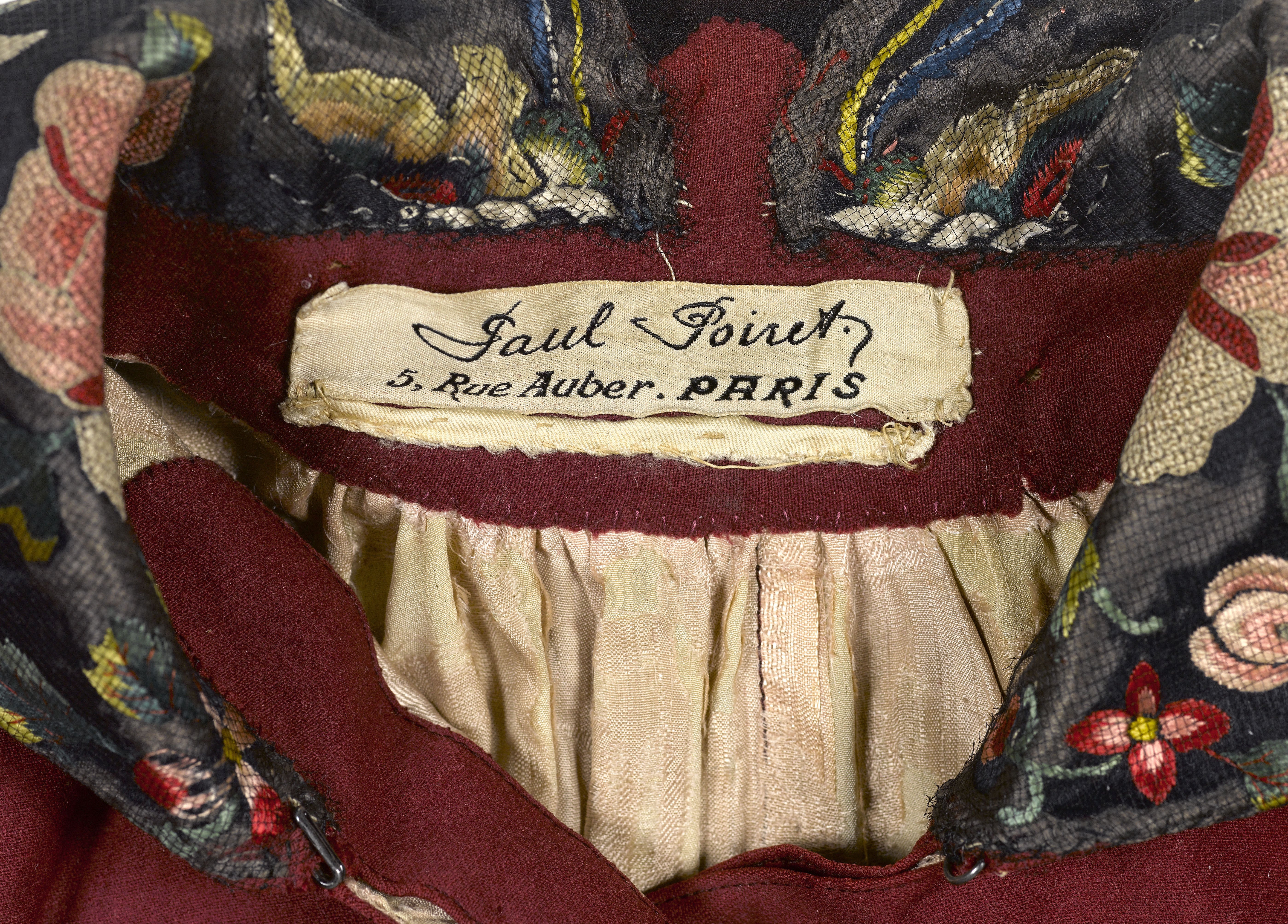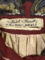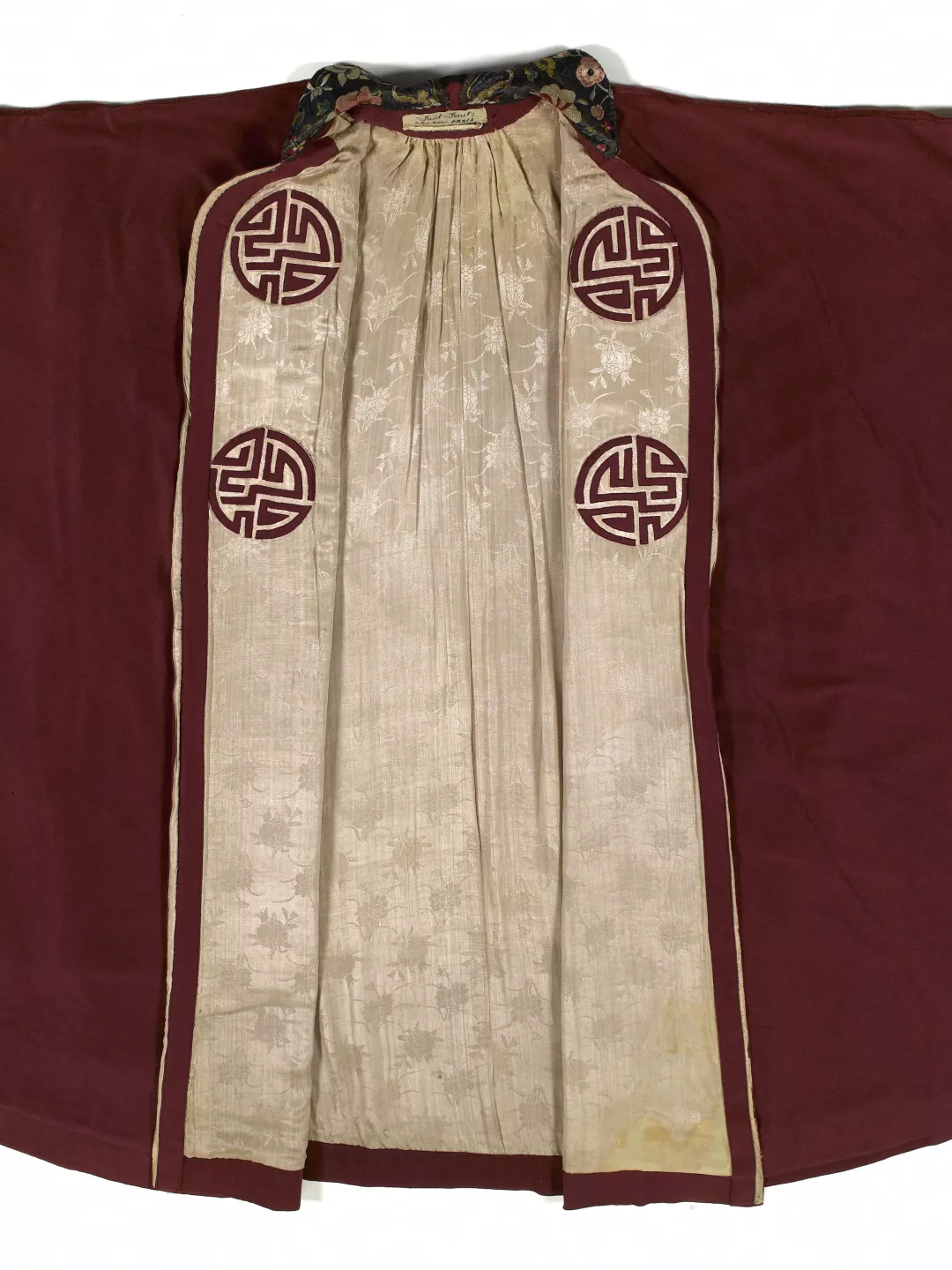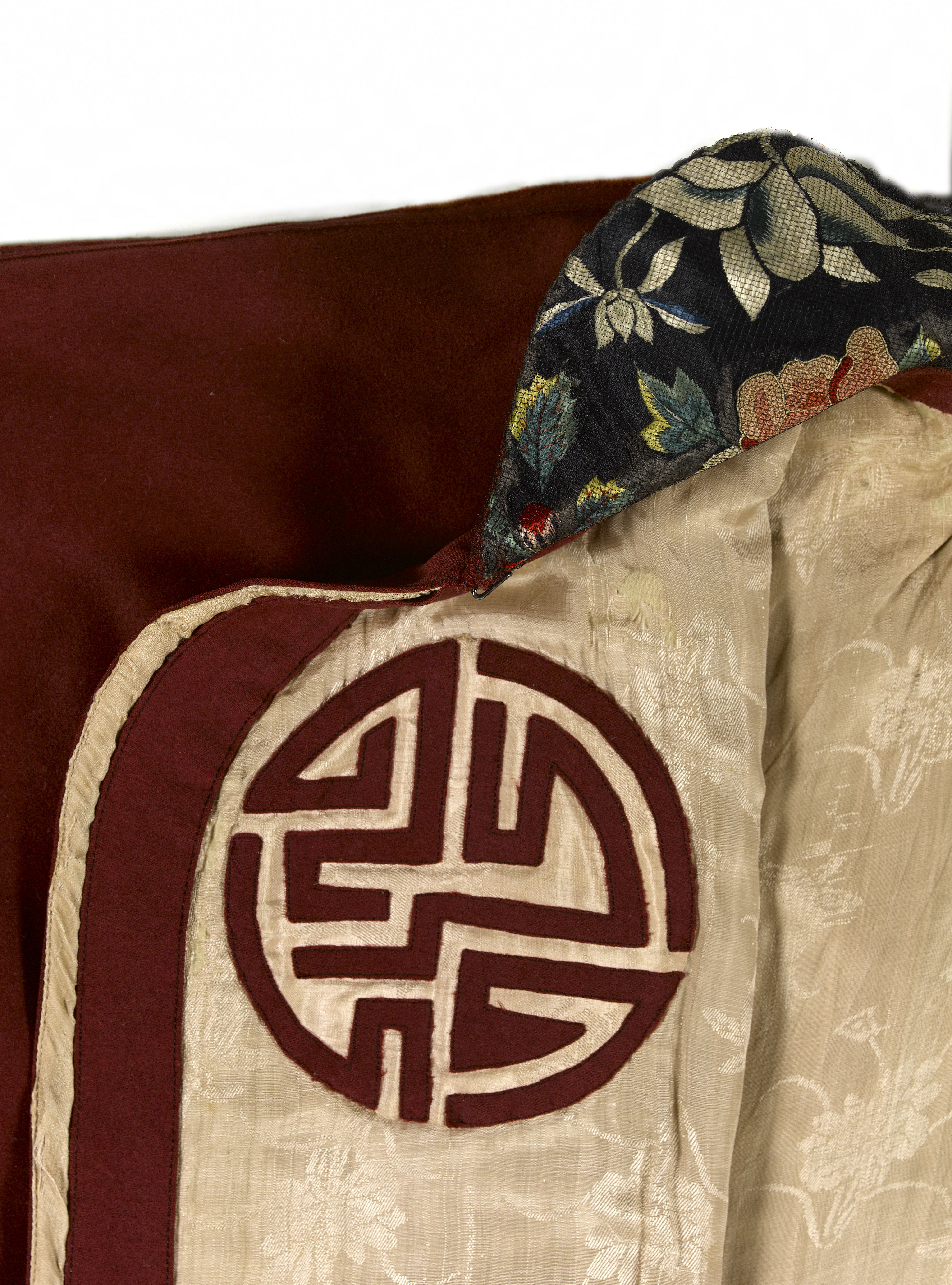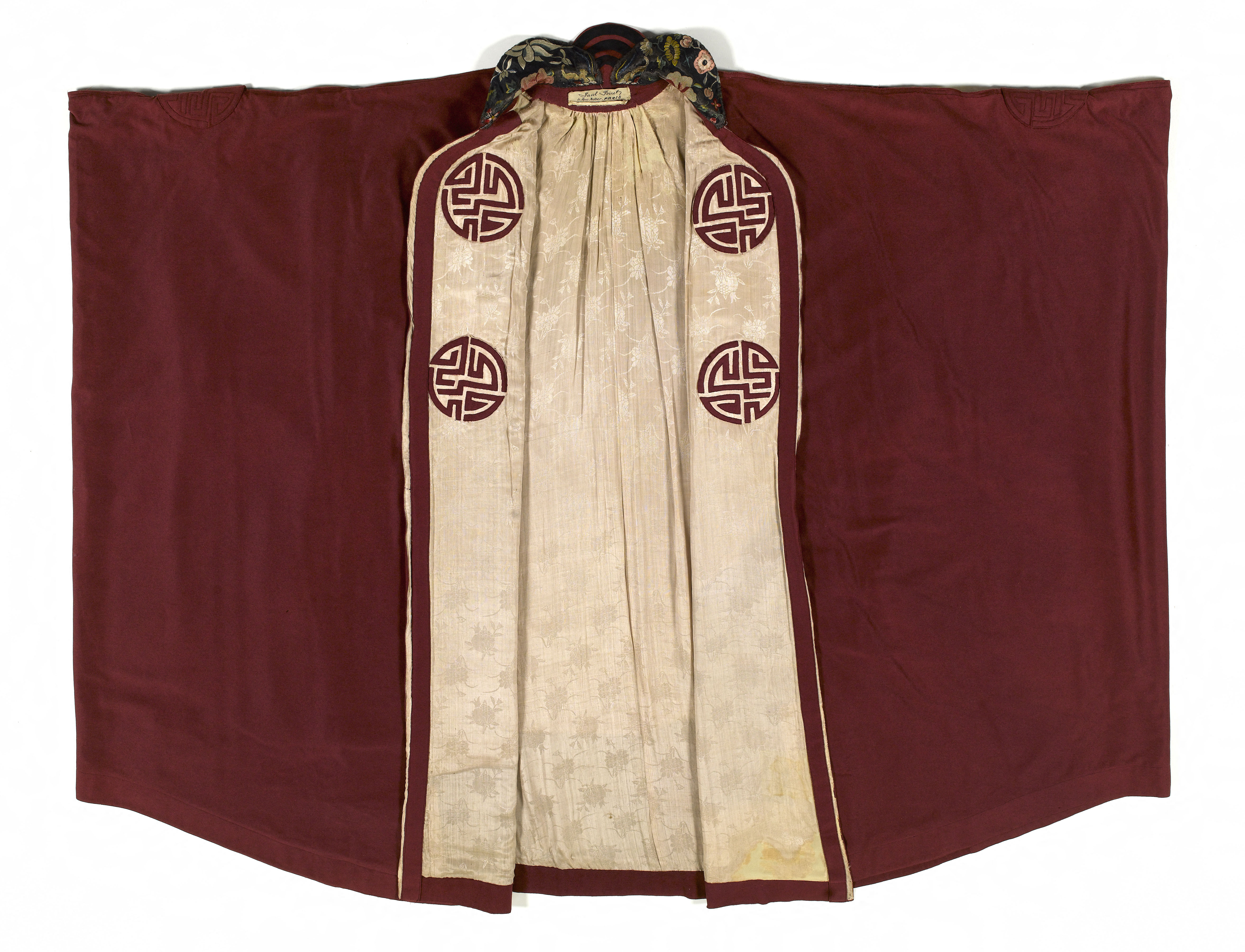 - Matériaux et techniques : Drap bordeaux, soie noire à broderies de fleurs en fils de soie multicolores d’origine chinoise. Doublure en façonné de soie ivoire ; applications de médaillons chinois en drap bordeaux.