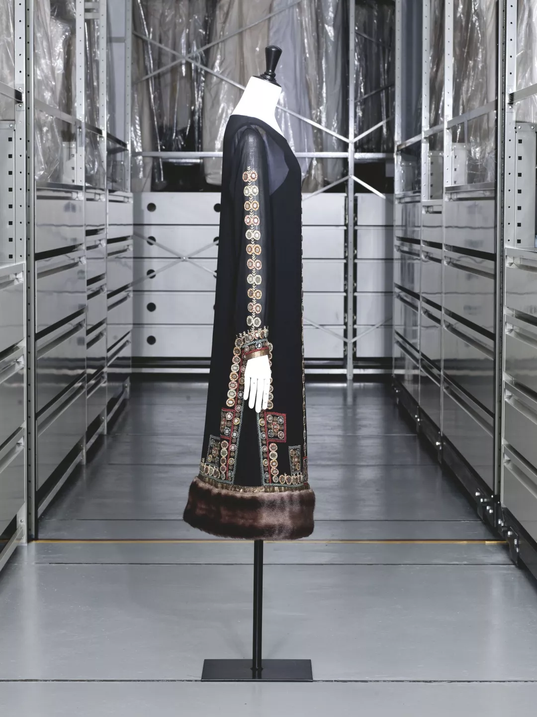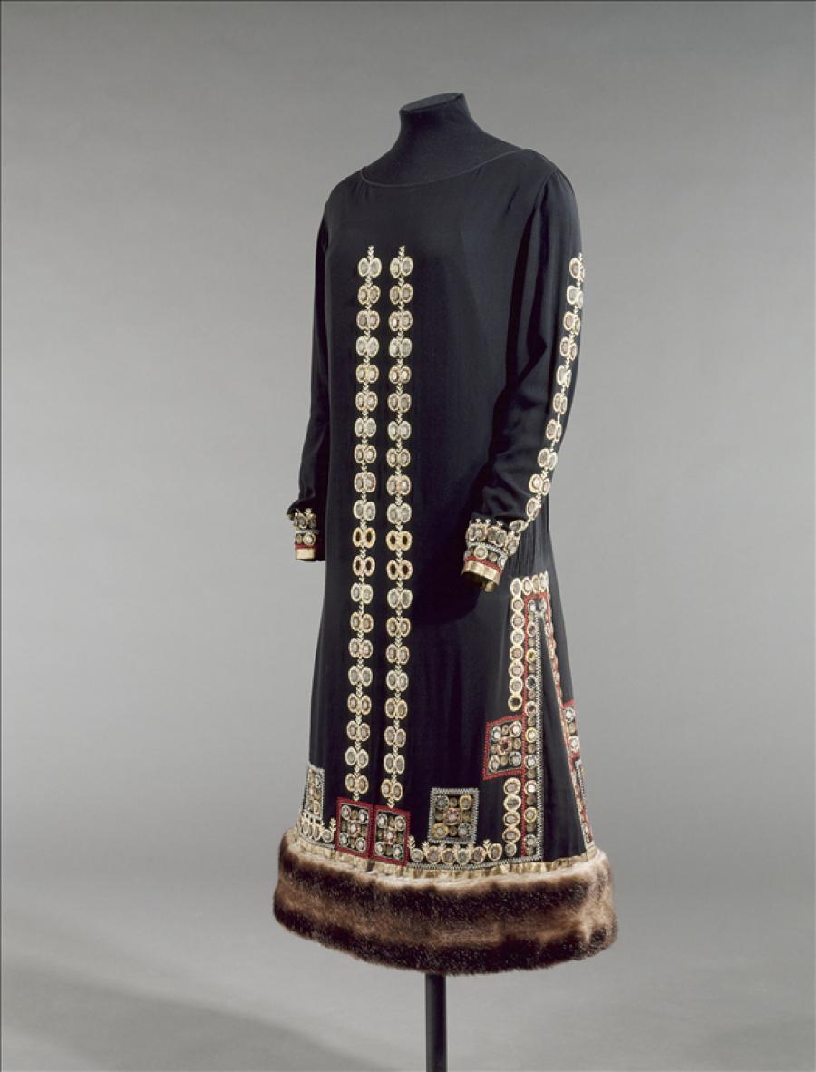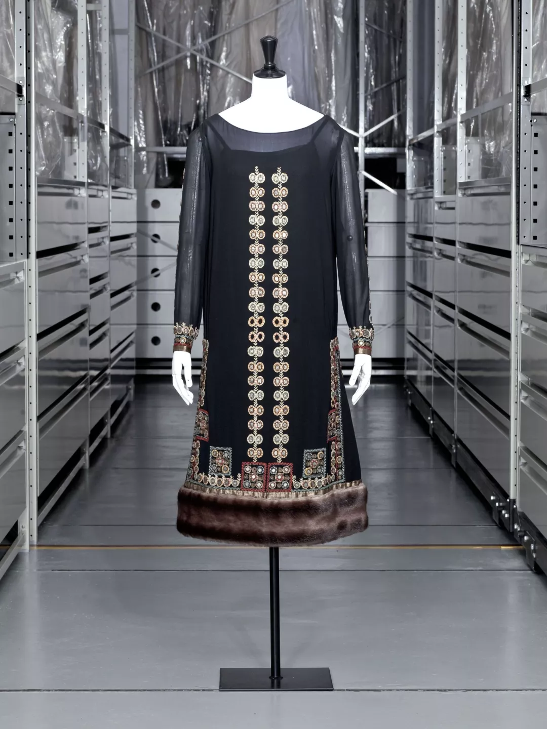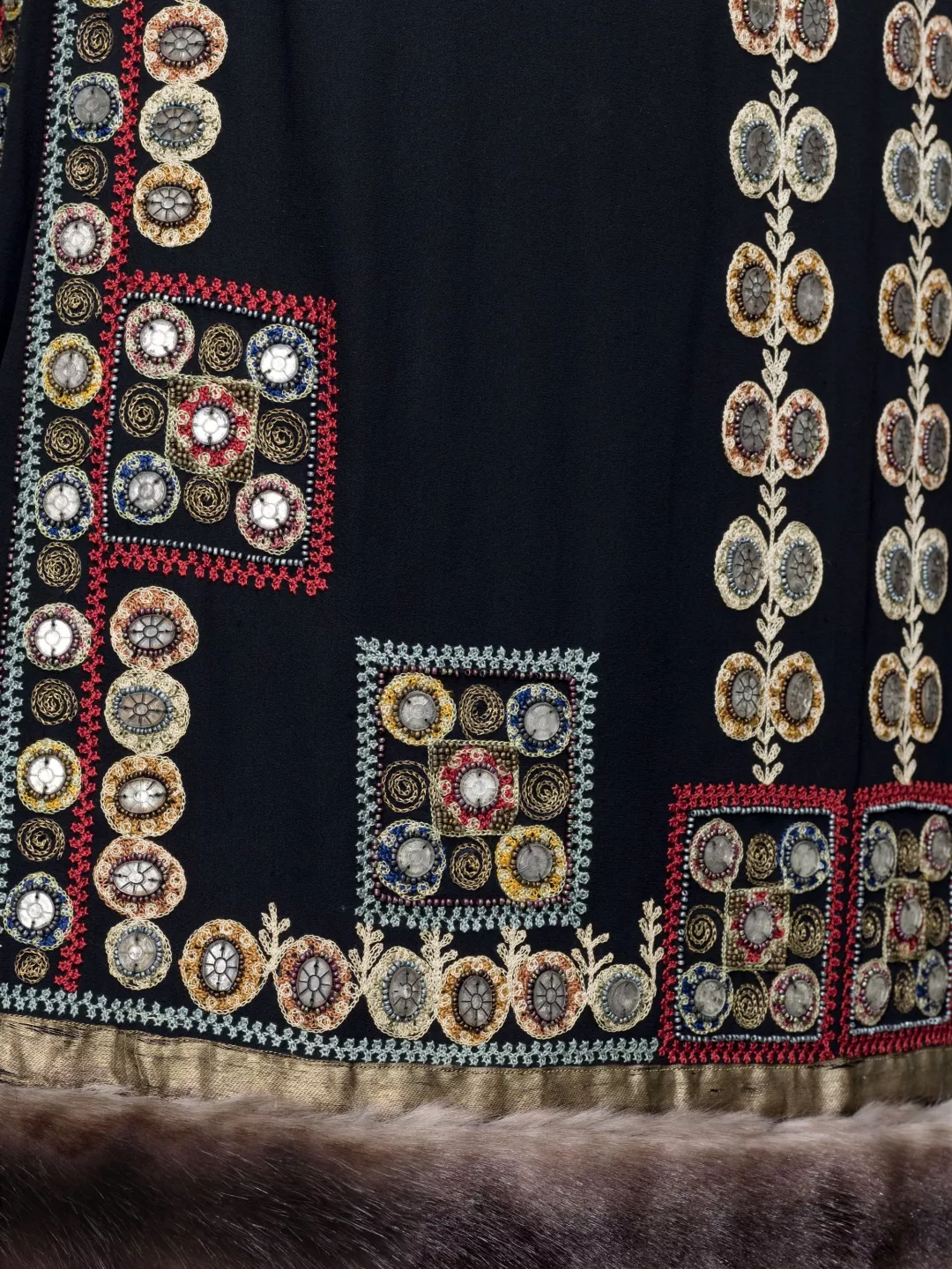 Les broderies géométriques, où alternent miroirs, perles et fils polychromes, accentuent la verticalité de la coupe de cette robe. À travers le répertoire décoratif et la garniture de fourrure se manifeste l’engouement très marqué de la couture de l’après-guerre pour le monde slave.