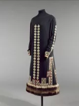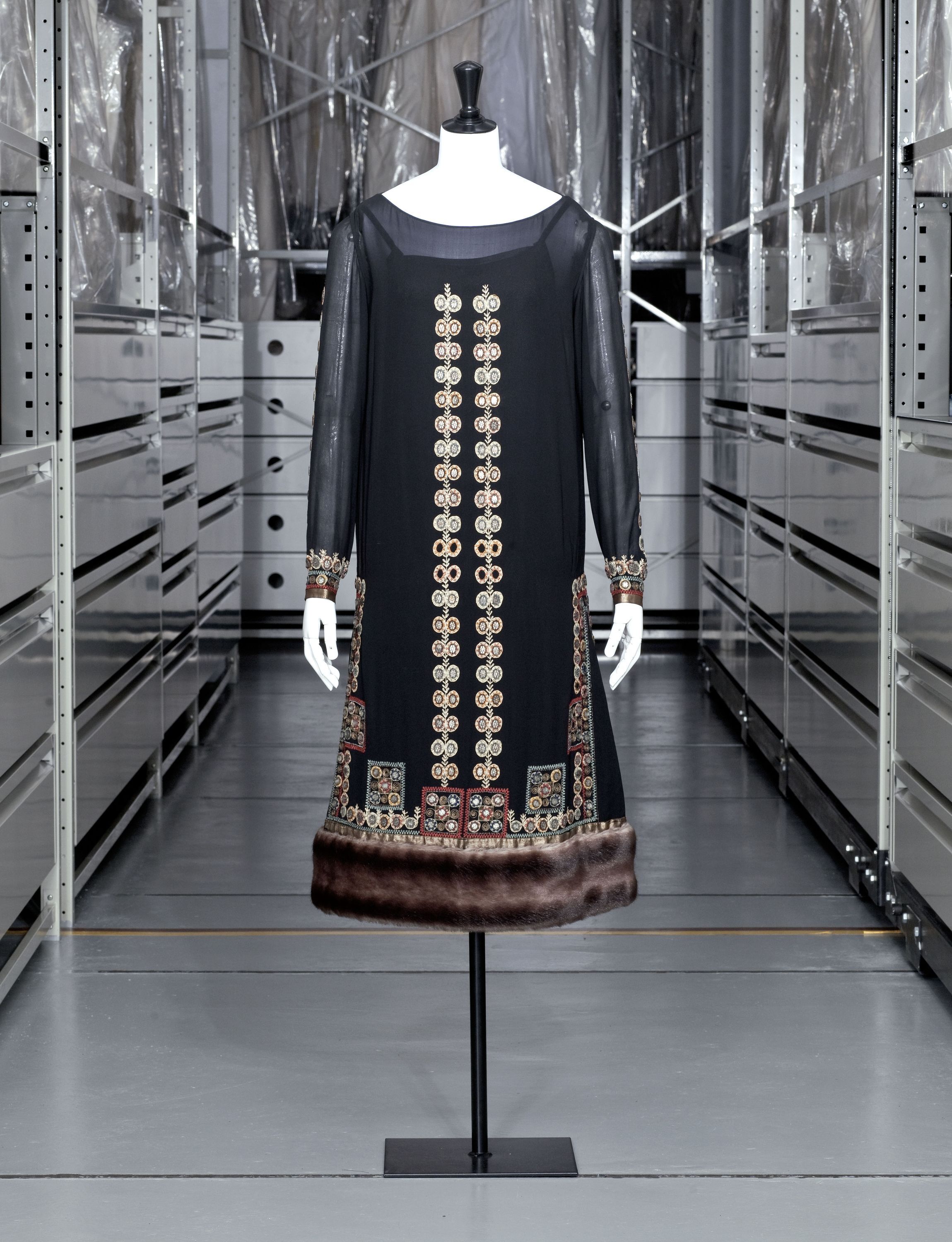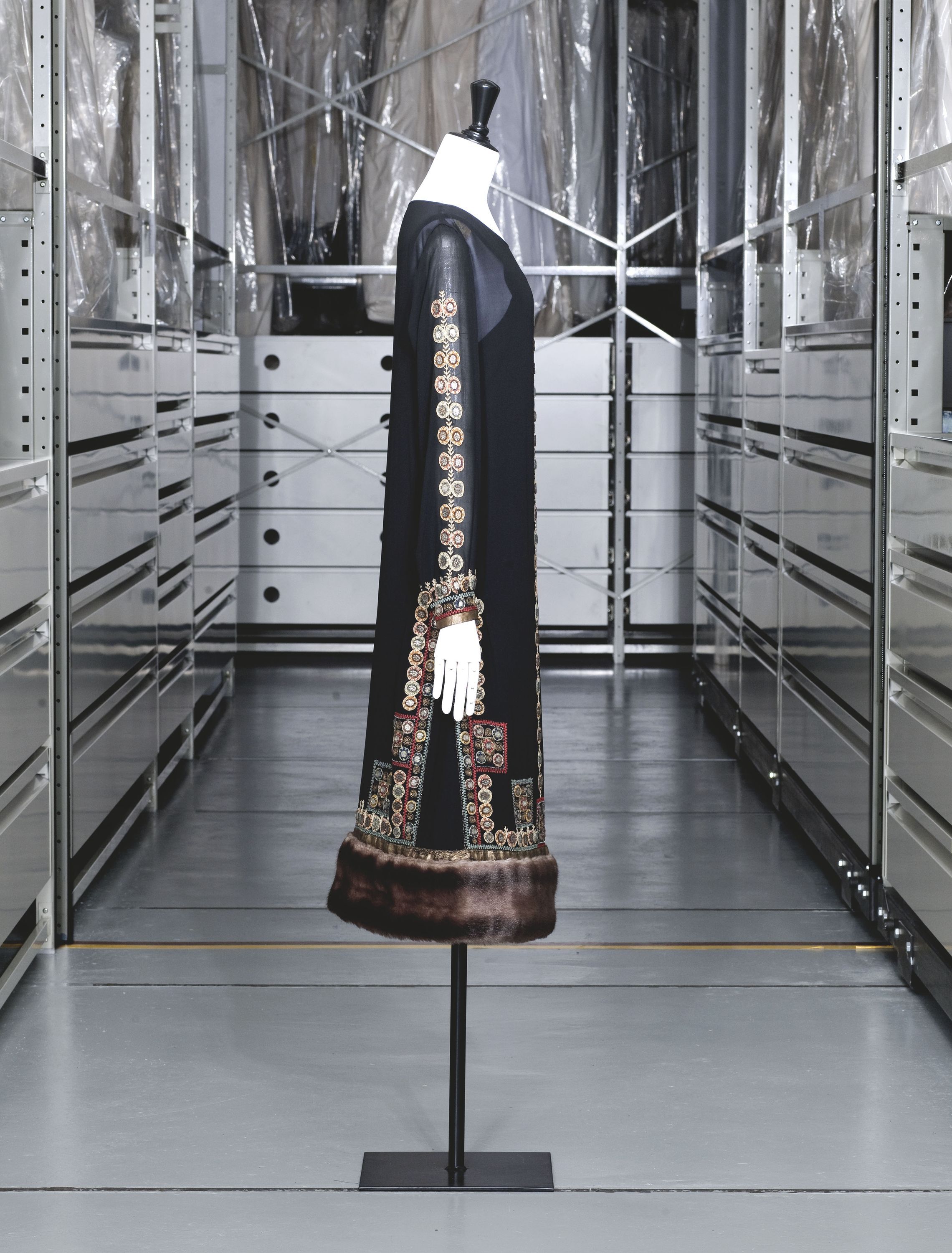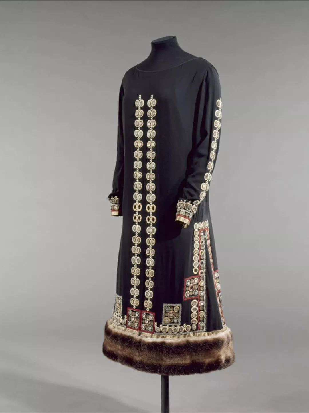 Les broderies géométriques, où alternent miroirs, perles et fils polychromes, accentuent la verticalité de la coupe de cette robe. À travers le répertoire décoratif et la garniture de fourrure se manifeste l’engouement très marqué de la couture de l’après-guerre pour le monde slave.