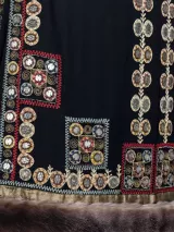 - Matériaux et techniques : Crêpe de soie noir, lamé or, broderies à l’aiguille de perles polychromes et de perles fantaisie transparentes, de fils métalliques or et de fils de soie polychromes au point de chaînette ; miroirs ; fourrure.