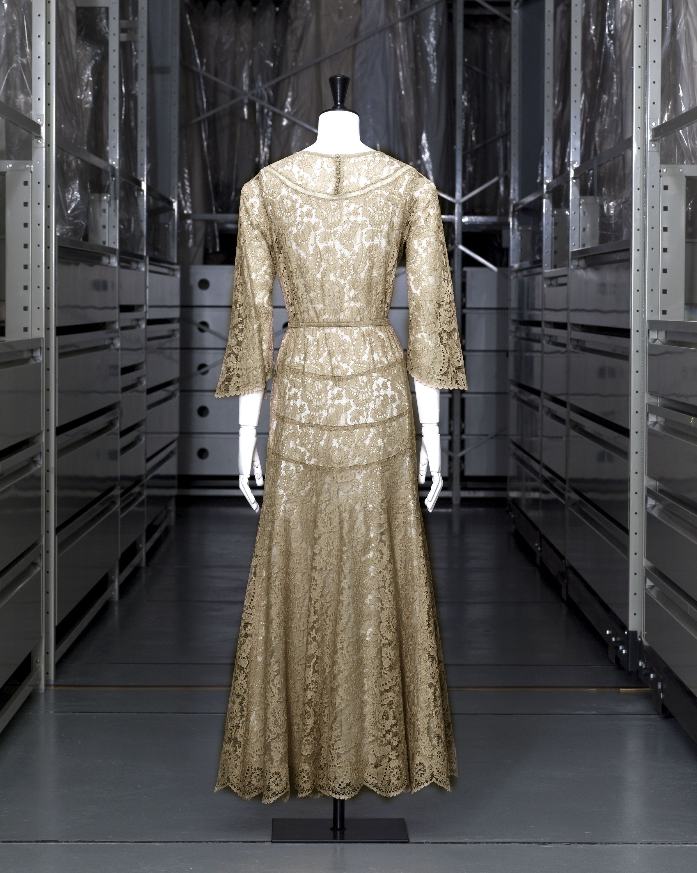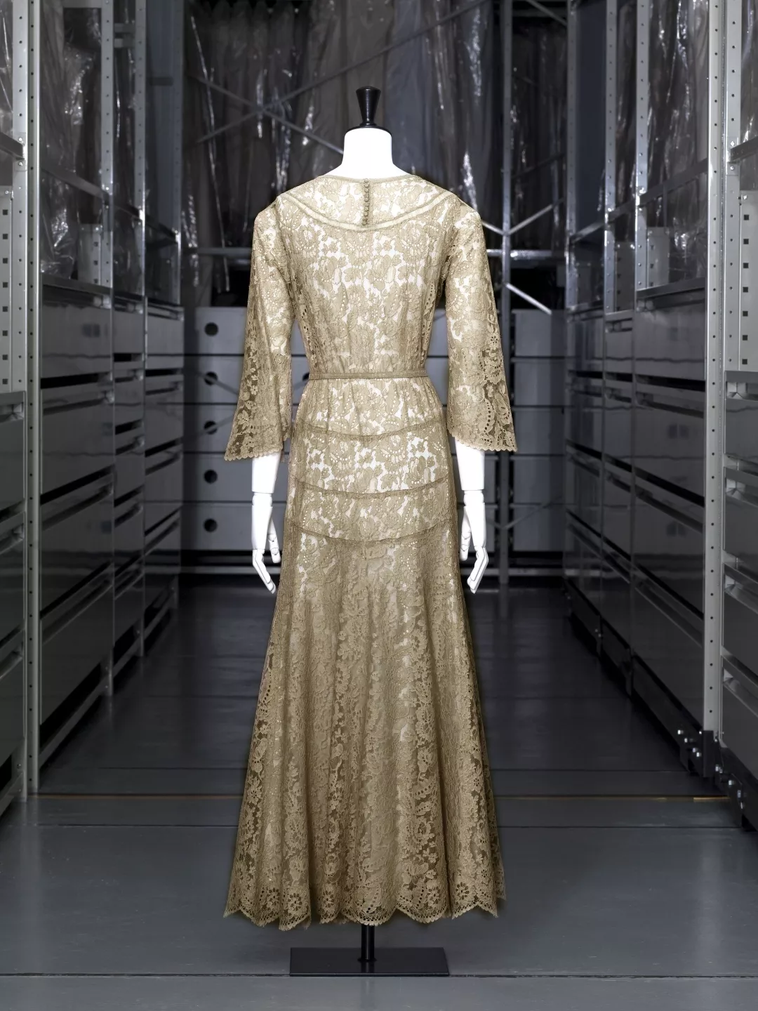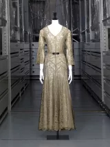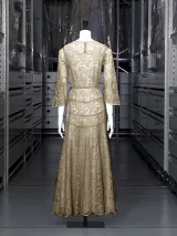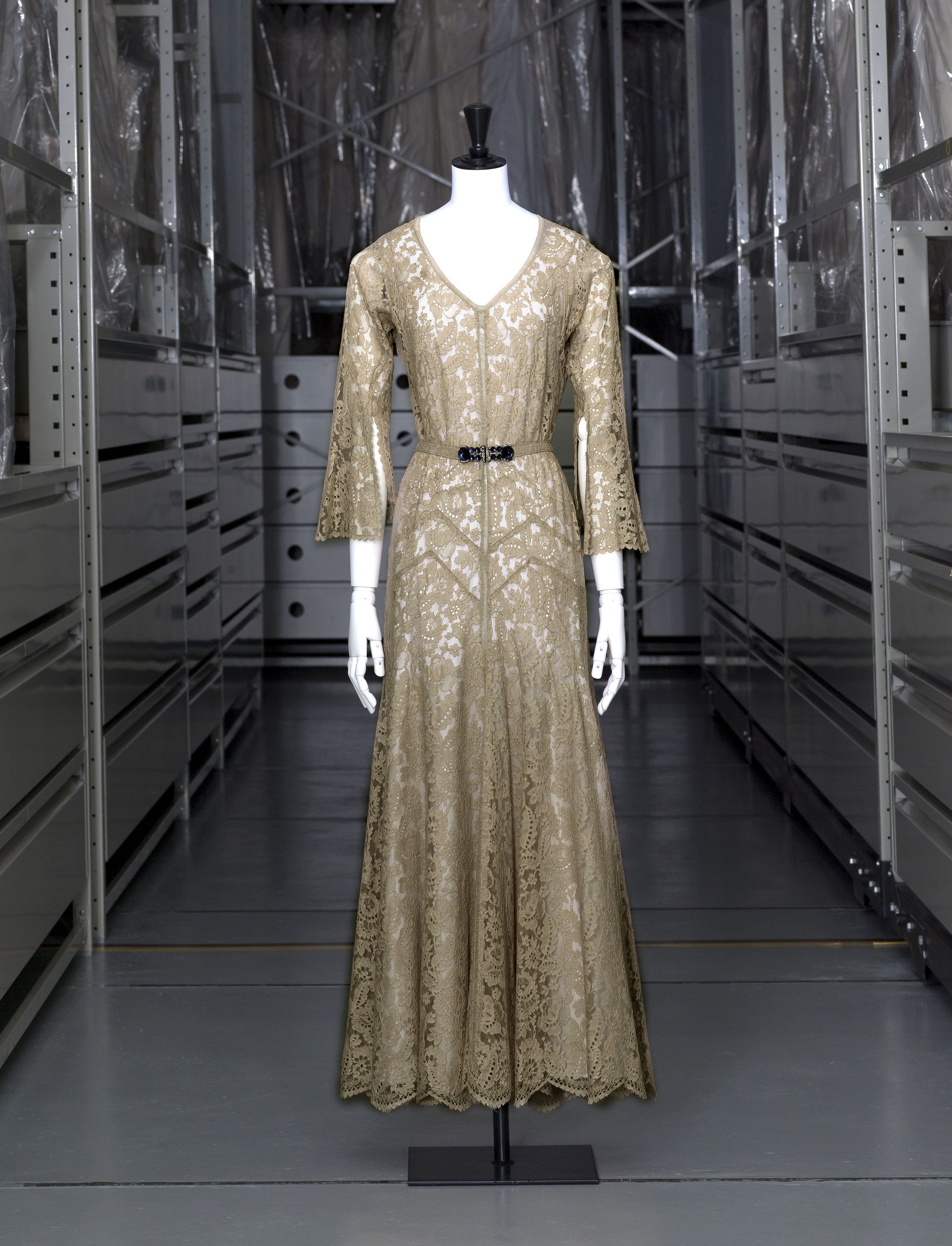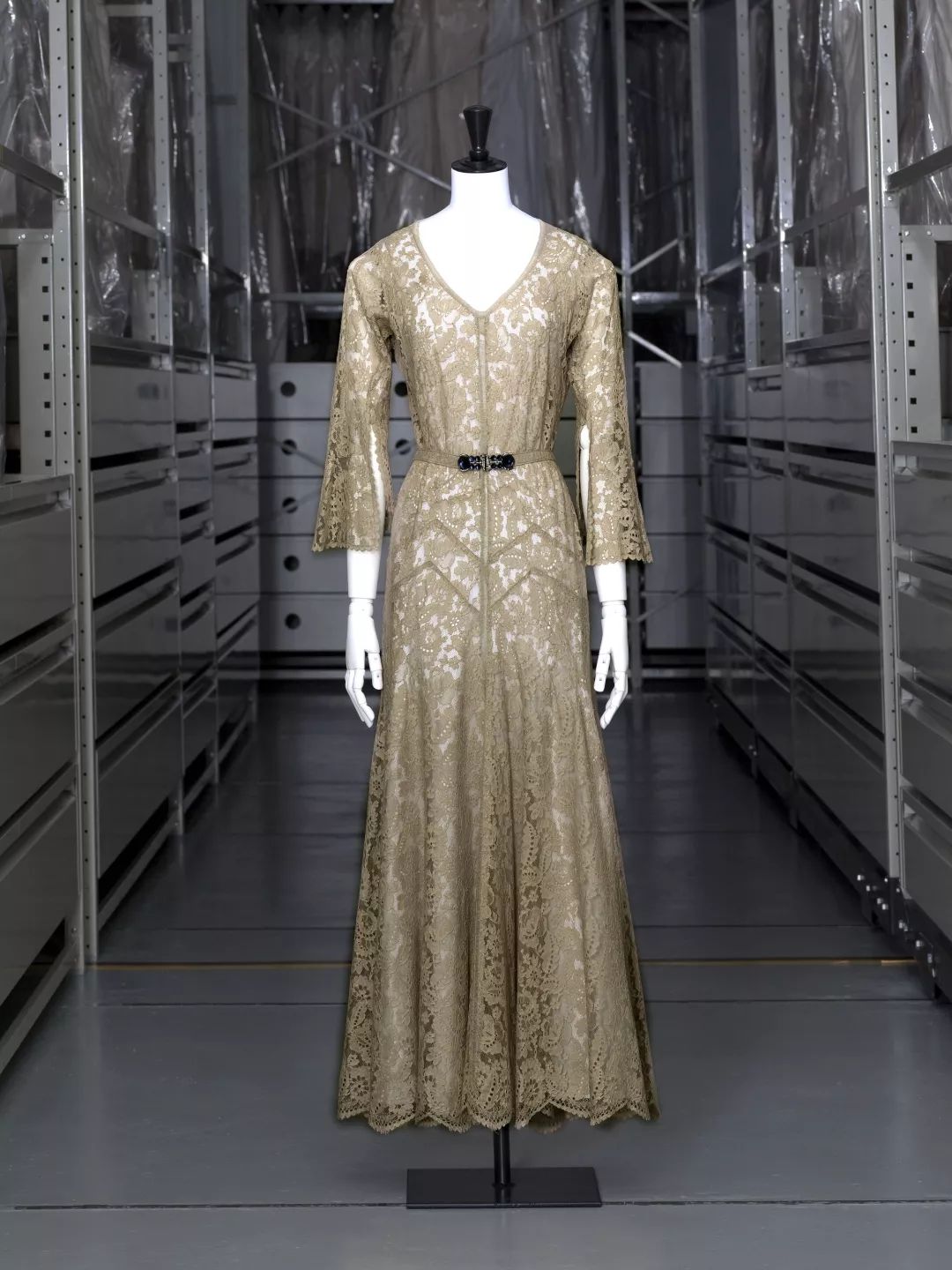 Grande rivale d’Elsa Schiaparelli qu’elle appelait « l’Italienne qui fait des robes », Gabrielle Chanel impose dans les années 1930 un style sophistiqué. Ses longues robes du soir monochromes, en tulle et dentelle, contribuent alors à établir sa renommée. Le photographe François Kollar la photographie portant ses propres modèles dans son salon du Ritz vers 1938. La ceinture vient ici discrètement rappeler le goût de Chanel pour les bijoux. Cette robe provient de la garde-robe de l’épouse d’Henry Viguier, président-directeur général du Bazar de l’Hôtel de Ville.