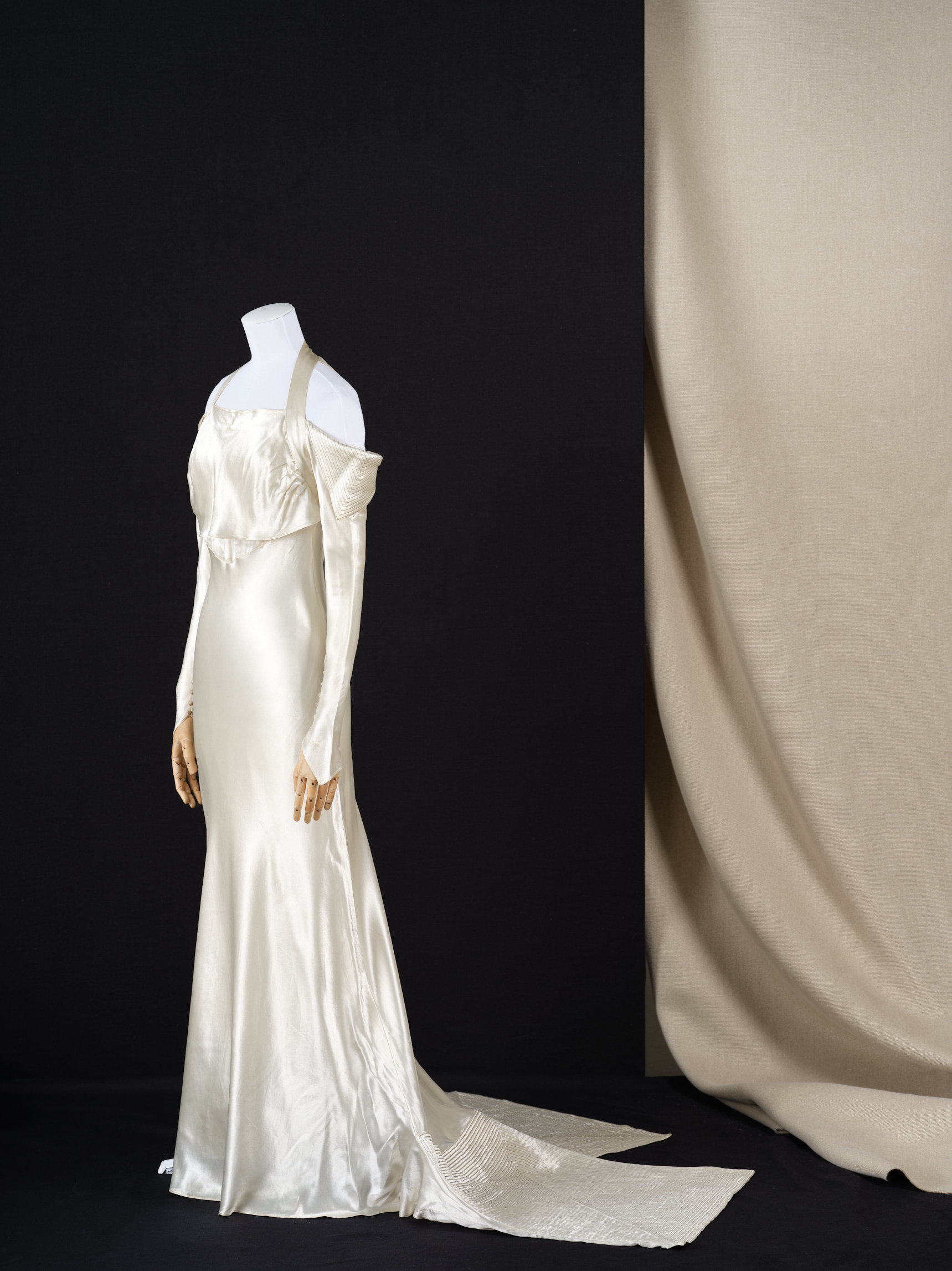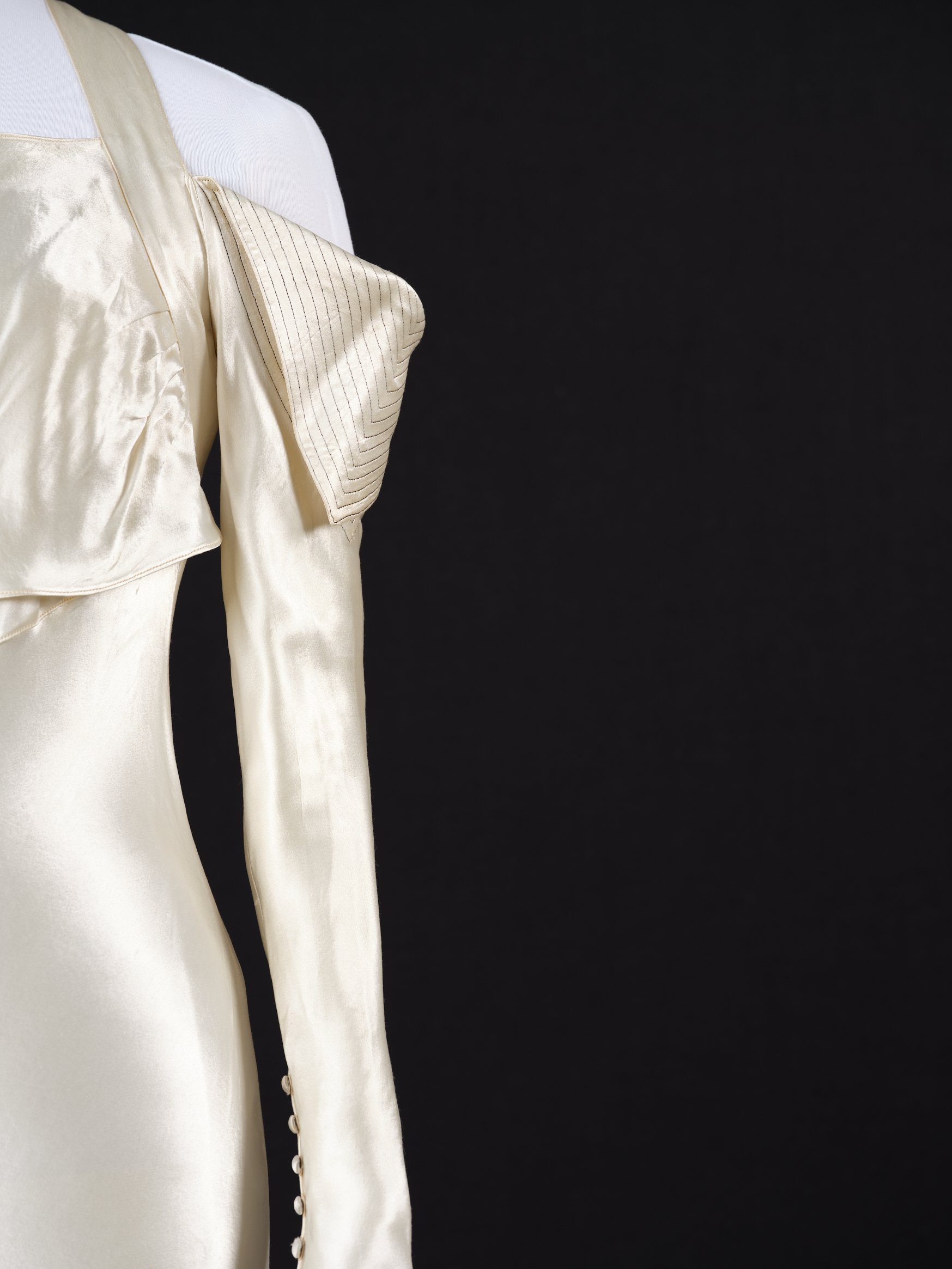 - Matériaux et techniques : Satin de fibres artificielles blanc, surpiqûres de fils métalliques