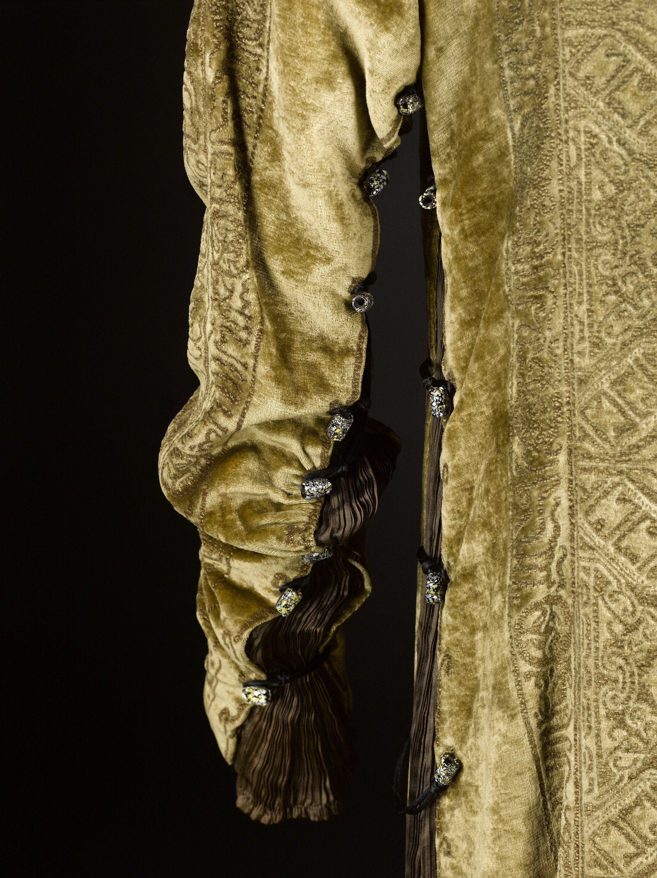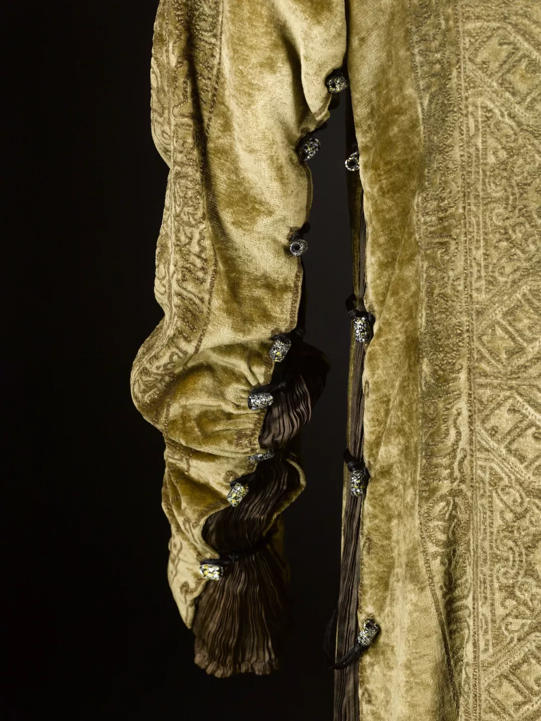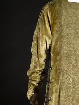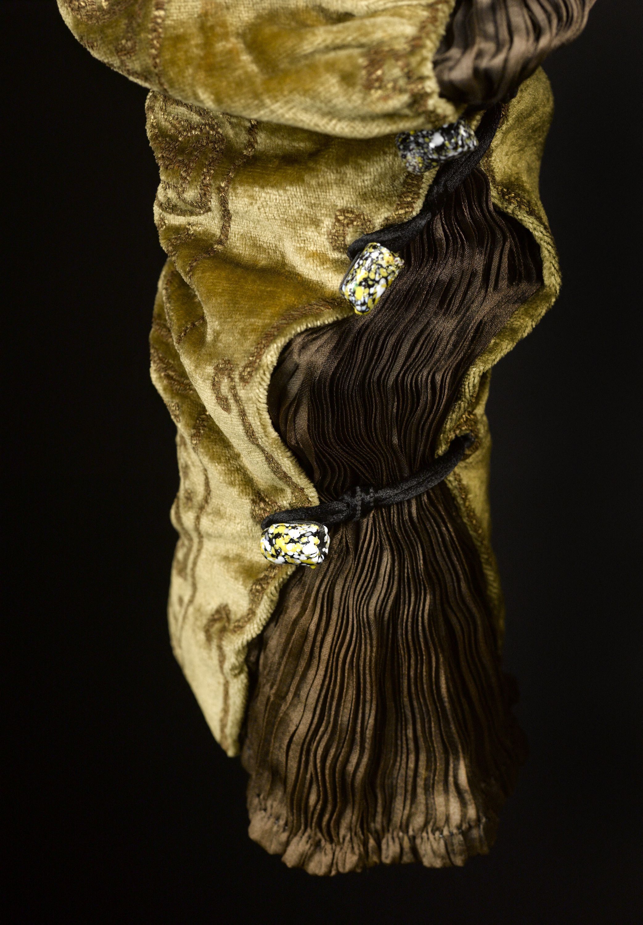- Matériaux et techniques : Velours de soie bronze-vieil or imprimé or. Toile de soie marron plissée. Cordonnet de soie noire, perles en verre noires, blanches et jaunes. Doublure en toile de soie vieil or.