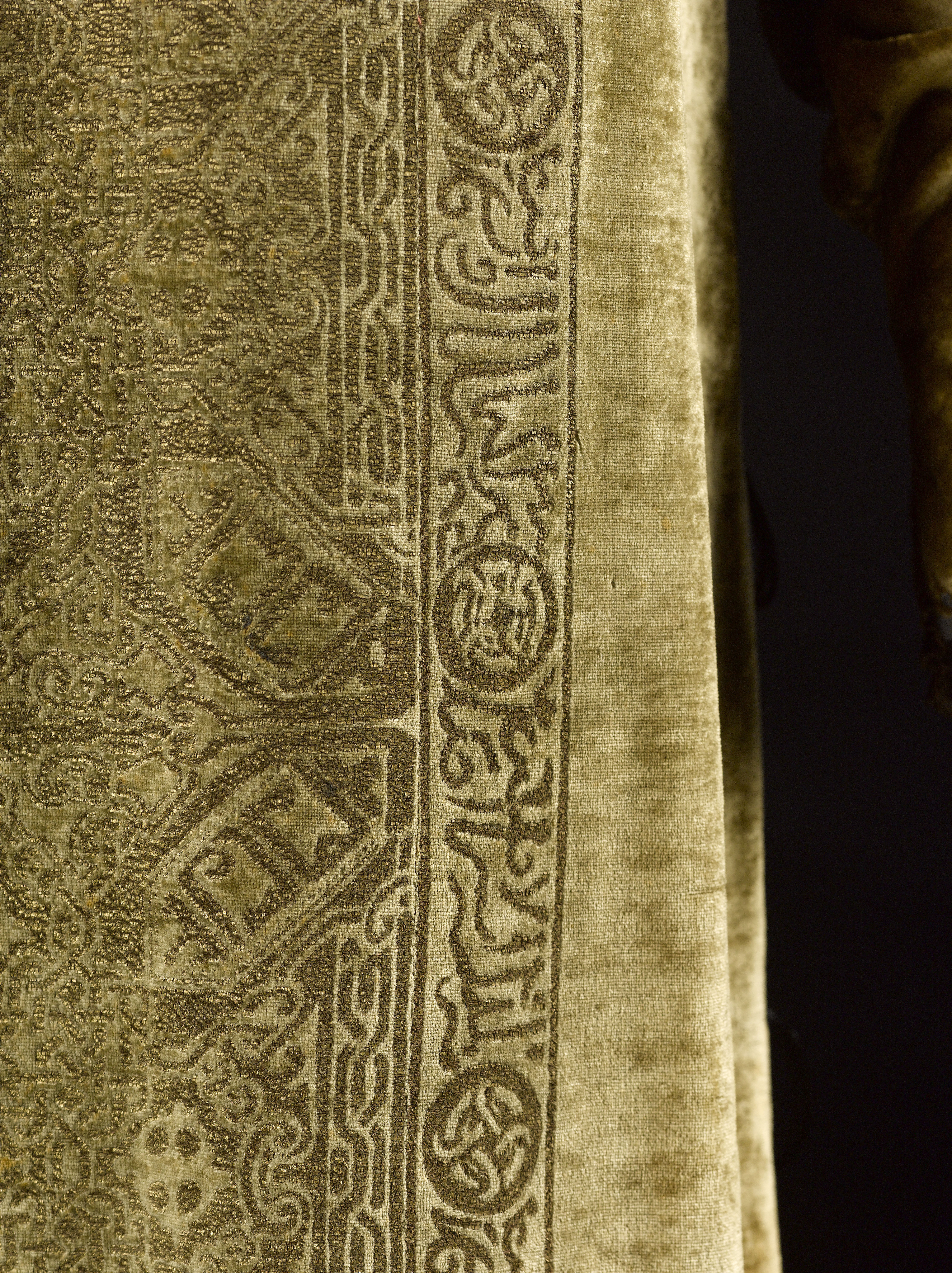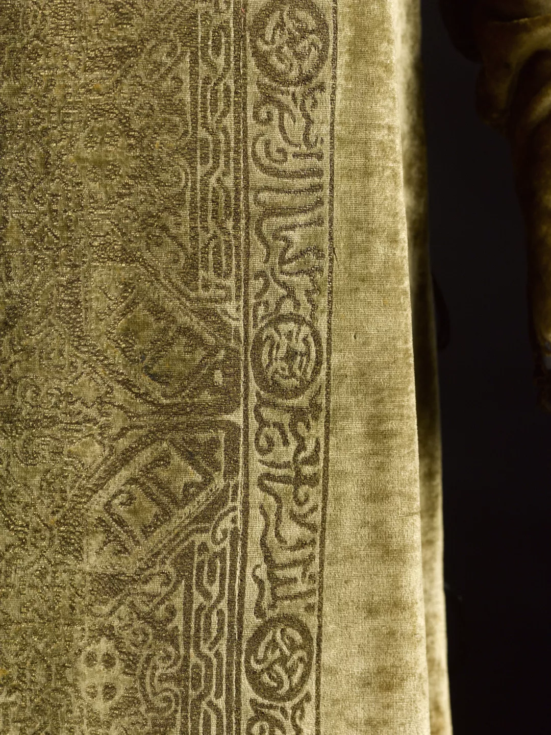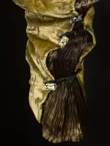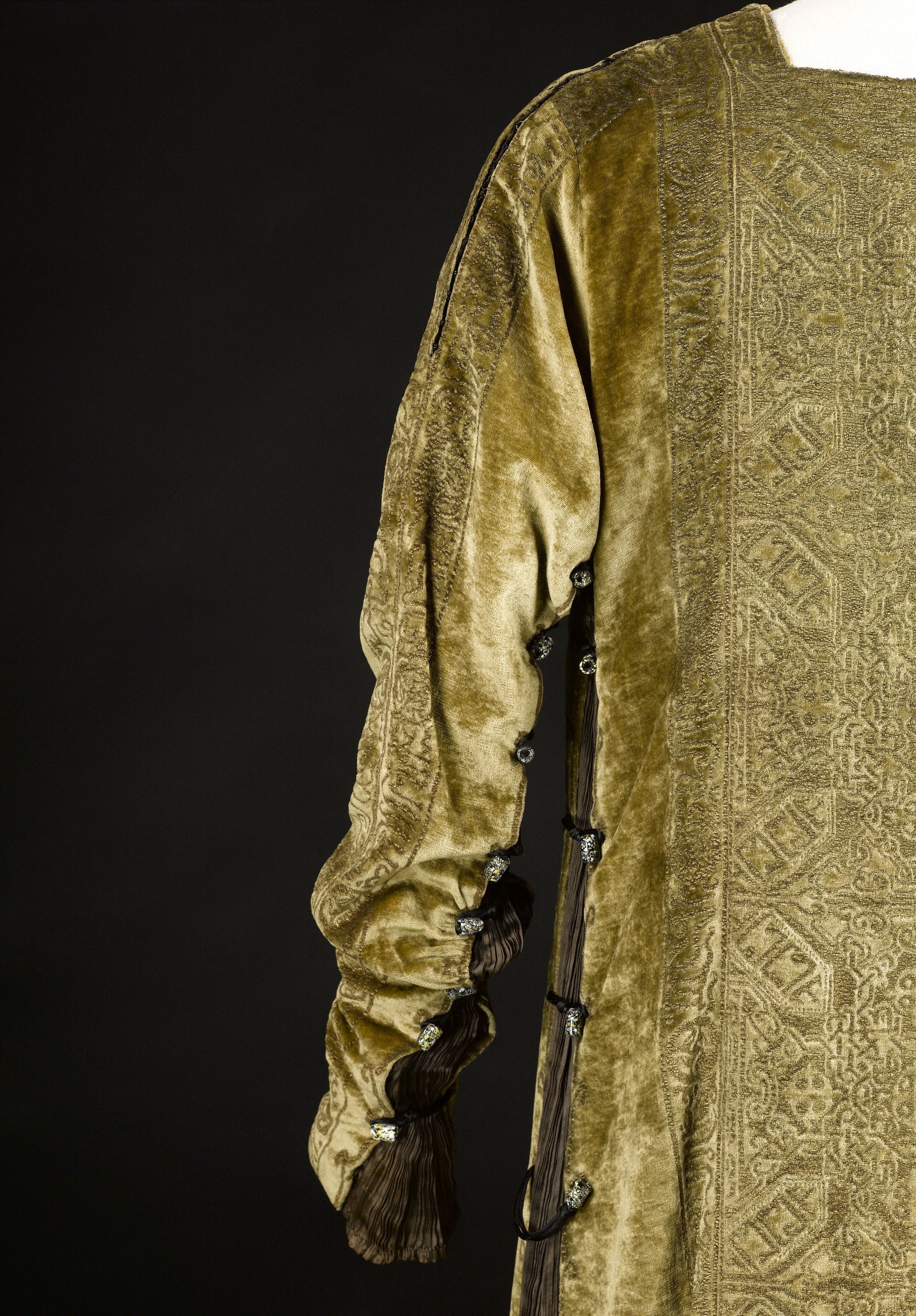 - Matériaux et techniques : Velours de soie bronze-vieil or imprimé or. Toile de soie marron plissée. Cordonnet de soie noire, perles en verre noires, blanches et jaunes. Doublure en toile de soie vieil or.
