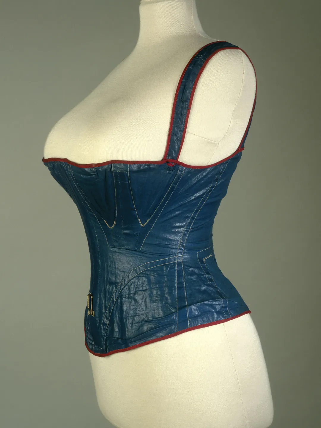 Ce corset de sport a une valeur documentaire exceptionnelle. On peut, grâce à lui, nuancer la lecture des goûts d’une époque en le comparant à ses équivalents. Il nous permet de mesurer les écarts de style qui s’échelonnent entre les tenues formelles, élégantes, et les vêtements pratiques. Il est rendu plus confortable qu’un corset de jour par ses larges bretelles et, en prévision des mouvements de la gymnaste, un renfort a été placé milieu dos dont le fond est arrondi. Le busc frontal est doublé et six fanons de baleines forment deux goussets pour accueillir la poitrine. Le jupon peut être fixé par un crochet métallique – ce qui se retrouve dans tous les corsets du moment. La toile de coton bleu est glacée et bordée d’une tresse de laine rouge. La structure de la pièce, le baleinage, se dessinent parfaitement sous le bleu uni : la technicité du corset devient un motif. Il est intéressant de noter que les codes visuels du vêtement sportif – couleurs dynamiques, contrastées, simples et voyantes, se mettent en place dès la spécialisation de ce vestiaire.