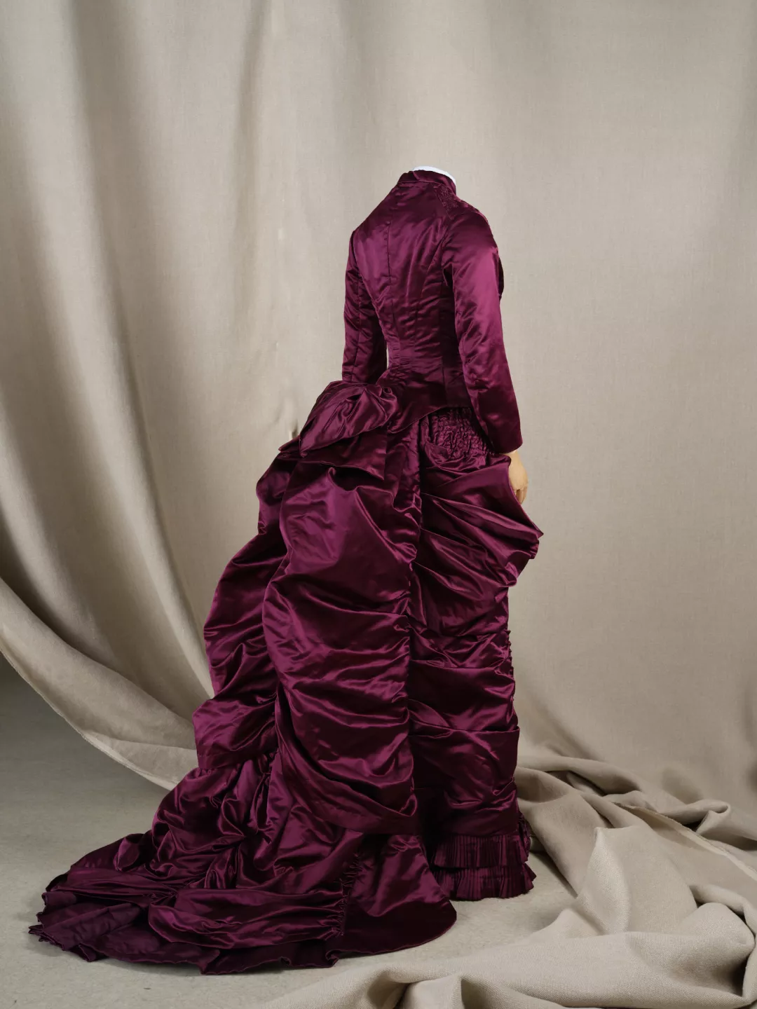 Les journaux détaillent avec une incroyable précision et des mots nouveaux le travail des étoffes aux multiples circonvolutions dont cette robe témoigne. Au fil des pages, les figures adoptées sont décrites dans un langage fleuri : basque ramassée en draperies sur les hanches, jupe plissée en éventail, relevée, retroussée ou coquillée, pouf descendant en gros bouillons jusqu’au bas de la traîne, sous-jupe garnie d’une ruche froncée et déchiquetée ou renversée, doublée ou encore effeuillée… Si le terme « bouffant », employé comme adjectif ou substantif, caractérise la période, le tissu semble avoir une vie propre : il retombe, contourne ou s’échappe. Le passage accéléré des modes semble tout aussi incontrôlable et se traduit par des annonces éloquentes. Les jupons-tournures sont ainsi en pleine déchéance ; les lignes droites l’emportent sur les retroussis de tous genres ; la pèlerine n’existe plus, elle a vécu. La forme écrite de ces métamorphoses, d’une expressivité sans précédent, traduit une époque au goût prononcé pour l’exubérance.