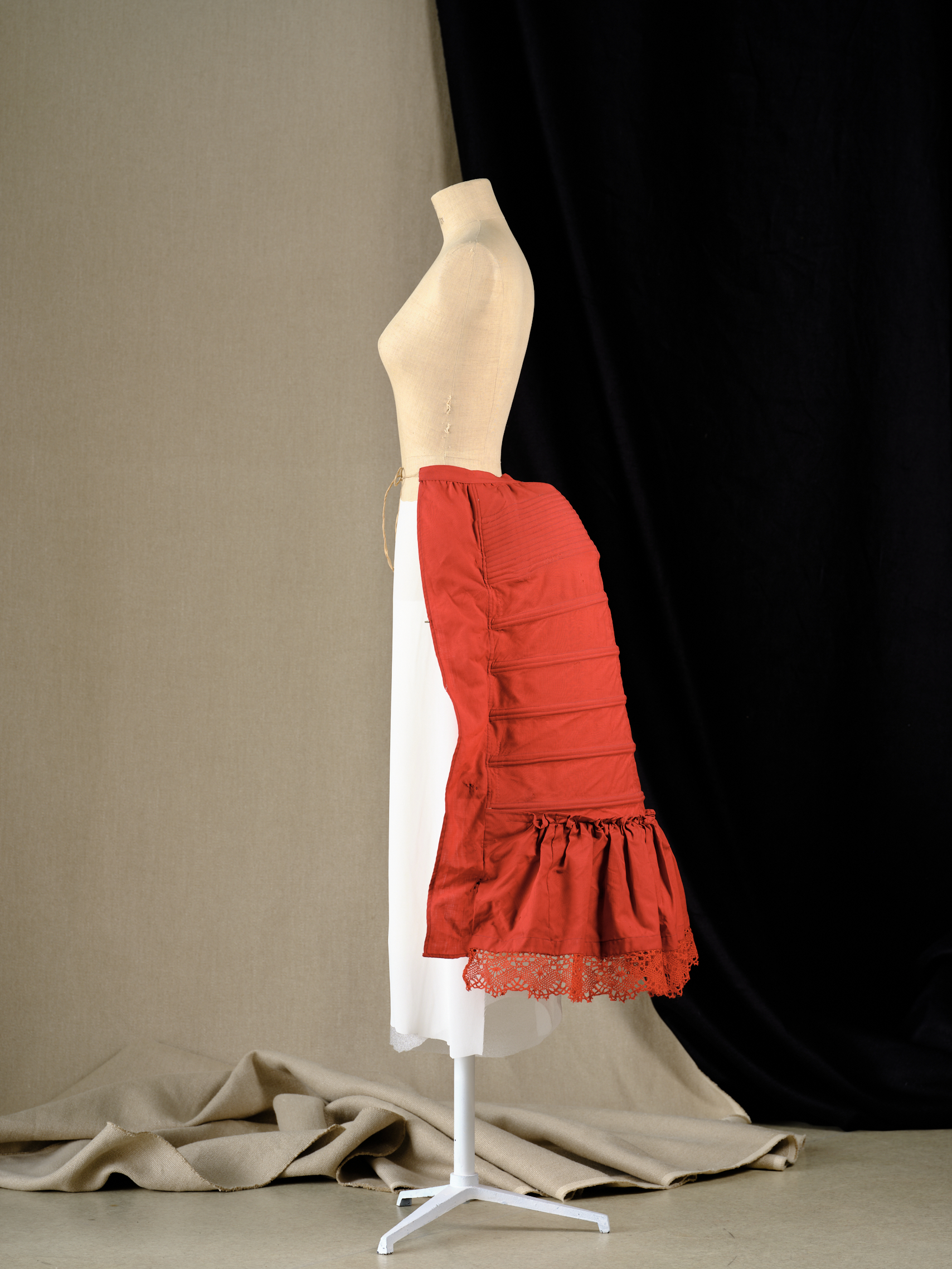 À la fin du second Empire, alors que la crinoline perd de son ampleur, le volume des jupes relevé à l’arrière en drapés bouffants dessine les contours d’une nouvelle silhouette. Pour soutenir ces inflexions inédites et leurs variations, la tournure fait son apparition. Tout d’abord composée d’un simple jupon à volants gradués, placés à l’arrière sous la taille, elle prend ensuite différentes formes, des petits coussins faits de crin ou de varech à des systèmes ingénieux de plus en plus saillants. Dans les années 1880, la tendance atteint son apogée avec un nouvel artifice appelé « queue d’écrevisse ». Ce long appendice articulé, qui évoque la carapace du crustacé, est constitué de tissu armé de baleines plus ou moins espacées. Il est aussi pourvu d’un dispositif – laçage ou patte de serrage – pour en régler le bombé. Sa structure graduée supporte les draperies impérieusement retroussées, qui exaltent la cambrure des reins, et accompagne le mouvement des jupes dans leur déploiement d’étoffe lourd et compliqué. Le rouge est alors à la mode pour les jupons et les tournures, généralement en toile écrue ou blanche, peuvent aussi prendre cette teinte. Vers 1888, on revient à plus de modération : la cambrure paraît soudain comme un non-sens, aussi ridicule que de mauvais goût, le comble de l’élégance revenant aux lignes droites, sans aucun soutien.