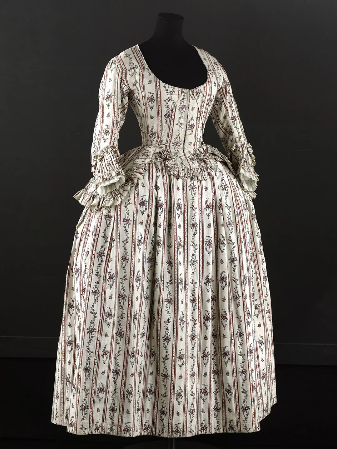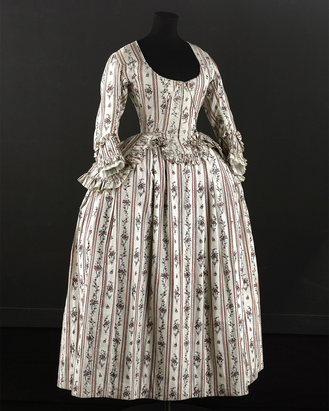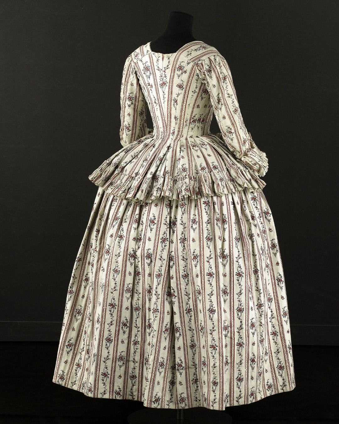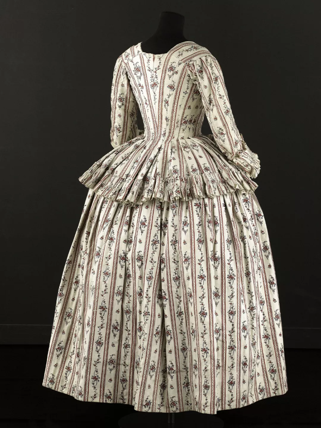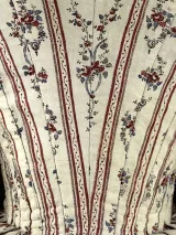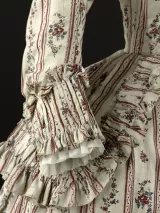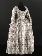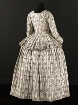 Ensemble composé d'un caraco et d'une jupe. Caraco long et ajusté, encolure ovale, fermé devant par 10 agrafes, 12 maillons, manches trois quarts en forme, bordées d'un falbala volanté, deux coutures obliques au niveau de la poitrine, devant plus court effet de compères, bordé de volant, dos trois outures centrales, celle du centre était baleinée. Jupe d'ensemble, montage plat devant, puis petits plis plats, ouvertures latérales à nouer.