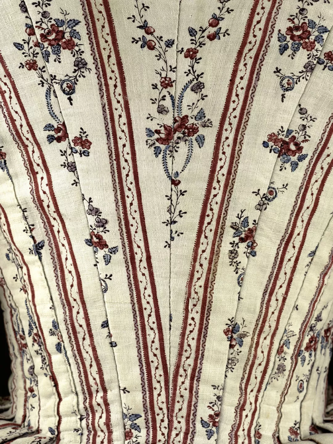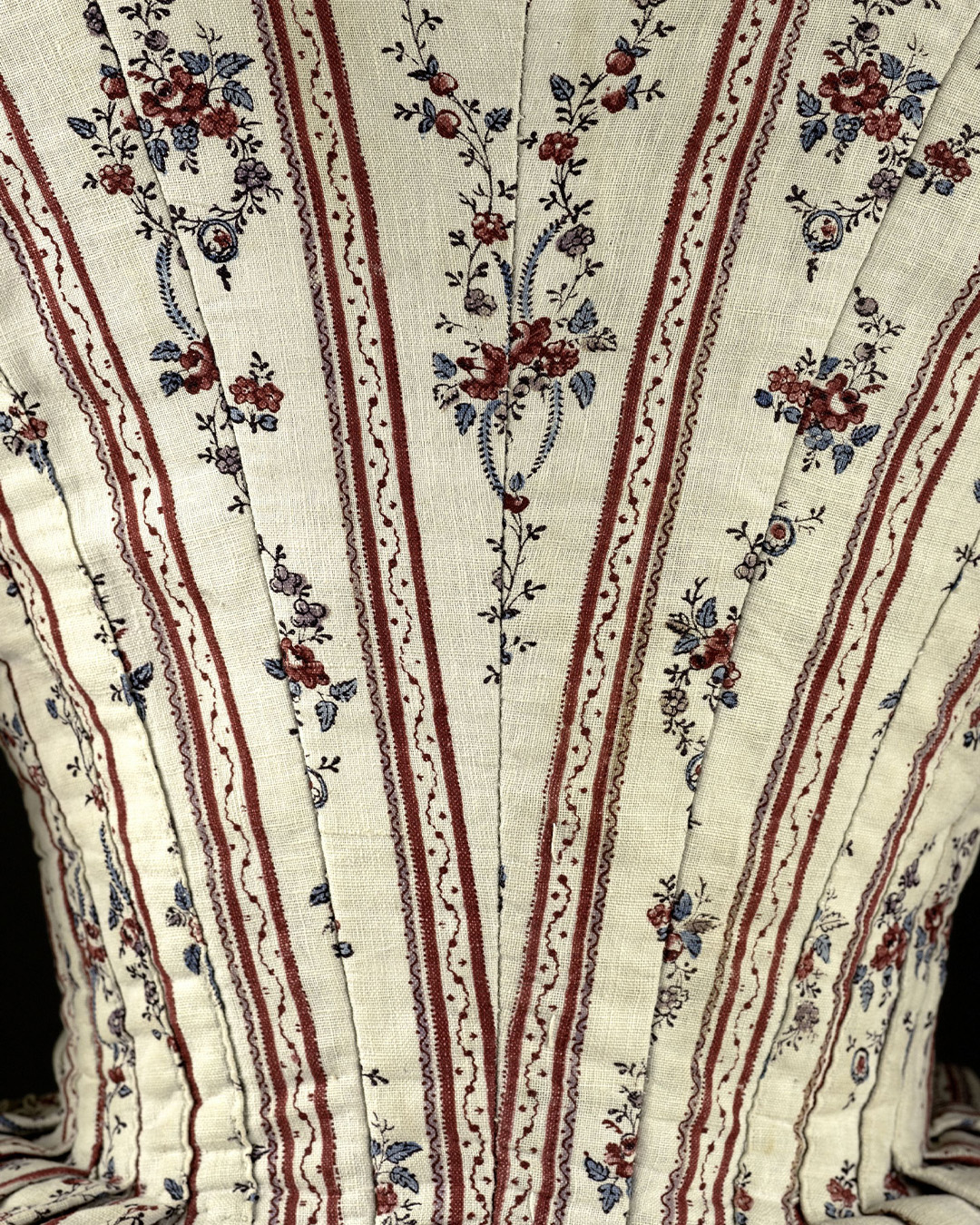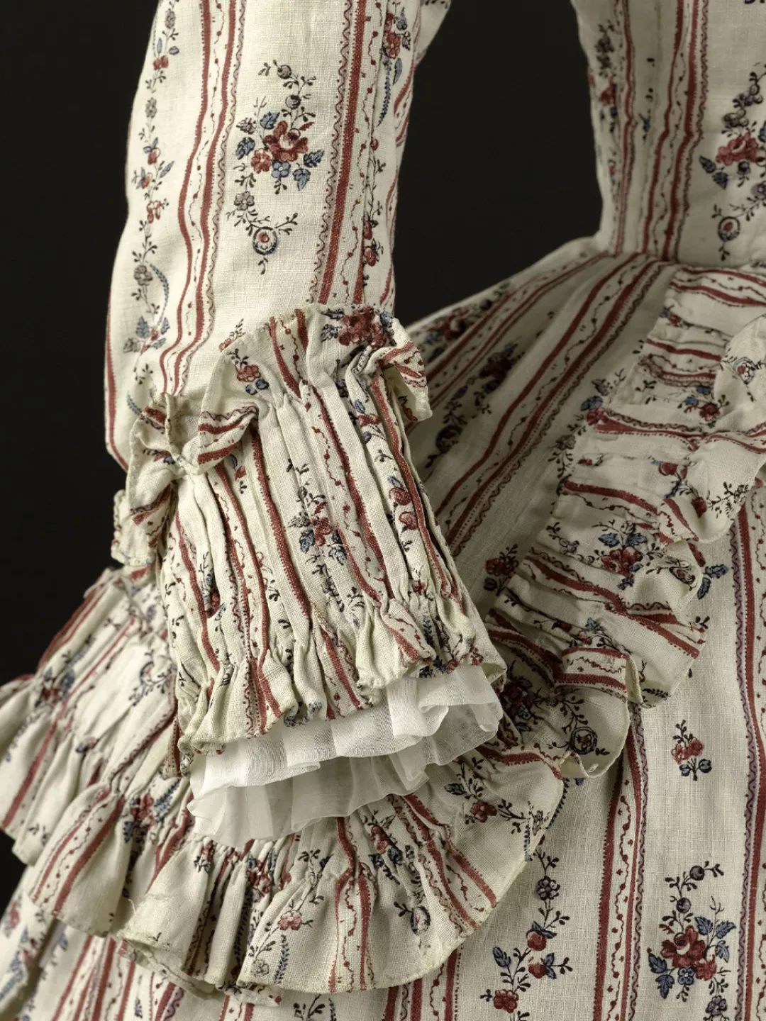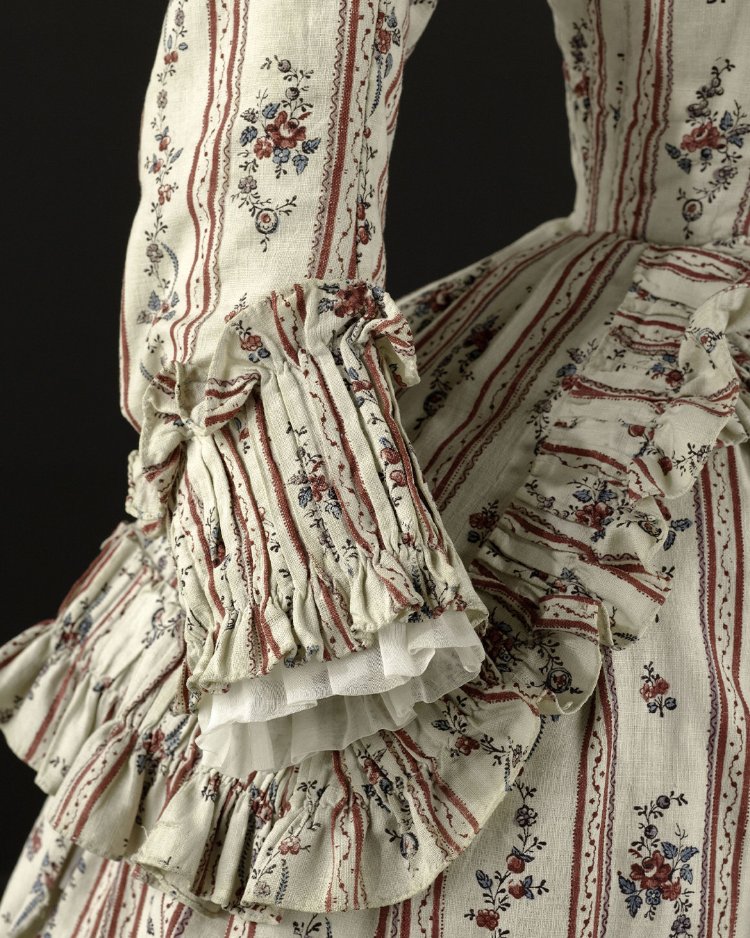 Ensemble composé d'un caraco et d'une jupe. Caraco long et ajusté, encolure ovale, fermé devant par 10 agrafes, 12 maillons, manches trois quarts en forme, bordées d'un falbala volanté, deux coutures obliques au niveau de la poitrine, devant plus court effet de compères, bordé de volant, dos trois outures centrales, celle du centre était baleinée. Jupe d'ensemble, montage plat devant, puis petits plis plats, ouvertures latérales à nouer.