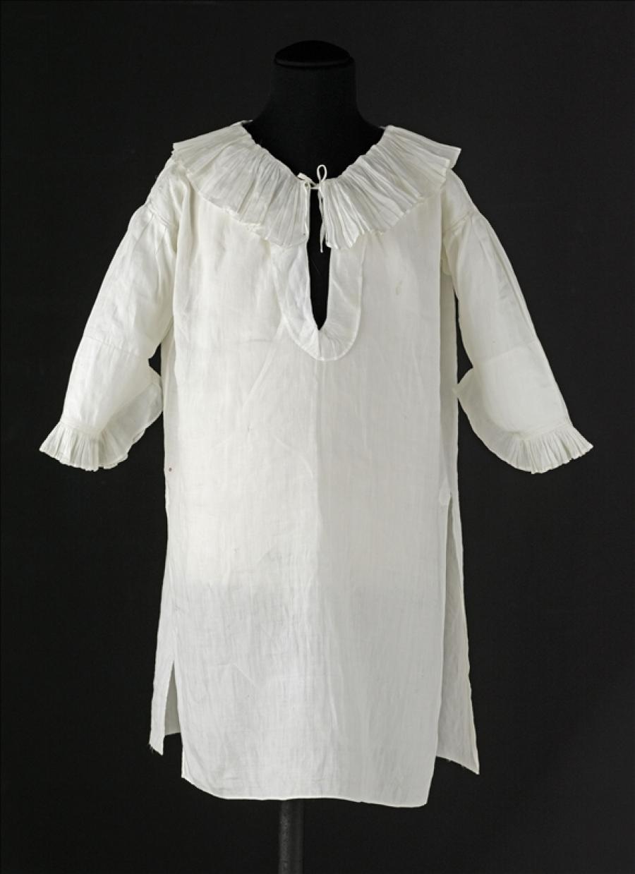 Jusqu’à l’âge de cinq ans, fillettes et garçonnets portent des chemises aux formes semblables à celles des femmes. Passé cet âge, les garçons ont alors droit à deux vêtements masculins, de dessous et de dessus, la chemise et la culotte. La chemise du duc de Normandie est une chemise d’homme : encolure arrondie ouverte et volantée, forme droite et non évasée, fentes latérales au bas de la chemise, manches longues, ici boutonnées. Elle est coupée dans une toile de lin très fine de grande qualité. Les coutures particulièrement soignées sont proches de celles d’un corsage qui aurait appartenu à la reine Marie-Antoinette, lui aussi conservé à Galliera. La chemise est marquée d’une petite couronne brodée au point de croix, en fils de soie rouge, placée sur l’un de ses côtés.