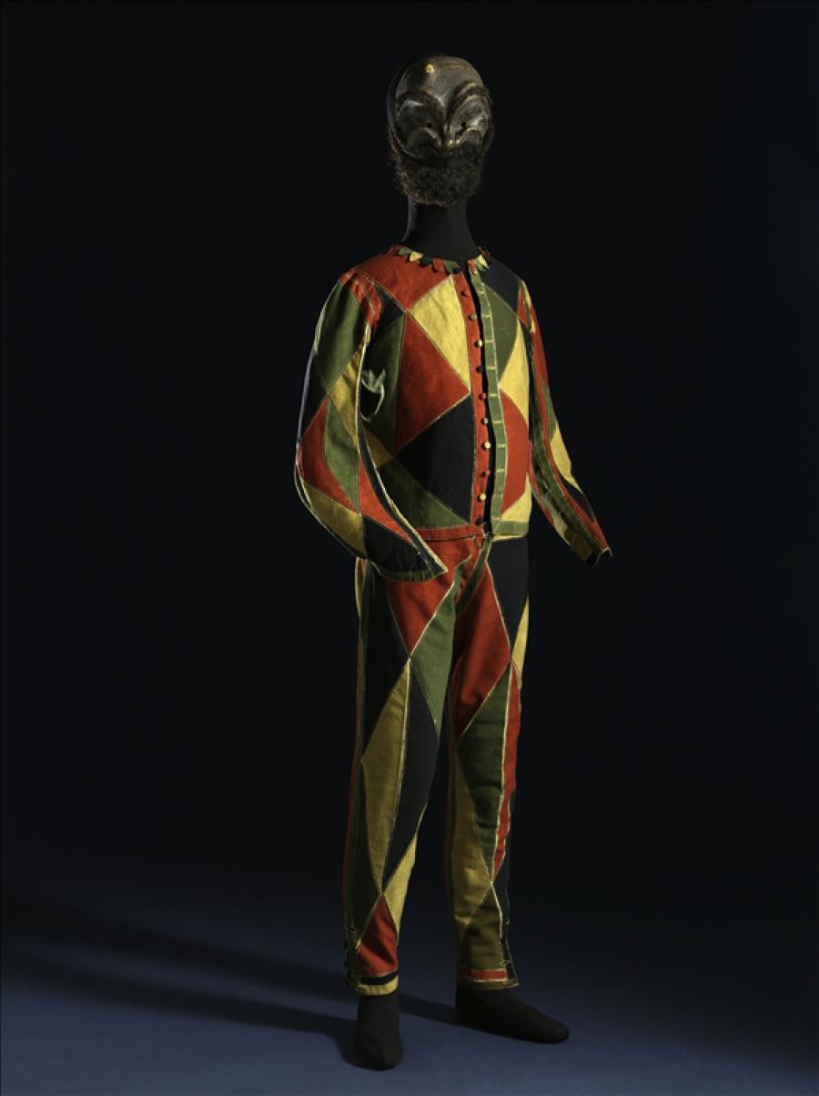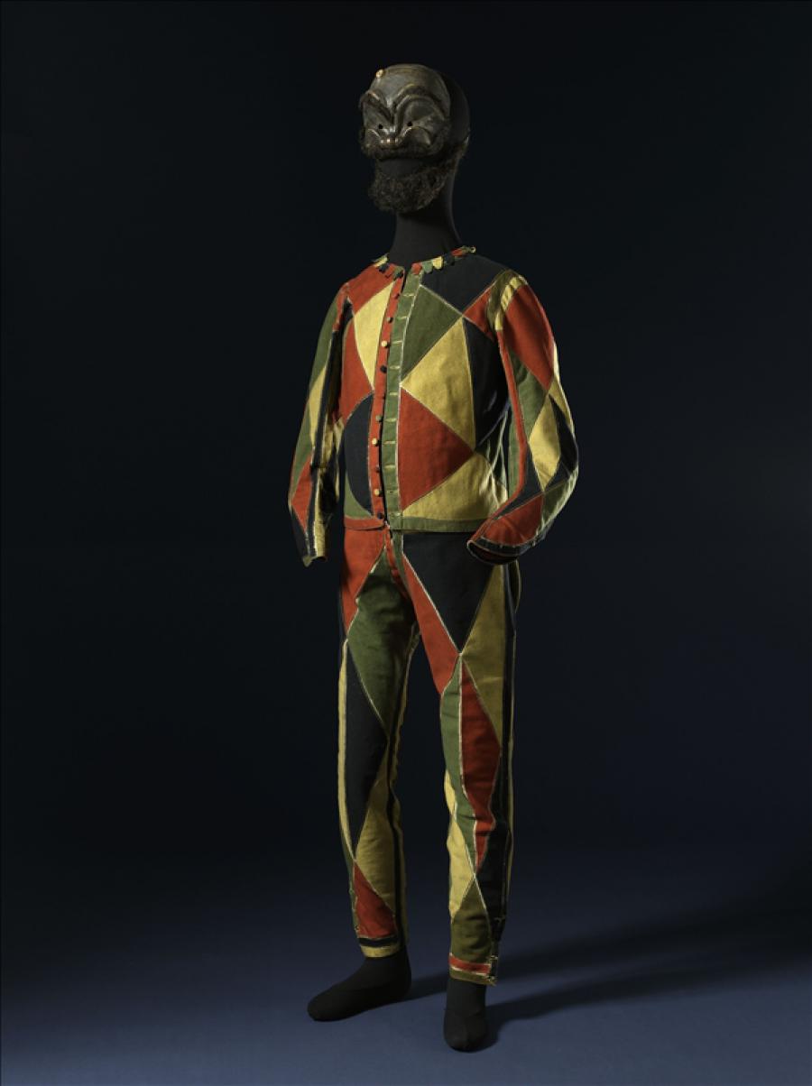 - Matériaux et techniques : Veste et pantalon : draps de laine bleu foncé, rouge, vert, jaune, toile de lin naturel, boutons en bois recouverts d’étoffe. Masque : cuir brun. Barbe : crin brun.