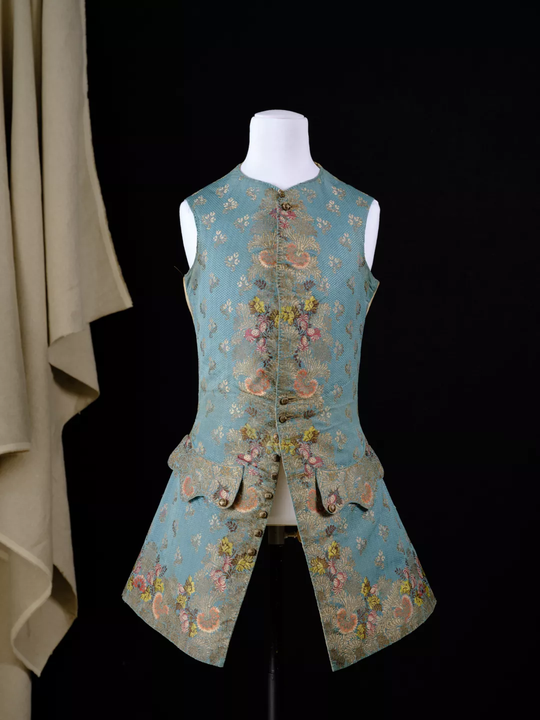 Ce vêtement porté sous l’habit masculin, mais dévoilé par l’ouverture frontale de ce dernier, en épouse la forme. D’abord à longues basques terminées en pointe, il raccourcit au fil des années pour s’arrêter aux hanches dans les années 1790. Il est alors coupé droit. Son décor, souvent façonné dans la première moitié du siècle et brodé dans la seconde moitié, est dû à l’habileté des dessinateurs qui, dans leurs maquettes préparatoires, combinent fleurs des champs, plantes exotiques, éléments d’architecture, scènes à personnages campagnards ou exotiques, et empruntent à l’actualité sociale, telle la reproduction de ballons aérostatiques, ou littéraire, en particulier théâtrale.