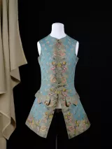 - Matériaux et techniques : Devants en gros de Tours liseré broché, fils de soie polychromes et fils d’argent doré ; dos et doublure en taffetas de soie bleu et de soie blanc ; boutons de bois recouverts de filé et de paillons d’argent doré ; décor tissé à disposition
