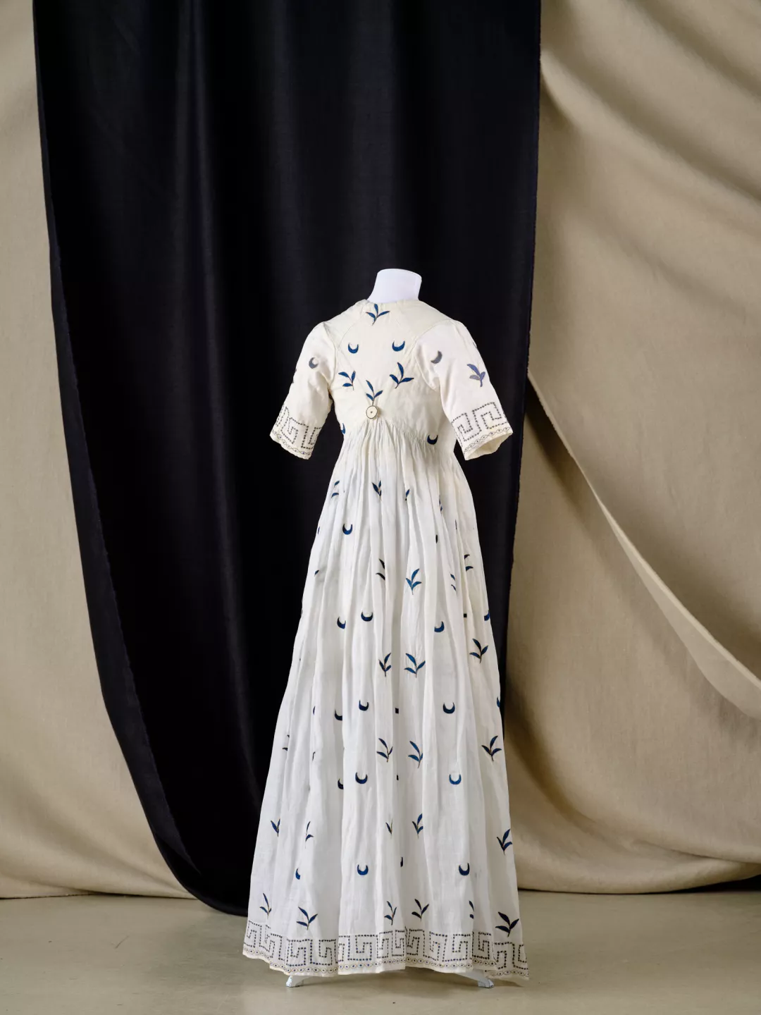 - Matériaux et techniques : Toile de coton fine (mousseline) ; doublure en toile de coton blanc ; broderies au point de chaînette, fils de coton bleus, filés d’argent doré