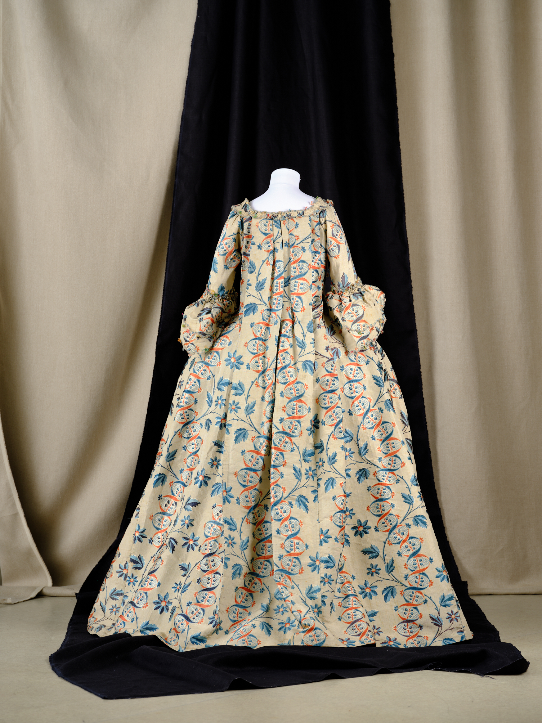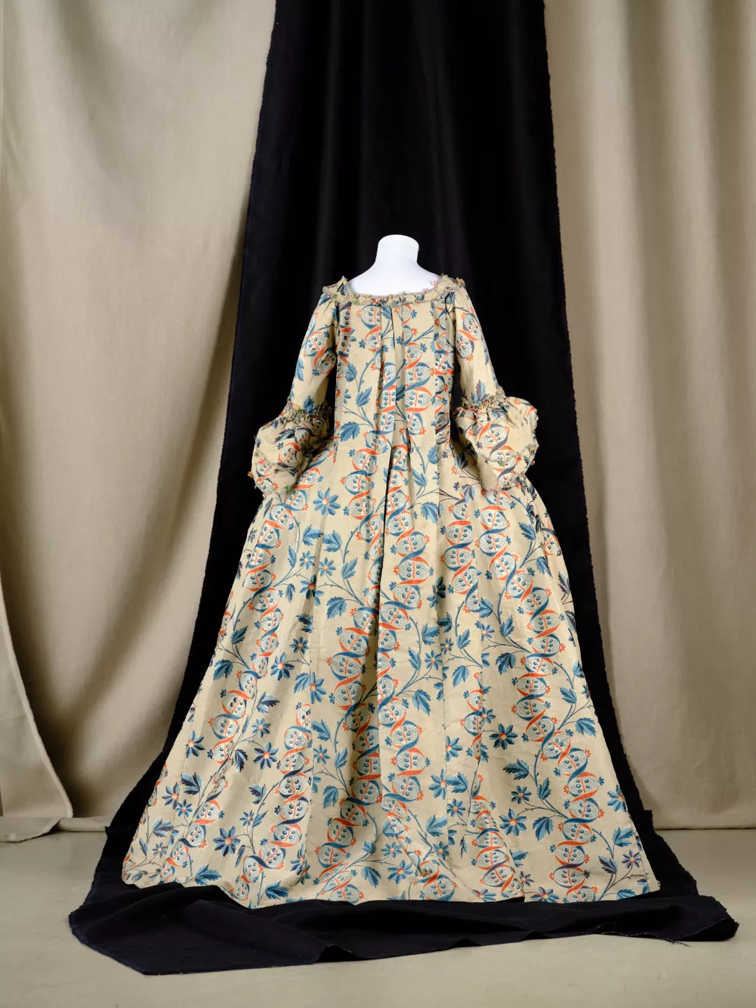 « Avant l’année 1675 […] les tailleurs faisaient généralement tous habits d’hommes & de femmes ; mais dans cette année Louis XIV jugea à propos de donner à des femmes le droit d’habiller leur sexe. » La robe dite à la française, caractérisée par les doubles plis plats qui animent son dos, est emblématique de l’élégance féminine du siècle des Lumières. Elle se rattache à une catégorie de vêtements féminins devenus à la mode à la fin du XVIIe siècle, tels des déshabillés ou des négligés d’intérieur évadés de la sphère intime, ce qui lui vaut le nom de robe de chambre ou de manteau dans les sources du milieu du XVIIIe siècle, même si sa silhouette épouse plus étroitement le buste féminin que ses ancêtres.