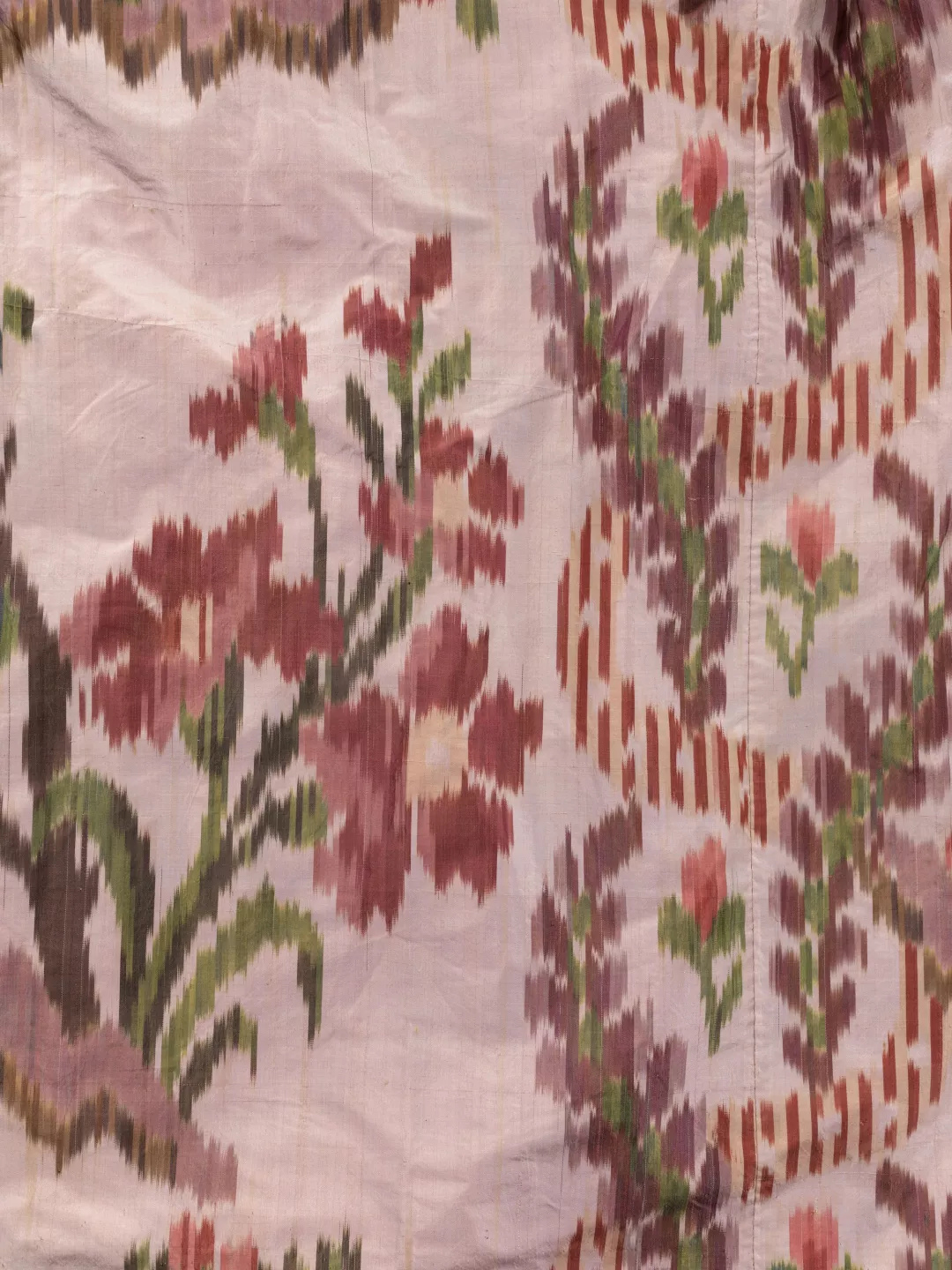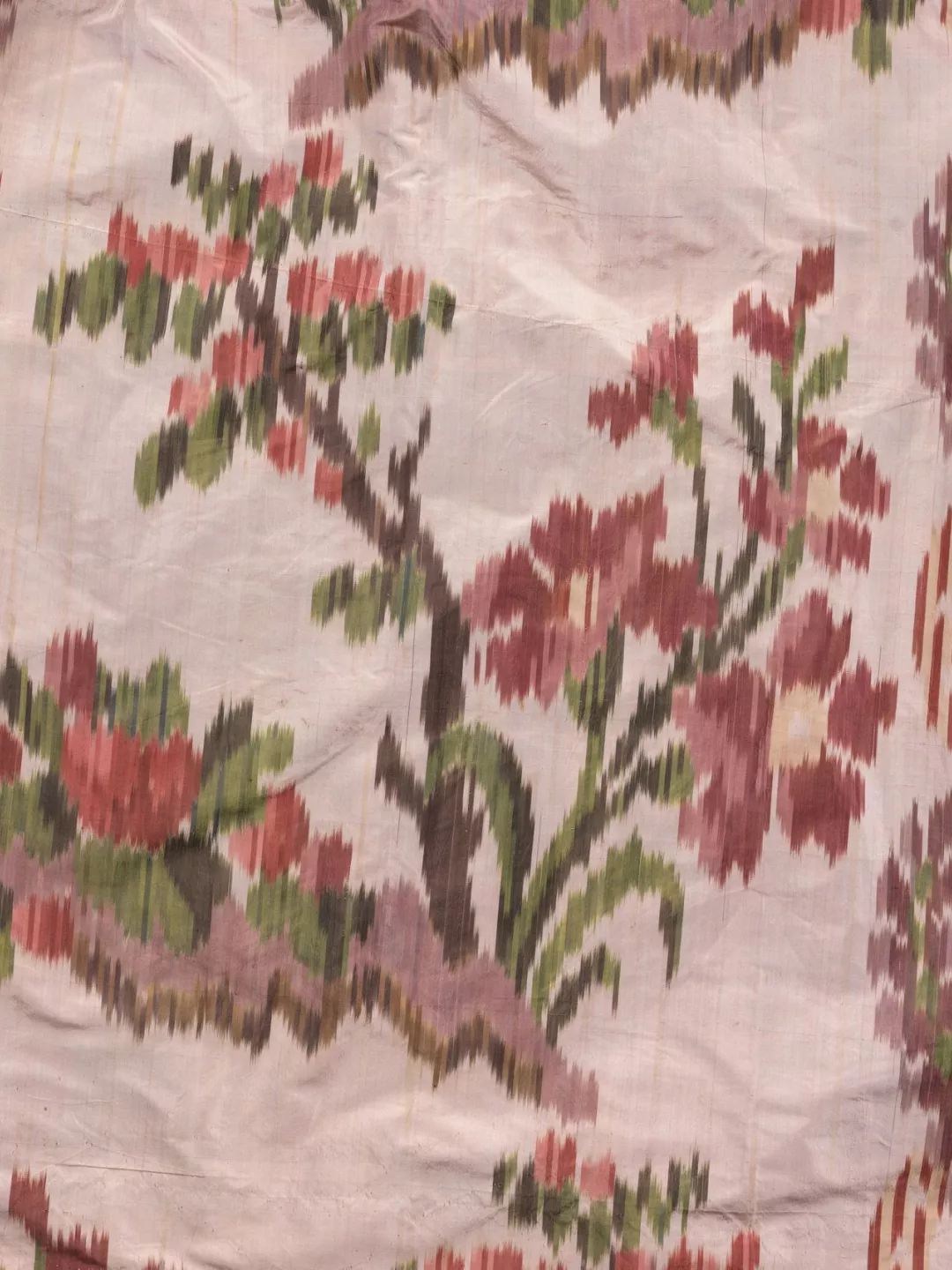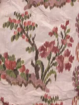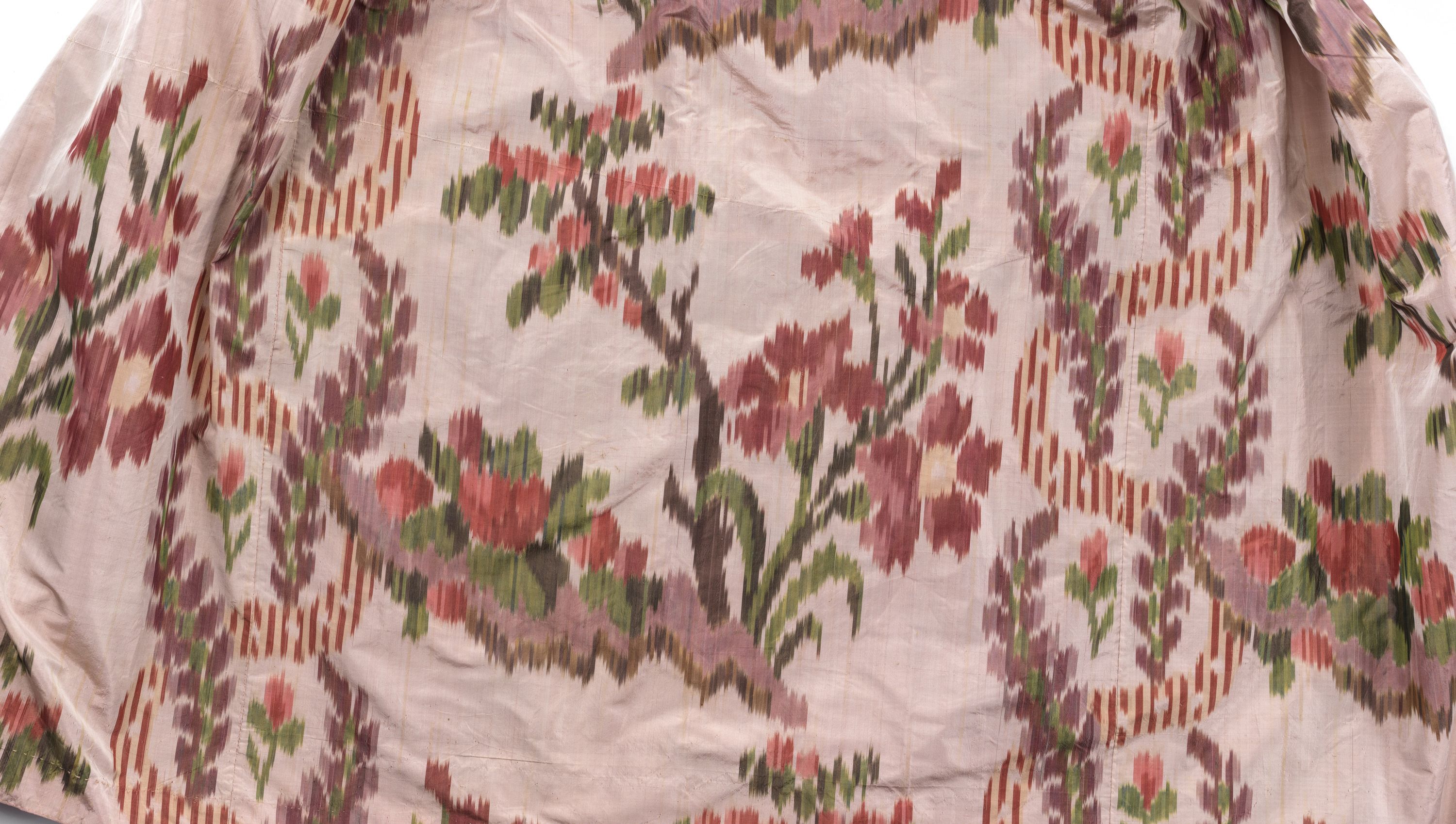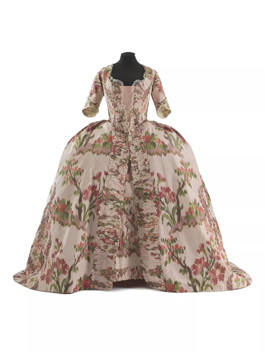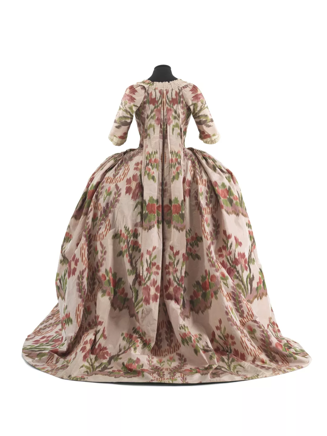 Cette robe à la française se singularise par son textile, un taffetas chiné à grands motifs. Il s'agit d'un modèle qui reste peu fréquent dans les collections publiques.
