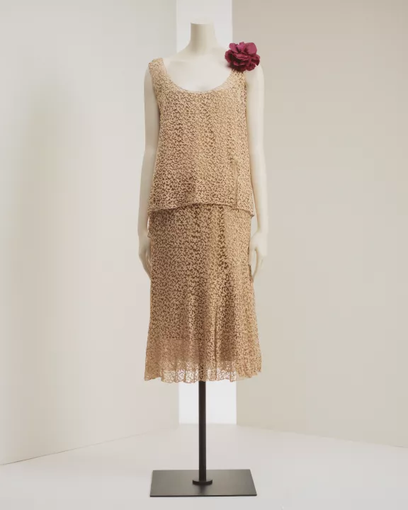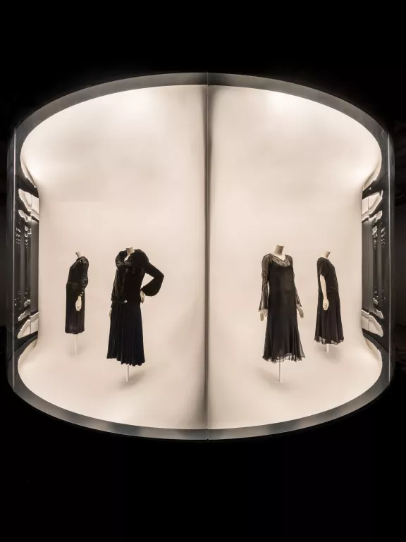 The second part of the exhibition presents a selection of models dated from the 1950s to the last collection created by Mademoiselle in 1971. This selection shows how by returning to couture in 1954 and, against the trend, she reaffirmed her fashion manifesto. A focus dedicated to the famous braided tweed suit, to the two-tone pumps and to the 2.55 quilted bag, allows us to decipher the CHANEL codes. The costume and fine jewellery presented with lamé suits, in contrast with the sobriety of her clothes, recall her art in the handling of paradoxes. The exhibition ends with a selection of models and two films presenting the last collections created by Gabrielle Chanel, showing the consistency with which she pursued and adapted her proposals. Faithful to her own style and positioning herself at odds with the fashion of her time, she was resolutely avant-garde: «One could say that Chanel barely or never varies her line but this is precisely her strength», reports Vogue Paris in April 1921.