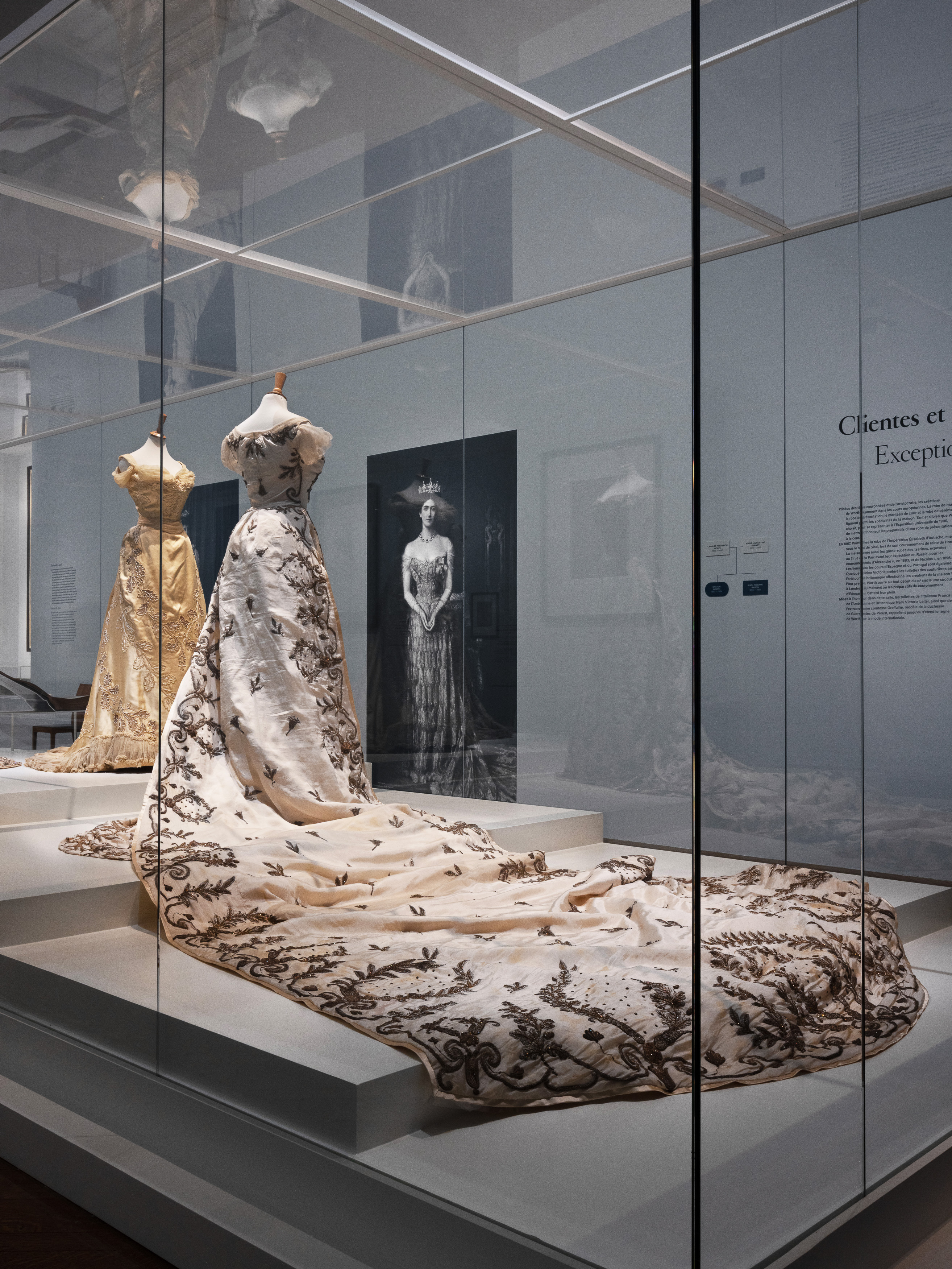 L’exposition présente plus de 400 pièces, dont près de 80 vêtements à la fois issus de la collection du Palais Galliera et de prêts exceptionnels provenant d’institutions internationales dont le Philadelphia Museum of Art, le Metropolitan Museum of Art, le museum of the City of New York, le Victoria and Albert Museum et le Palazzo Pitti ainsi que de nombreuses collections privées. Le parcours dévoile des tenues de jour, manteaux d’Opéra, des tea gowns et des robes de bal, autrefois portées par des personnalités prestigieuses et fortunées. Prisées des têtes couronnées et de l’aristocratie, les créations de Worth rayonnent dans les cours européennes. Parmi sa clientèle, la maison compte Élisabeth d’Autriche, plus connue sous le nom de Sissi, à qui elle livre en 1867 sa robe de couronnement de reine de Hongrie, lady Curzon ou la comtesse Greffulhe, modèle de la duchesse de Guermantes de Marcel Proust.