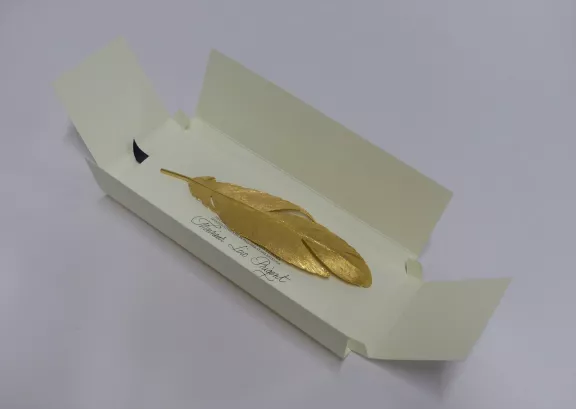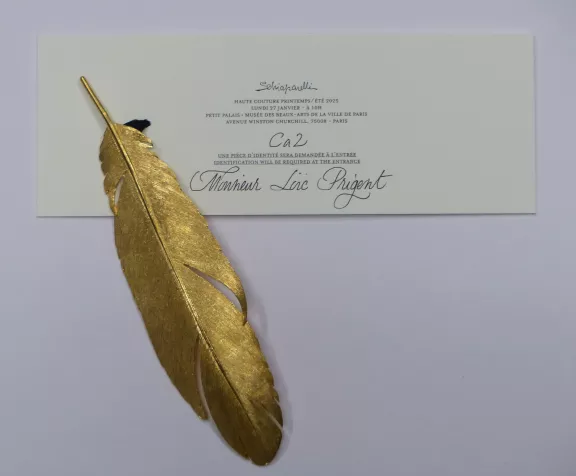 Offrir une plume dorée en guise d’invitation envoyait un véritable message, étant à la fois une référence à la collection et aux multiples plumes qui habillent les tenues, autant qu’une référence au nom et à celui du mythe antique éponyme. Cette plume en métal doré est attachée par un ruban de soie à un véritable carton d’invitation mentionnant les informations relatives au défilé, le tout protégé dans un étui cartonné, adressé à l’invité.