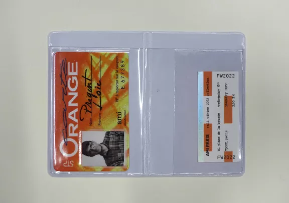 Ces derniers ont reçu un porte-carte blanc orné de l’emblème de la maison AMI, contenant une carte Orange personnalisée, titre de transport d’Île-de-France vendu et utilisé de 1975 à 2005, sur laquelle figure la photo de l’invité, son nom et prénom. L’étui contient également le ticket magnétique sur lequel sont indiquées les informations relatives au défilé : la date, l’adresse, la saison, et le nom de la maison.