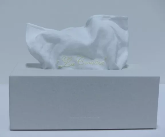 Pour sa collection printemps-été 2025, la maison française a transmis à ses invités une boîte à mouchoir griffée Jacquemus, de laquelle il fallait tirer trois mouchoirs en tissu brodé pour découvrir le nom de la collection, la date et l’adresse du défilé. Mais pourquoi une boîte à mouchoir ? Accessoires aujourd’hui destinés à soulager les signes d’une émotion, peut-être la maison a-t-elle souhaité stimuler l’émoi de ses invités au travers de cette collection qui cherchait à revisiter, avec modernité, les codes des années 1950, âge d’or de la couture parisienne.
