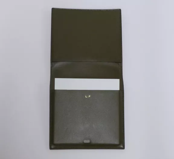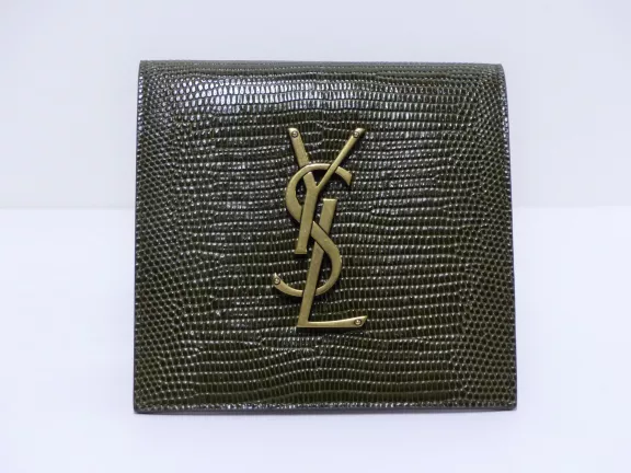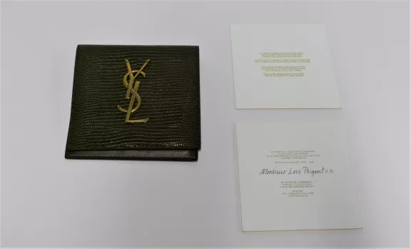 En janvier 2025, la maison Saint Laurent a envoyé les invitations glissées dans un étui en lézard vert, orné du monogramme en métal doré. L’intérieur révèle la personnalisation du portefeuille avec les initiales de l’invité.