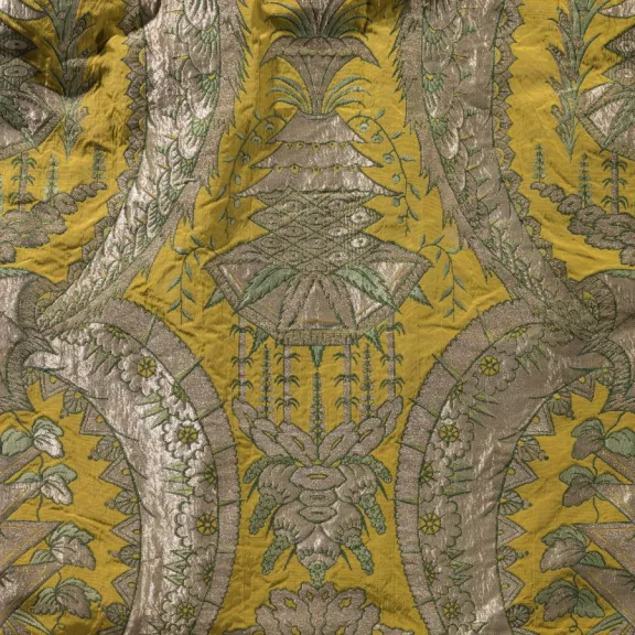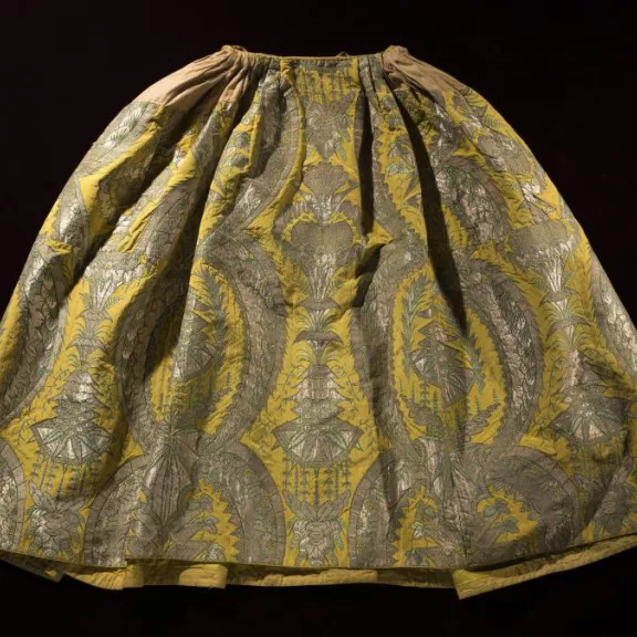 Cette robe appartient à la famille des robes de chambre à la forme souple et enveloppante très à la mode dans les années 1739-1740. Ces vêtements féminins d’extérieur sont désignés par diverses dénominations, “déshabillé” ou encore “robe volante” quand ils sont coupés dans un taffetas léger dit “volant”. Leur mode résulte du succès des robes de chambre d’intérieur, dans la seconde moitié du XVIIe et au début du XVIIIe siècle, développé à la faveur des importations de ces vêtements d’intimité en soieries ou en toiles peintes par la compagnie des Indes orientales françaises.