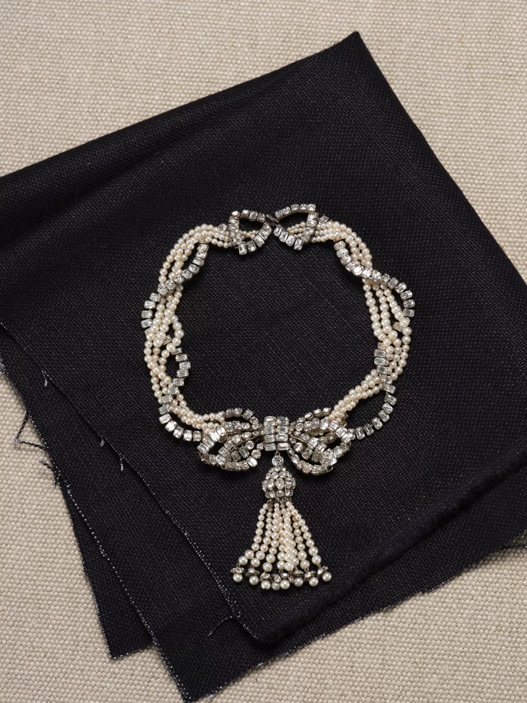 Les pièces conservées par le musée mettent l’accent sur sa collaboration pro-lifique avec Christian Dior et Jacques Fath. Pour ces derniers, il imagine des bijoux historicisants, souvent inspirés du XVIIIe siècle et réalisés en strass, à l’exemple de ce collier à motif de nœud et gland de passementerie évoquant le style Louis XV. Contrairement à d’autres paruriers, Scémama n’est pas un simple fournisseur anonyme, dans l’ombre d’un couturier. Son nom apparaît au même titre que celui des maisons pour lesquelles il travaille – véritable reconnaissance de son art. Ainsi, dans les pages de L’Officiel de la mode et de la couture de Paris daté de jan-vier 1954, la mention « “Pincebas” créé par Roger Scémama pour les bas Jacques Fath » prouve la place du parurier dans l’univers de la couture.